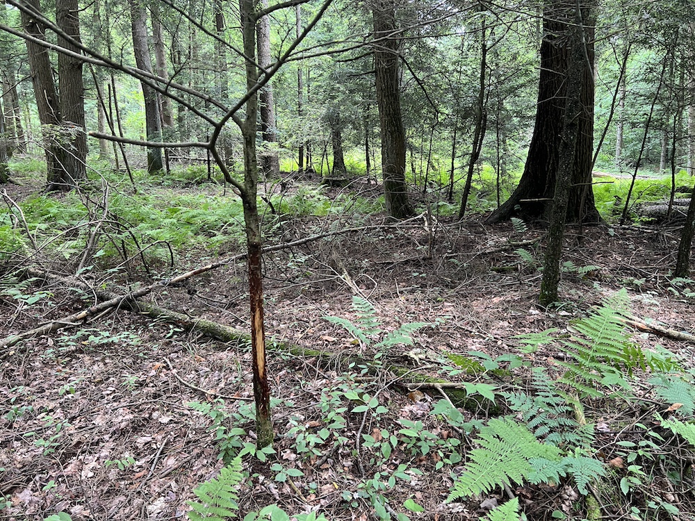 From a hunting perspective, this property truly shines. The understory is thick with young hemlocks, providing excellent thermal cover and security for whitetails throughout the season. Deer sign is abundant and obvious - heavily used trails weave through the timber, buck rubs are numerous and the overall layout screams consistent deer movement. This is the kind of property where you can clearly see how deer use the terrain, making stand placement both effective and predictable.