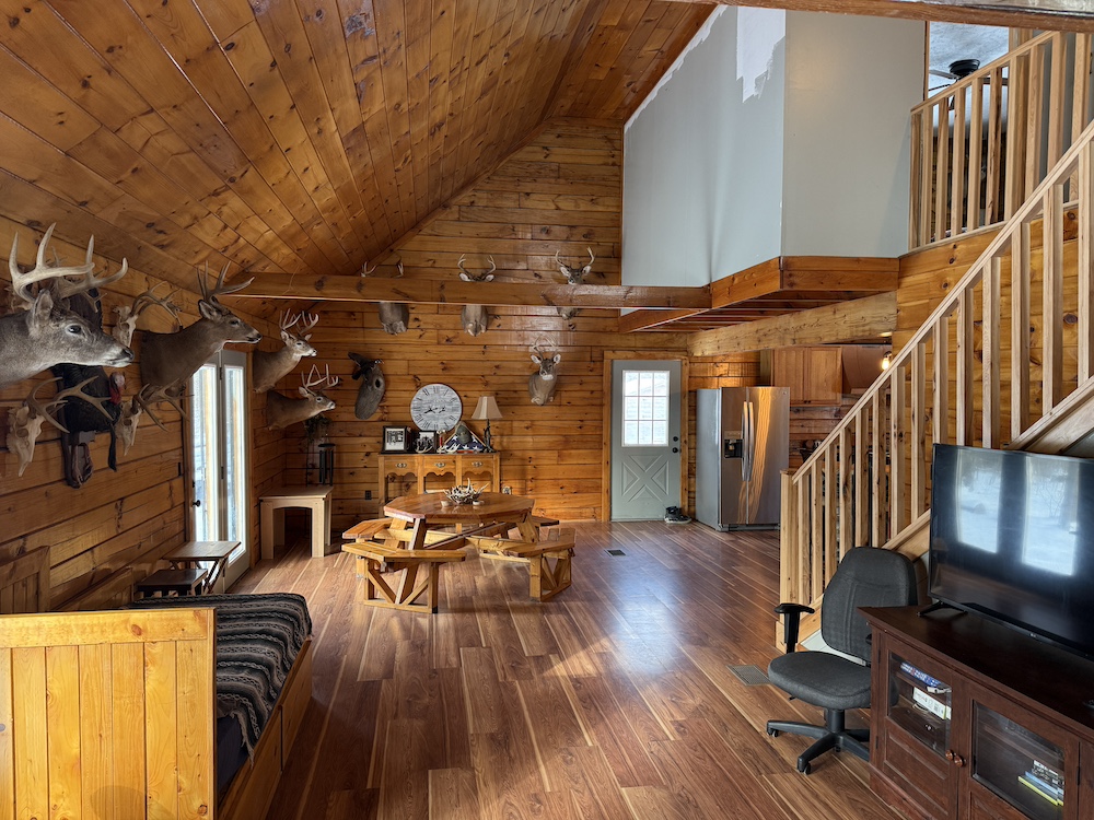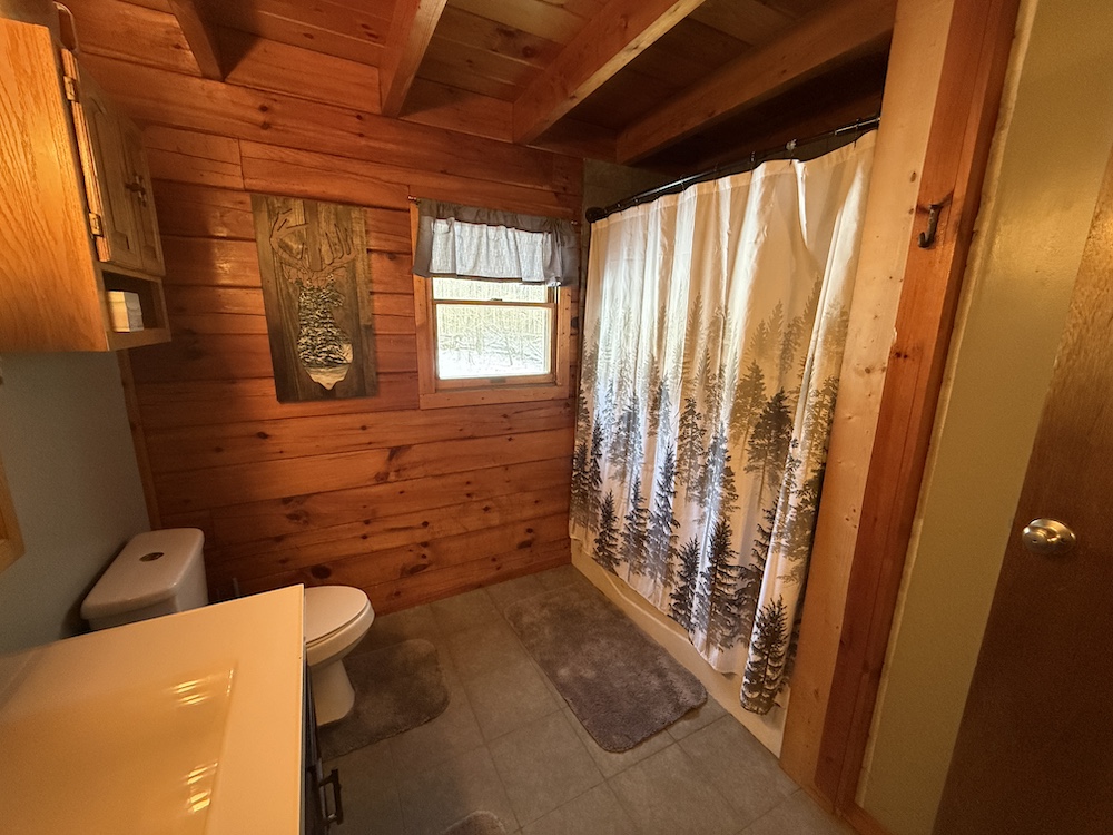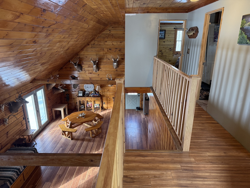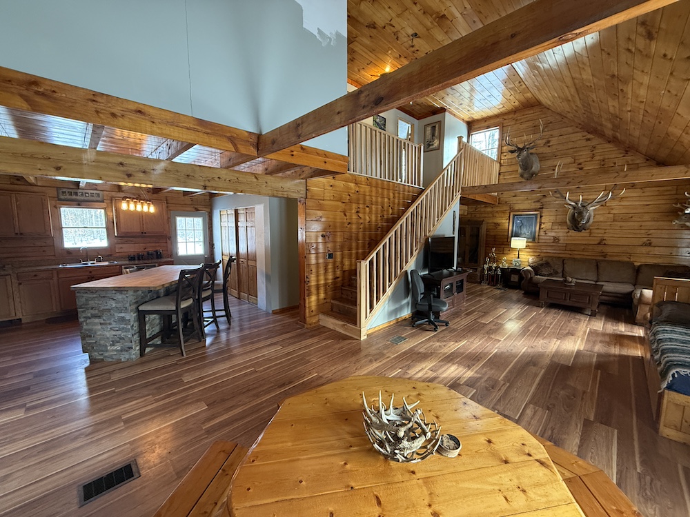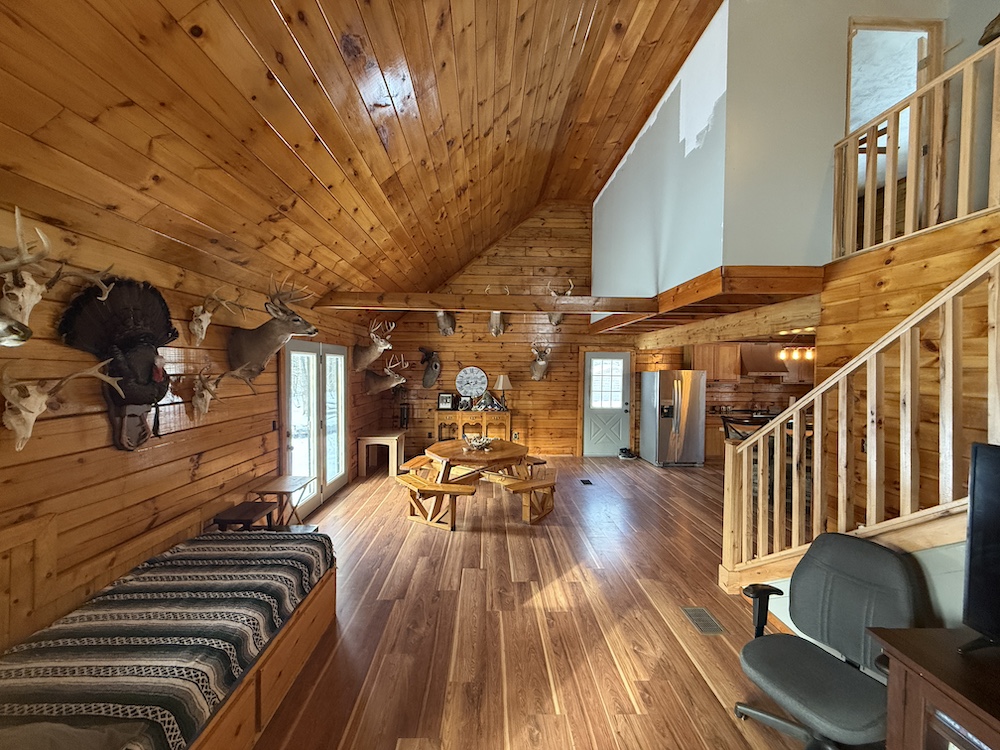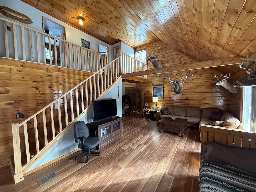 This rustic log cabin would make a solid full-time residence or a seasonal hunting camp and family retreat. The interior features exposed wood throughout, vaulted ceilings and a straightforward open layout that delivers a true cabin atmosphere. The natural wood finish and open living space create a warm, functional setting that fits the property well. The island-style kitchen is open to the main living and entertaining area, with good natural light throughout. The main level includes a small bedroom with a closet and a full bathroom.