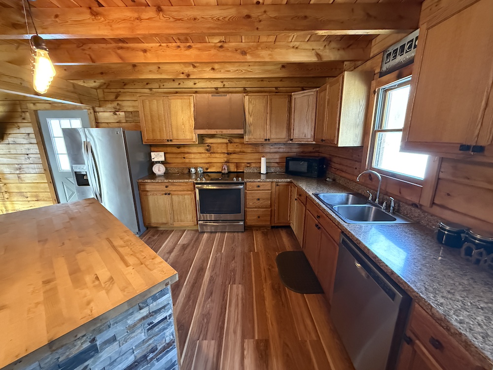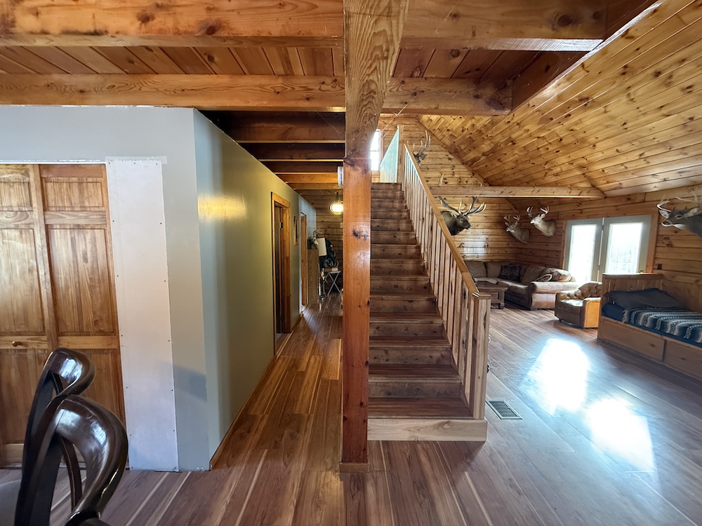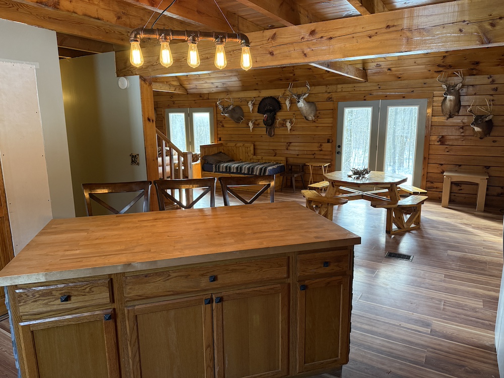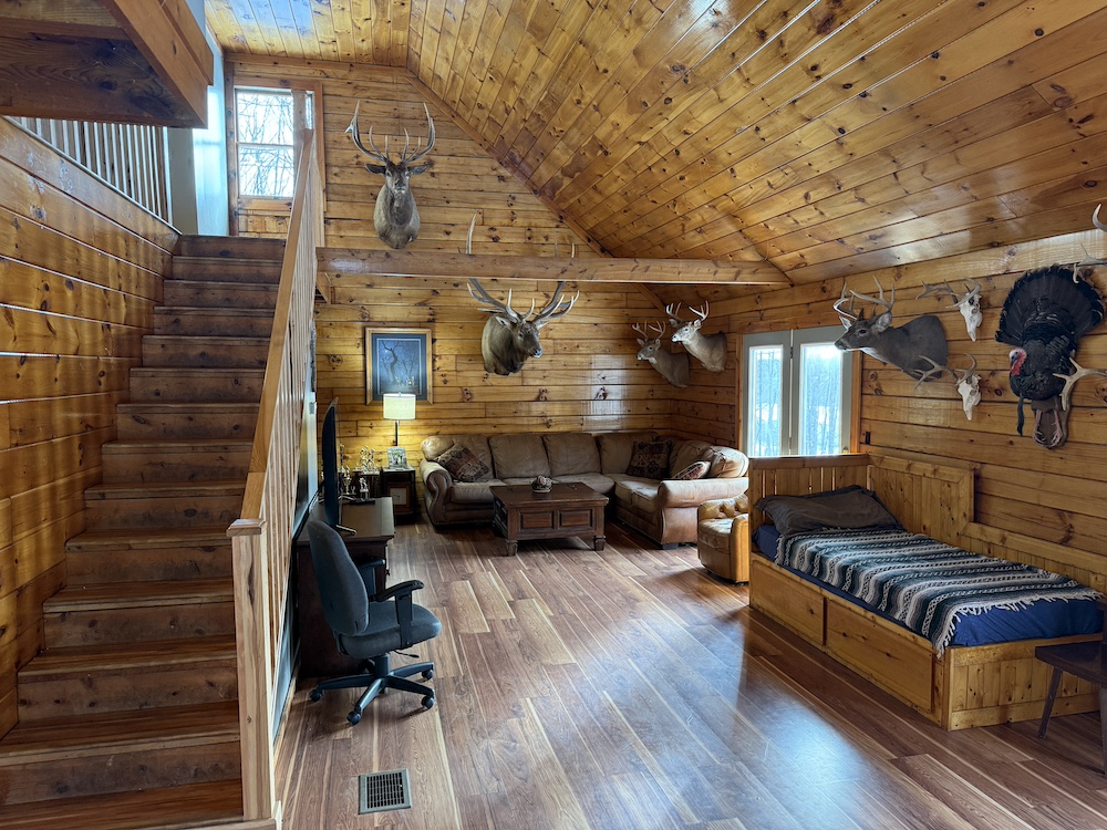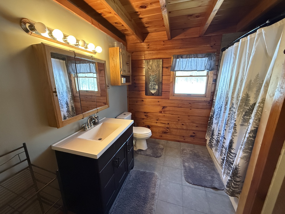 This rustic log cabin would make a solid full-time residence or a seasonal hunting camp and family retreat. The interior features exposed wood throughout, vaulted ceilings and a straightforward open layout that delivers a true cabin atmosphere. The natural wood finish and open living space create a warm, functional setting that fits the property well. The island-style kitchen is open to the main living and entertaining area, with good natural light throughout. The main level includes a small bedroom with a closet and a full bathroom.