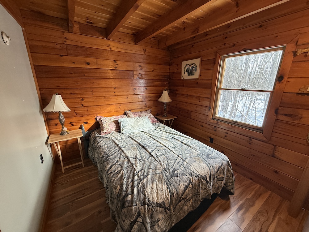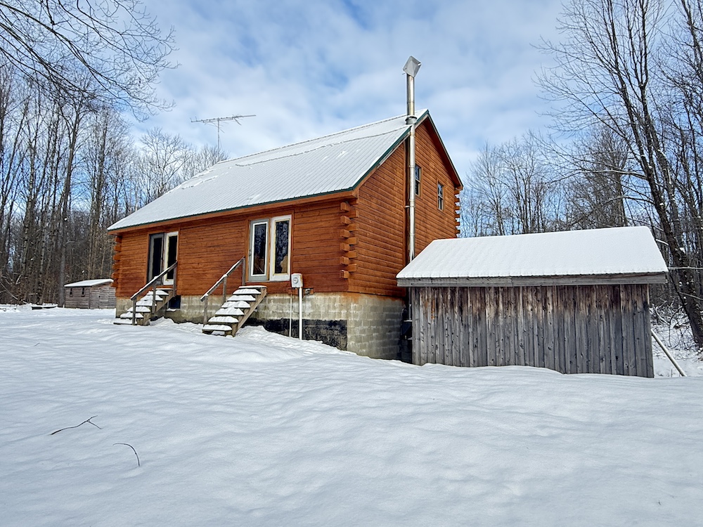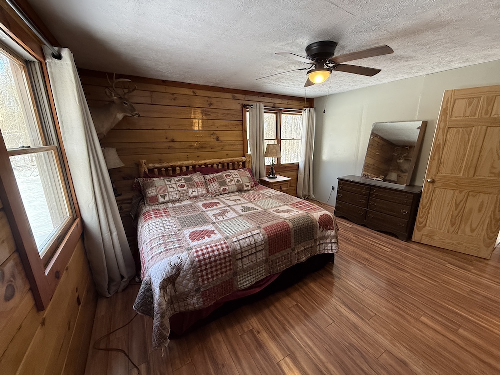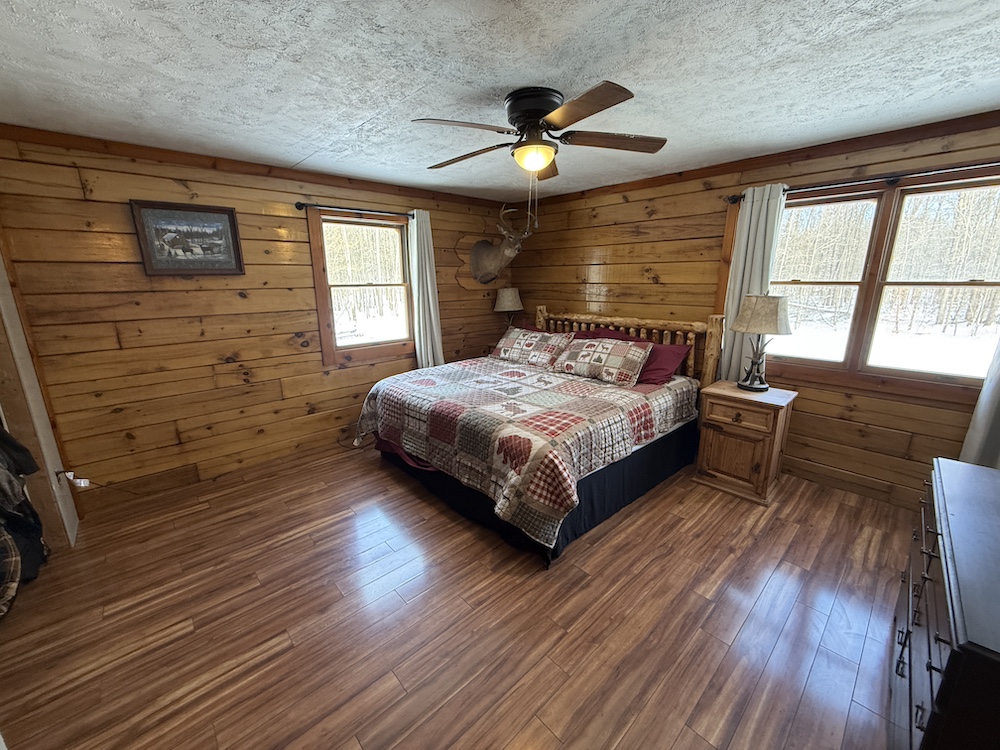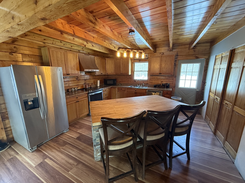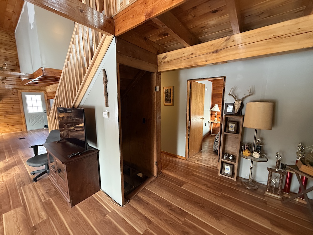 This rustic log cabin would make a solid full-time residence or a seasonal hunting camp and family retreat. The interior features exposed wood throughout, vaulted ceilings and a straightforward open layout that delivers a true cabin atmosphere. The natural wood finish and open living space create a warm, functional setting that fits the property well. The island-style kitchen is open to the main living and entertaining area, with good natural light throughout. The main level includes a small bedroom with a closet and a full bathroom.