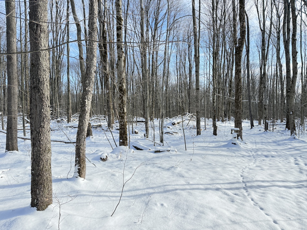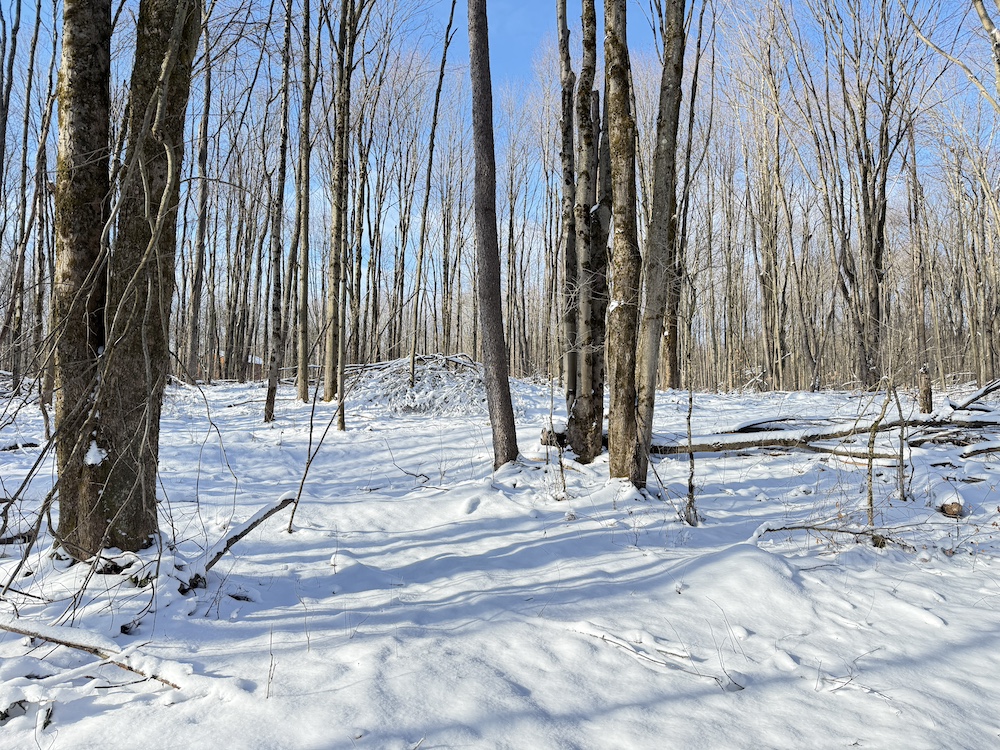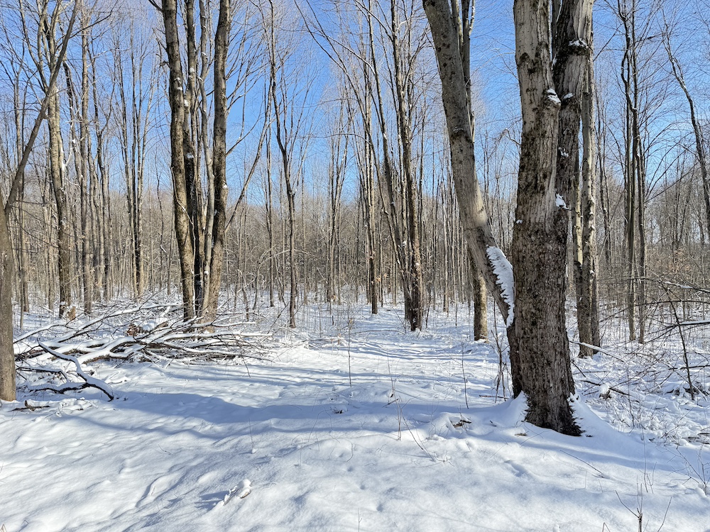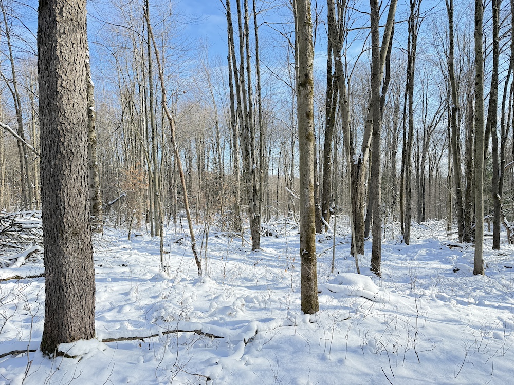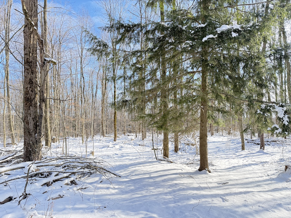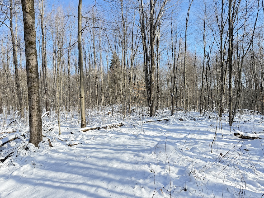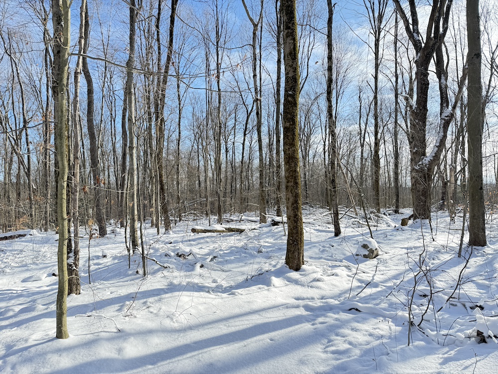 - Wooded acreage of young hardwoods with scattered hemlocks providing thermal cover