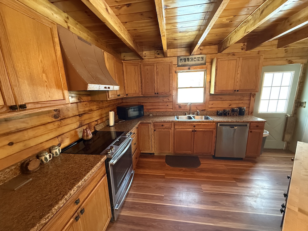 - Rustic log cabin with wood interior, vaulted ceilings and open-concept living area