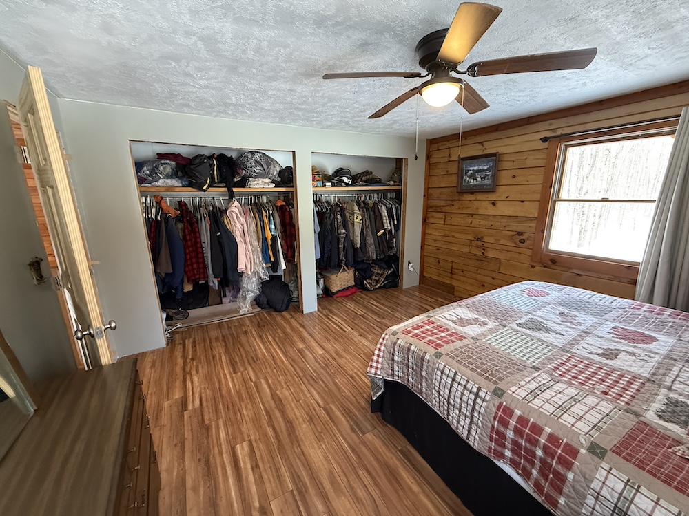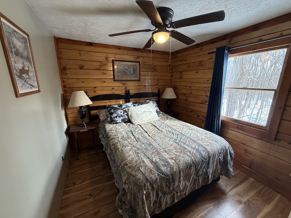 Upstairs, a balcony-style hallway leads to three additional bedrooms. The large primary bedroom at the end of the hall offers added privacy and includes two large closets. The cabin also features a full basement with an additional ½ bathroom, providing extra storage or future living space.
