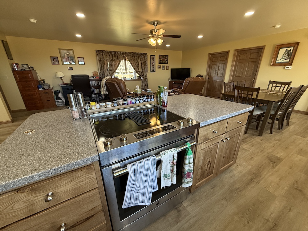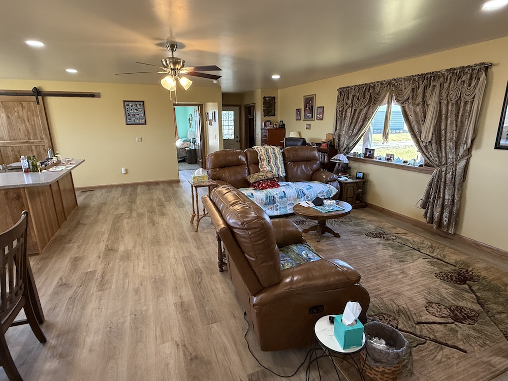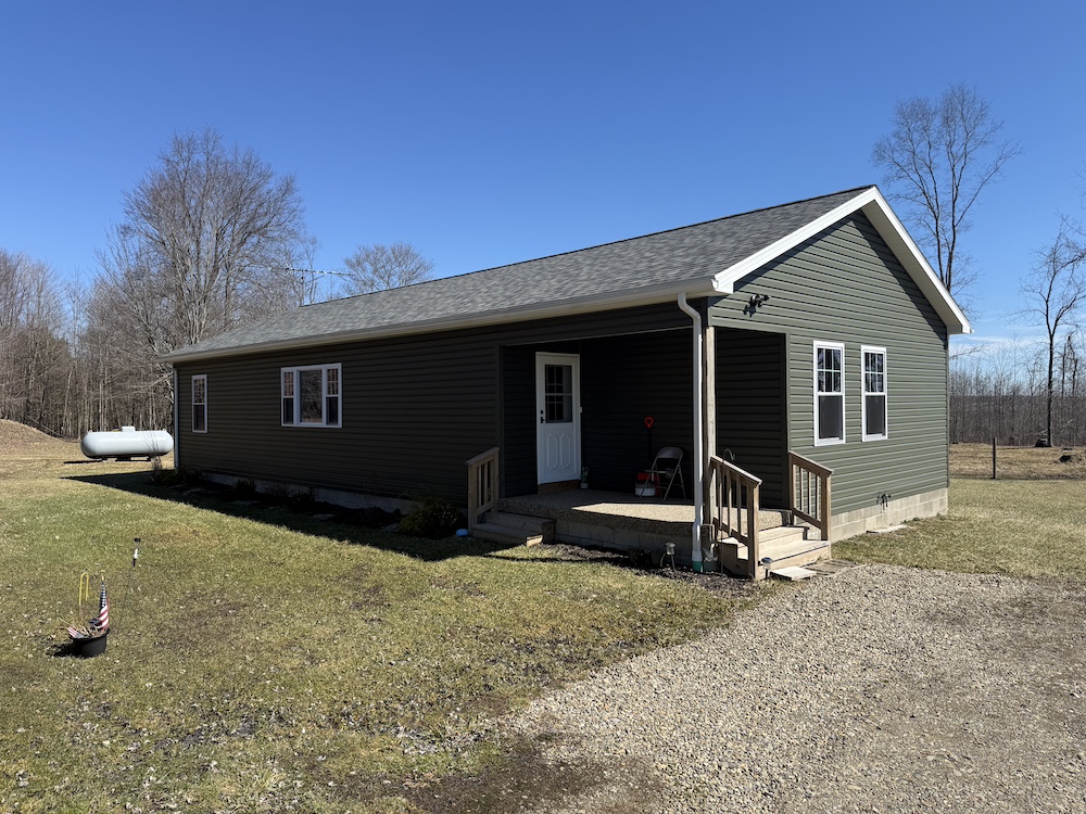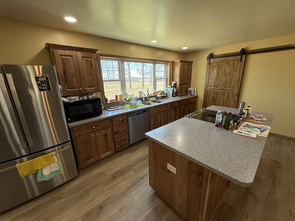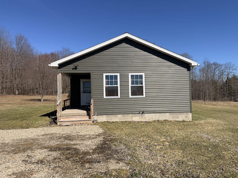 The home includes three bedrooms and two full bathrooms with the kitchen, dining, and living areas connected in an open design. The kitchen includes quality finishes with a vented stovetop and oven, solid surface countertops, ample cabinet space and a nearby pantry. The open design allows the kitchen to remain connected to the main living area while still providing an efficient workspace. The primary bedroom features its own private bath. The rear deck extends from the home and provides a place to enjoy views of the surrounding rural landscape and pastures.