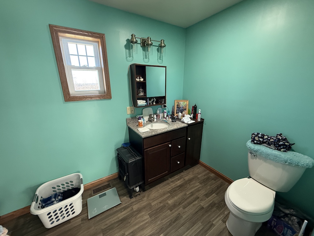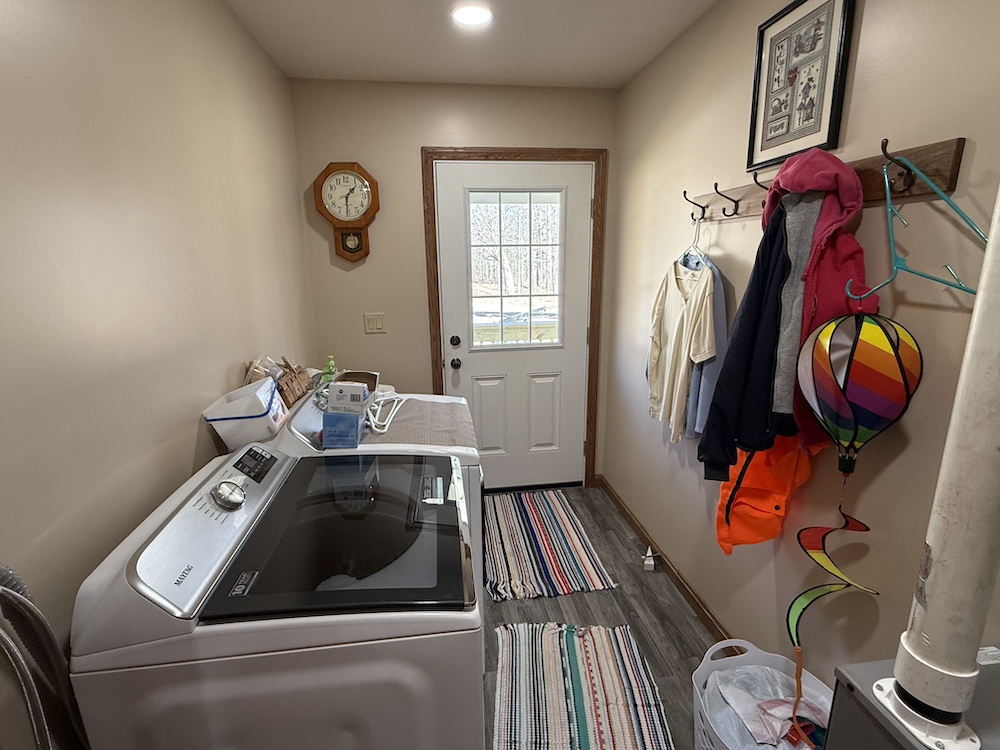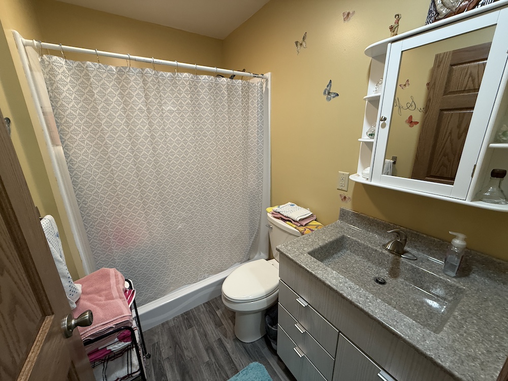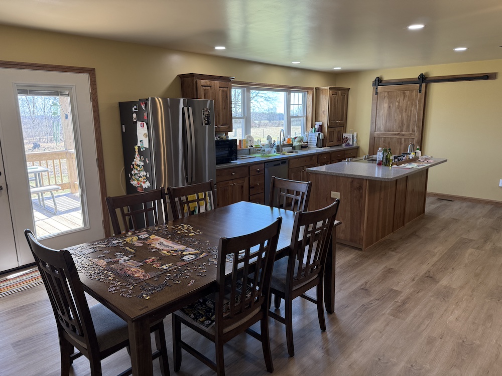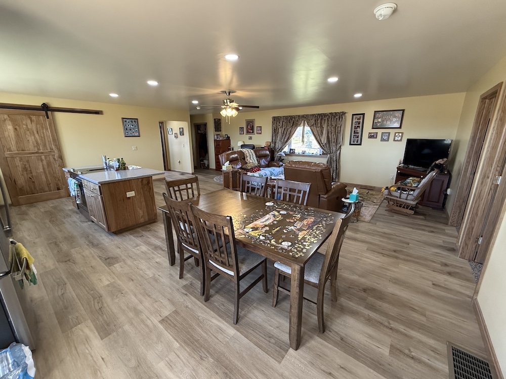 The home includes three bedrooms and two full bathrooms with the kitchen, dining, and living areas connected in an open design. The kitchen includes quality finishes with a vented stovetop and oven, solid surface countertops, ample cabinet space and a nearby pantry. The open design allows the kitchen to remain connected to the main living area while still providing an efficient workspace. The primary bedroom features its own private bath. The rear deck extends from the home and provides a place to enjoy views of the surrounding rural landscape and pastures.