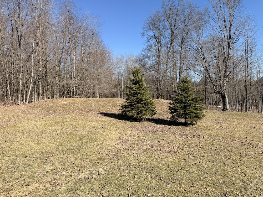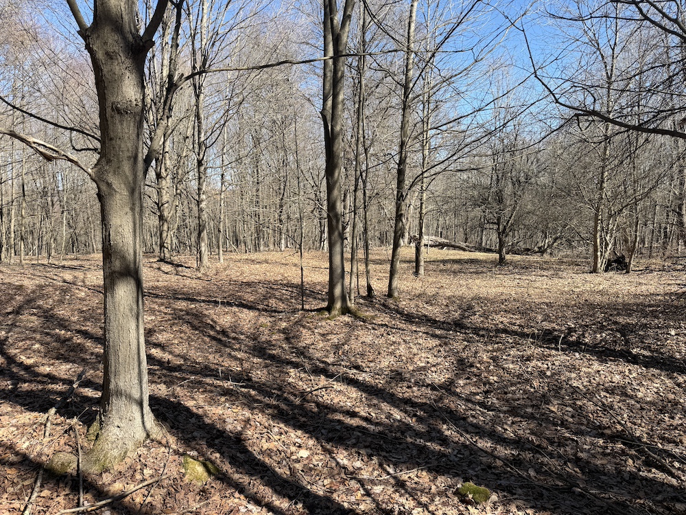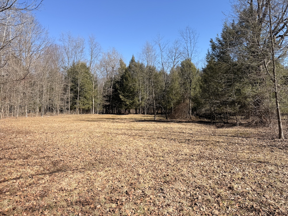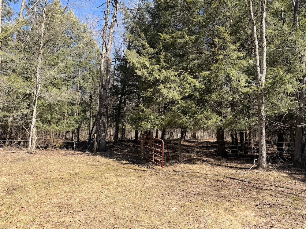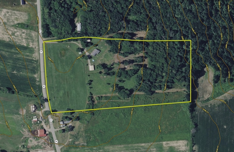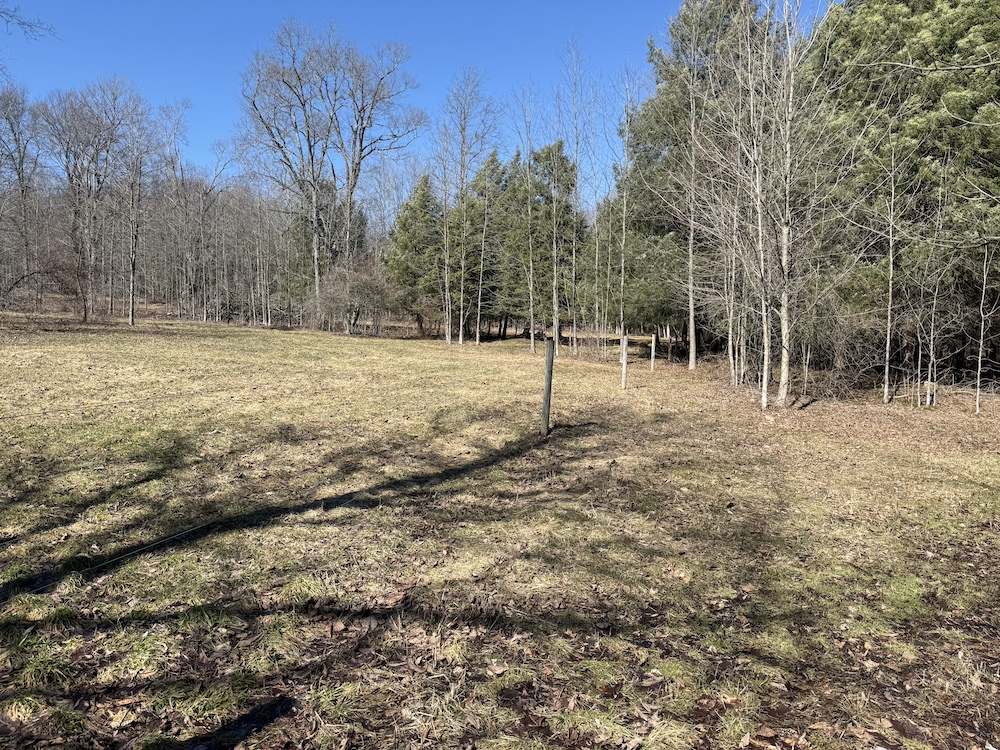 The land includes a combination of pasture, open ground and lightly wooded acreage. A portion of the property is currently maintained as pasture, while a small hay field is located along the road frontage.