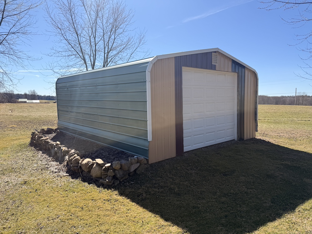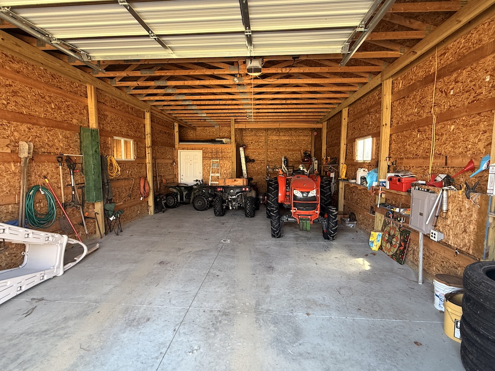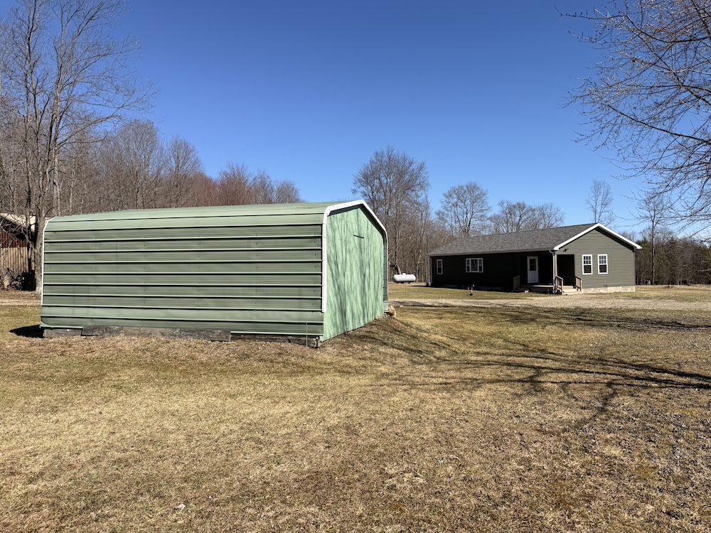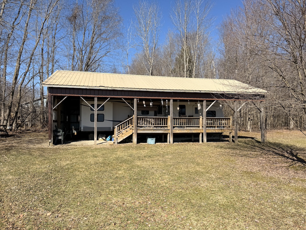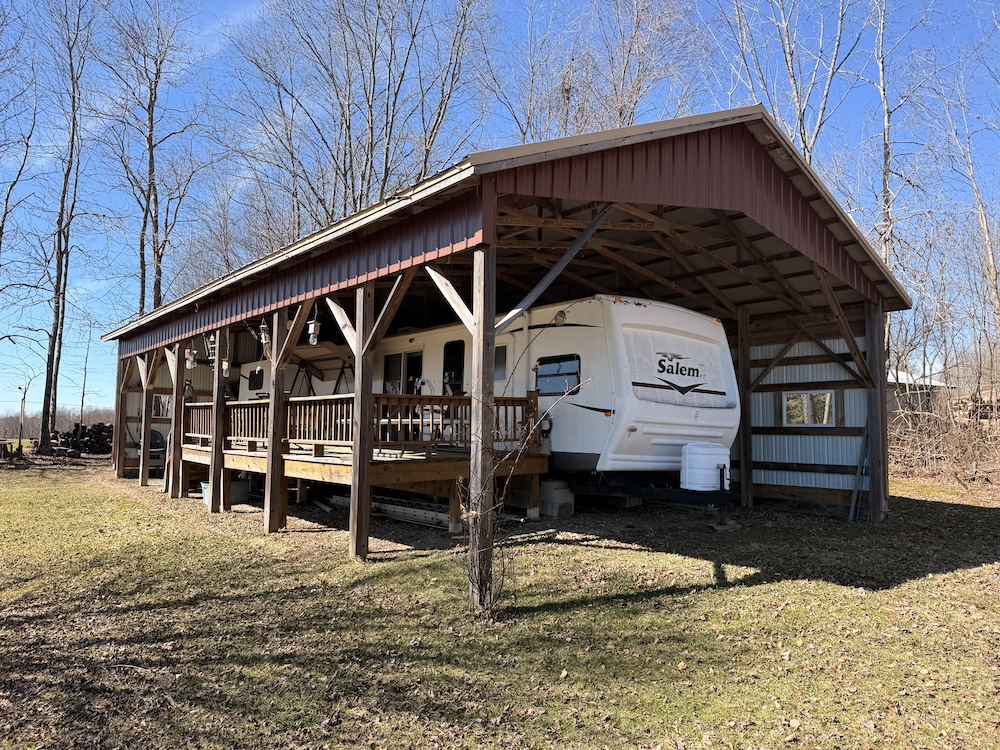A large pavilion offers covered space currently used for camper storage but may also be suitable for farm equipment or other rural storage needs. The structure could also be enclosed or modified into a larger barn or garage depending on a buyer’s plans. A separate carport provides additional covered storage for equipment or utility vehicles.