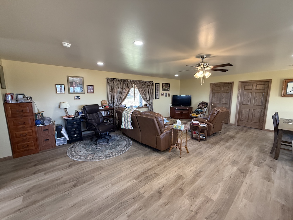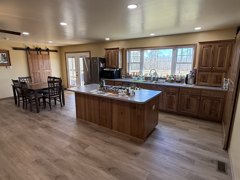 This property features a newer ranch-style home with multiple outbuildings, open pasture areas, and space that may be ideal for a farmette or hobby farm. The residence offers a functional single-level layout with modern finishes and an open floor plan.