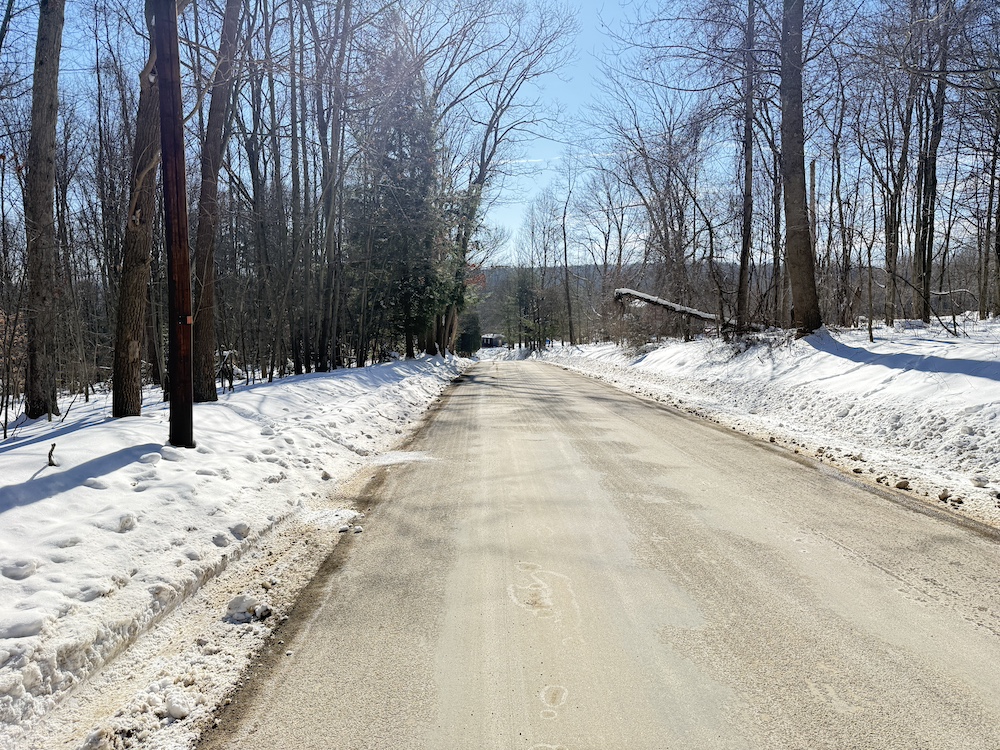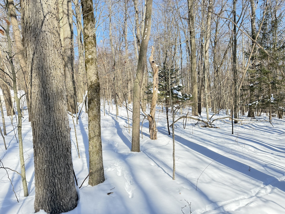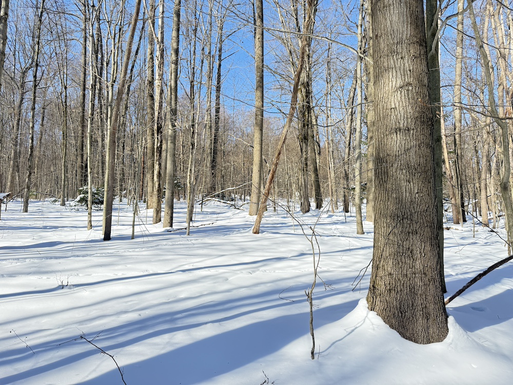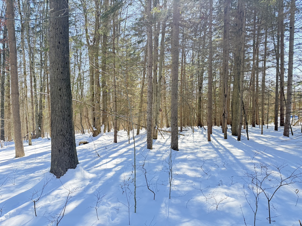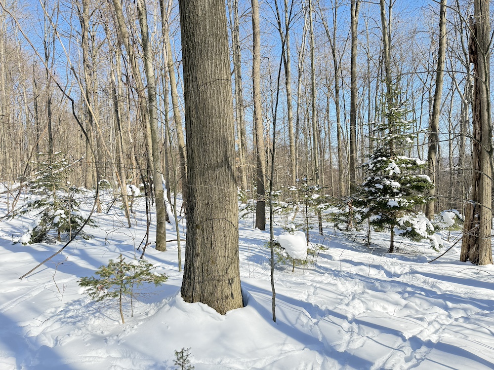The terrain is predominantly sloping, offering character and potential for a walk-out style home or cabin tucked into the landscape. The property features scattered hardwoods, including some mature timber, along with pockets of young hemlocks that add year-round greenery and privacy.