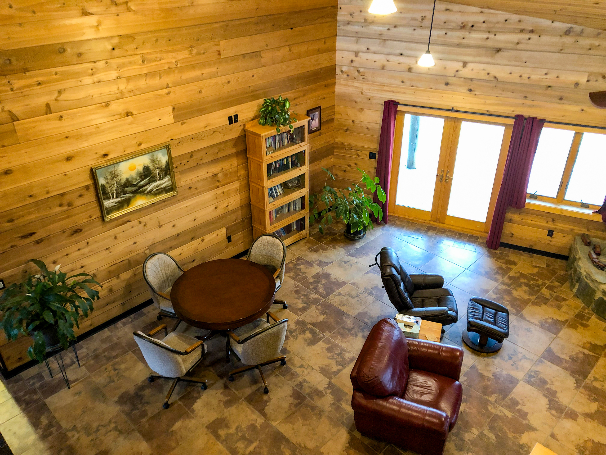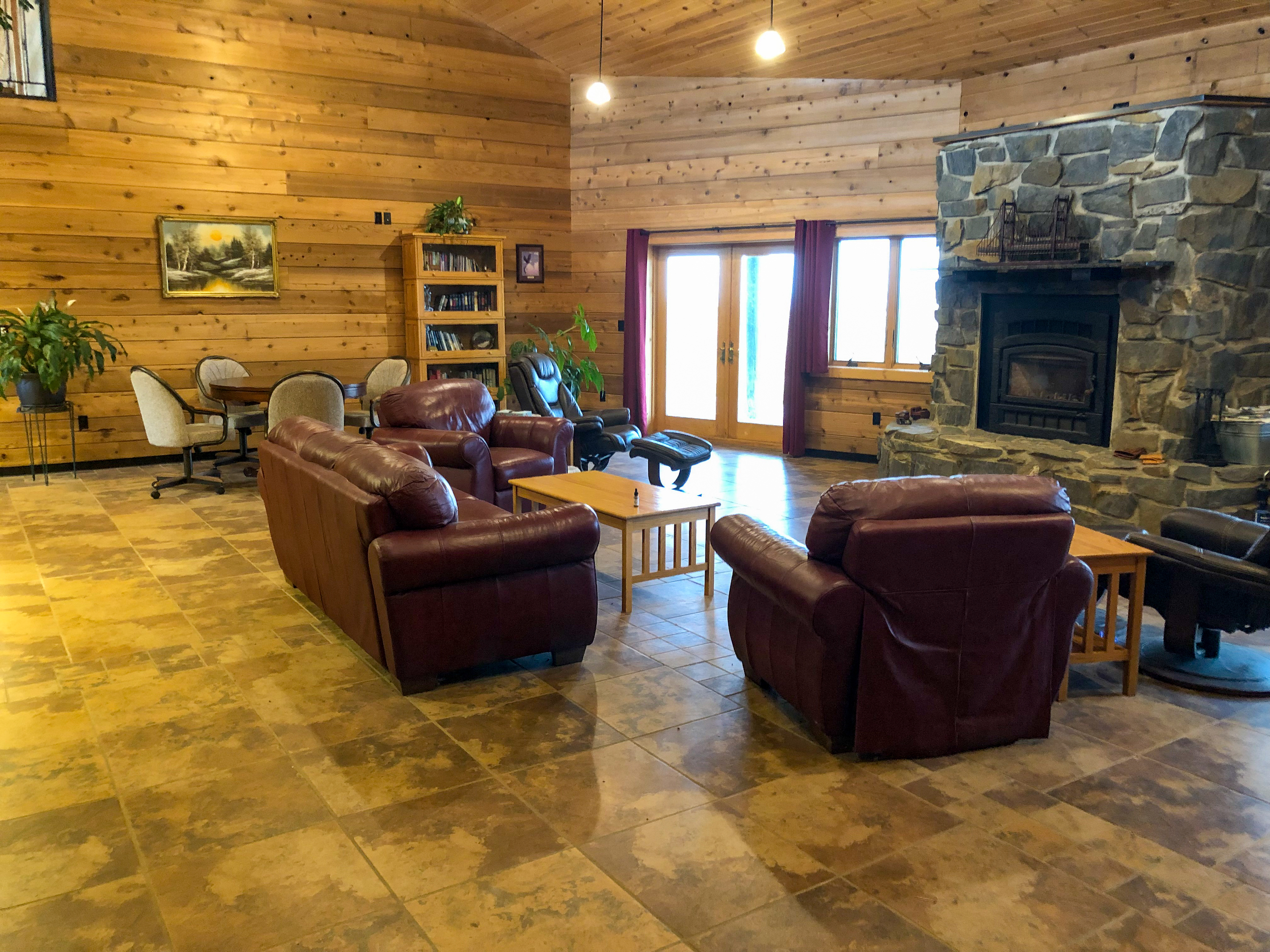 When you enter through the main level's front doors, you immediately notice the open, lofted ceiling built from tongue and groove wood. The center room is open to the lower level, and your eye is drawn down the sloping wood ceiling to the stone, wood-burning fireplace below. There is such expansive space in the center room that it is an ideal location for a gathering space, including a pool table. The southern room on the main level would be a perfect bar and lounge area, or the sunlight pouring in through the windows make it a perfect room for an indoor greenhouse. The northern room is ideal for a large living room to relax after the hunt. Two huge storage closets are located just off the northern and southern rooms.