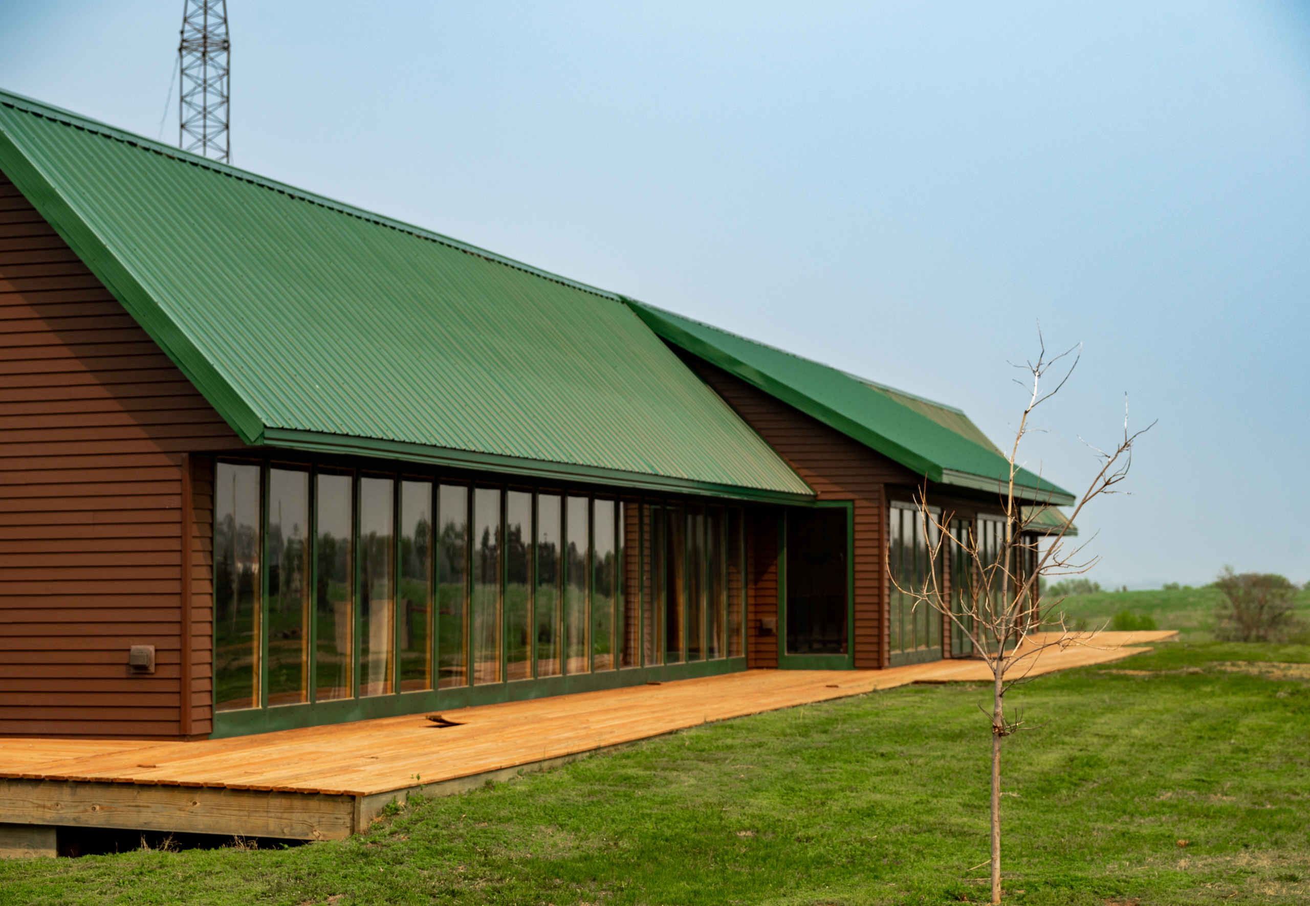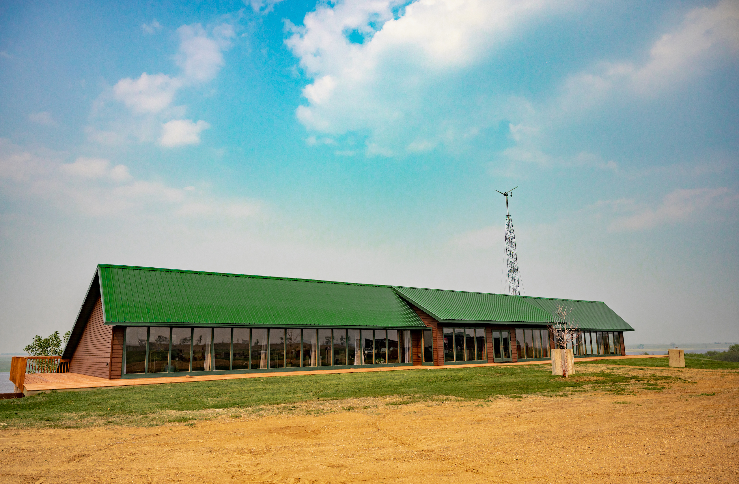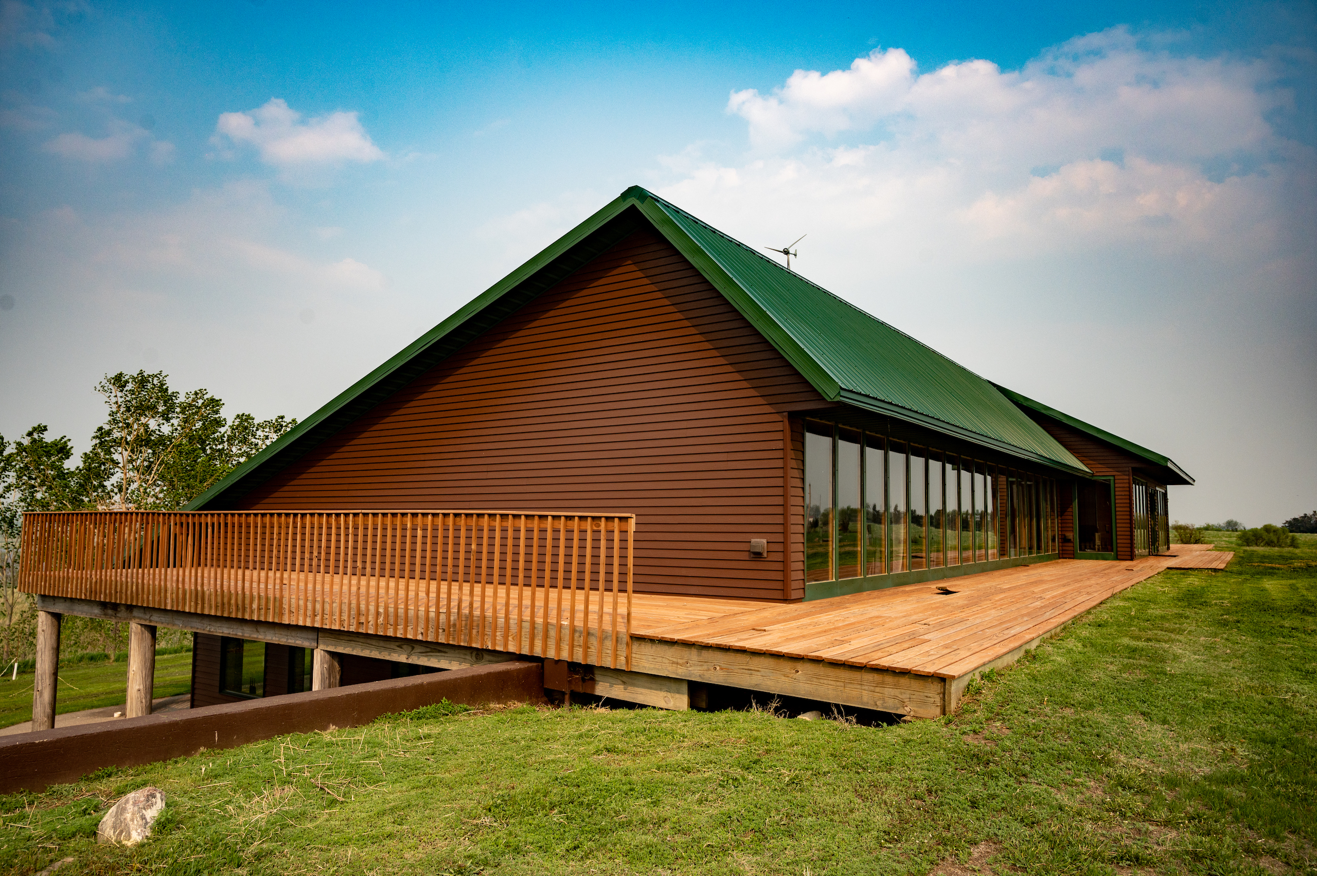 Just south of Pearl Creek, we wound along the James River Valley, and the home appeared to our right on the far bank. The large maintenance-free steel roof has an extended slope protecting the home from the north winter winds. We turned into the private drive, and one-third mile north of 225th Street, the southwest-facing wall of windows in the lodge came into view. The builders thoughtfully positioned the lodge to receive passive solar heat throughout the winter. We passed the 16kW solar array and saw the 5kW wind turbine near the property's eastern edge. A run-in shelter teemed with goats, and the well-equipped machine shed was situated on the west side of the lodge.