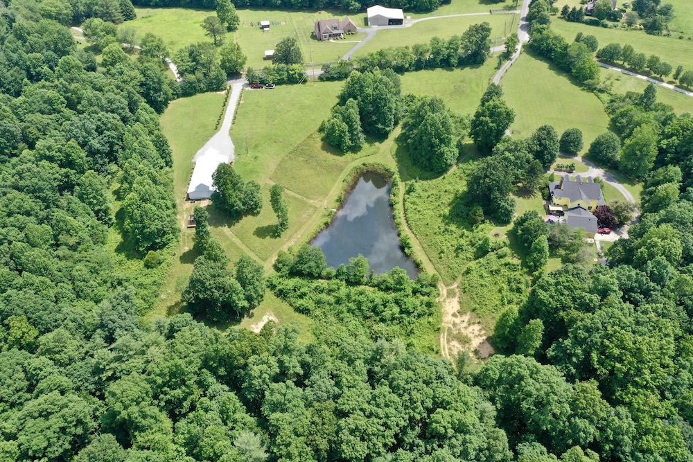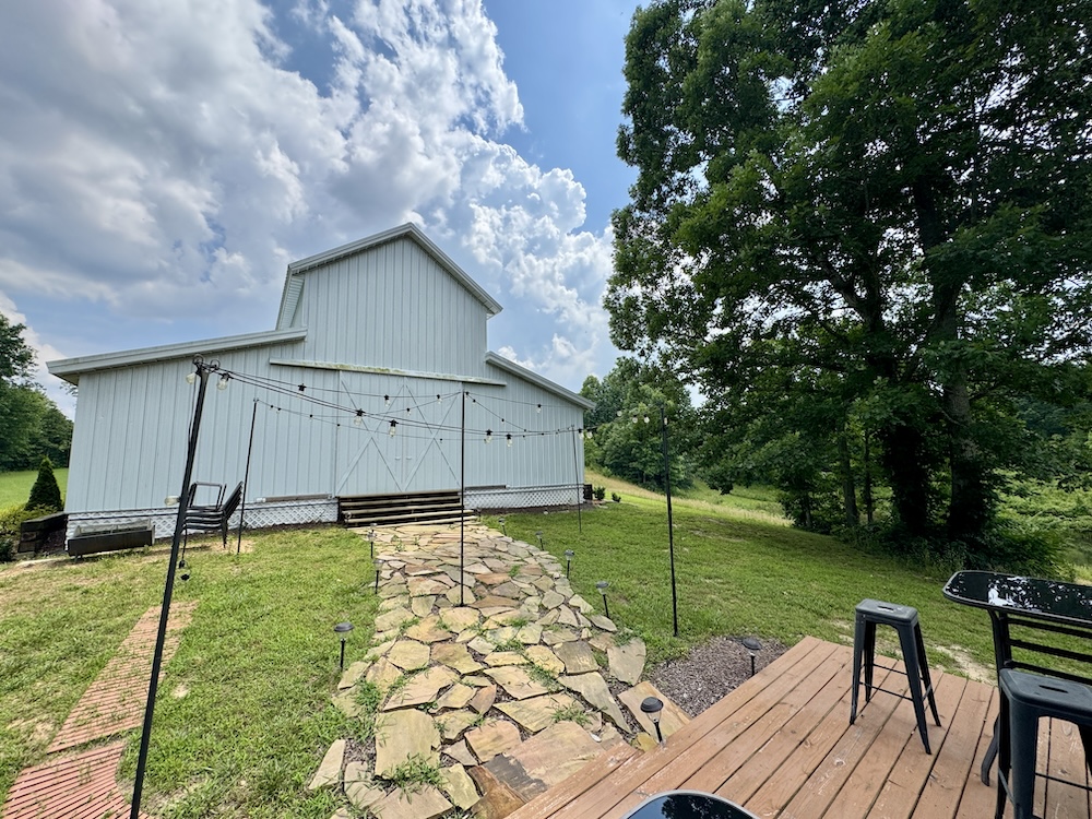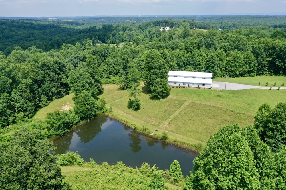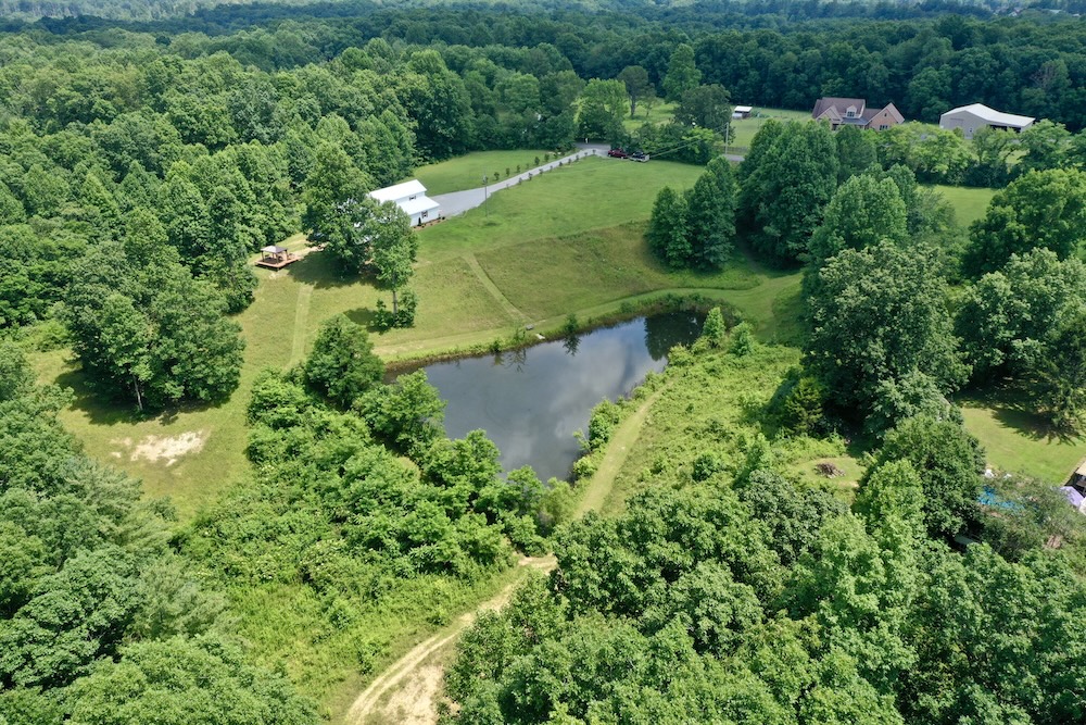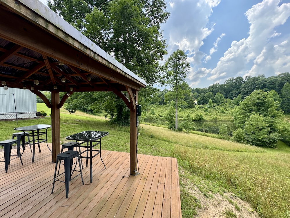 A major improvement on the property is a 40x80 pole barn constructed in 2022. The barn is fully enclosed and includes heating and air conditioning, providing year-round usability. Interior features include three bathrooms, a small commercial kitchen, and a bar area. The structure was designed with custom barn doors and premium finishes. A large rear deck extends from the barn and overlooks the surrounding acreage and pond, offering an elevated view of the property’s natural features.