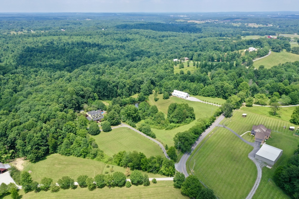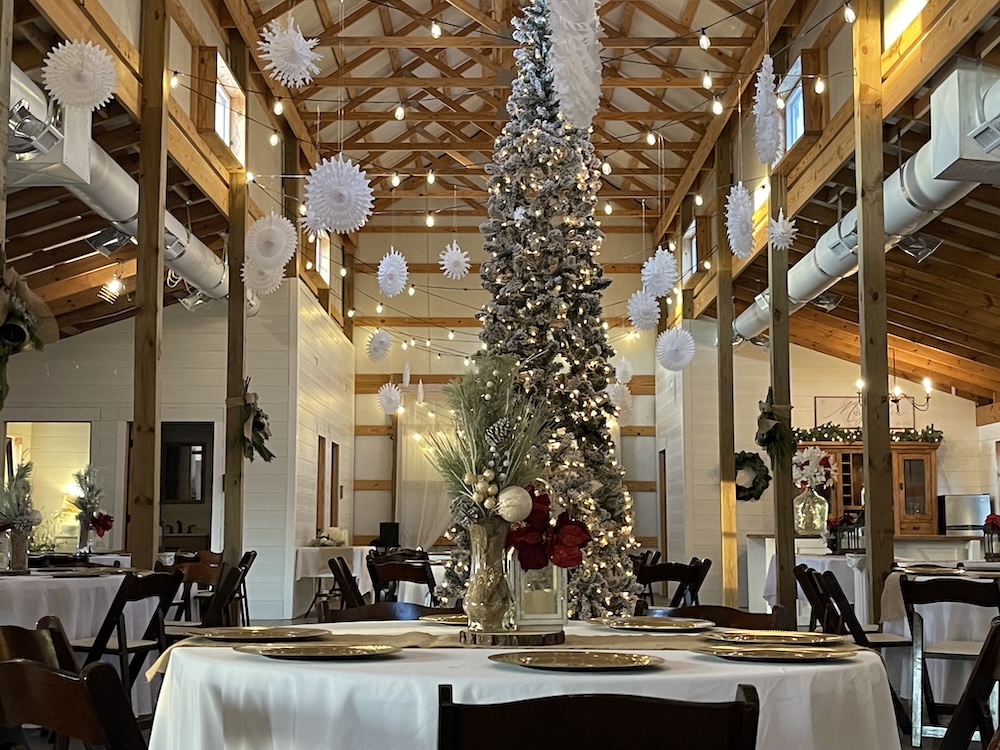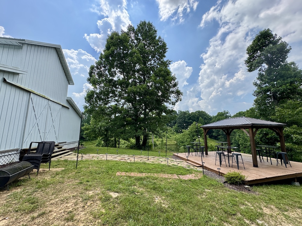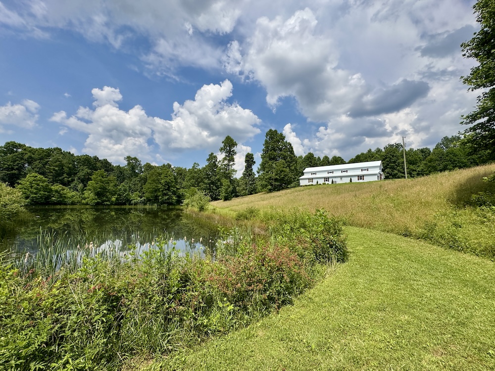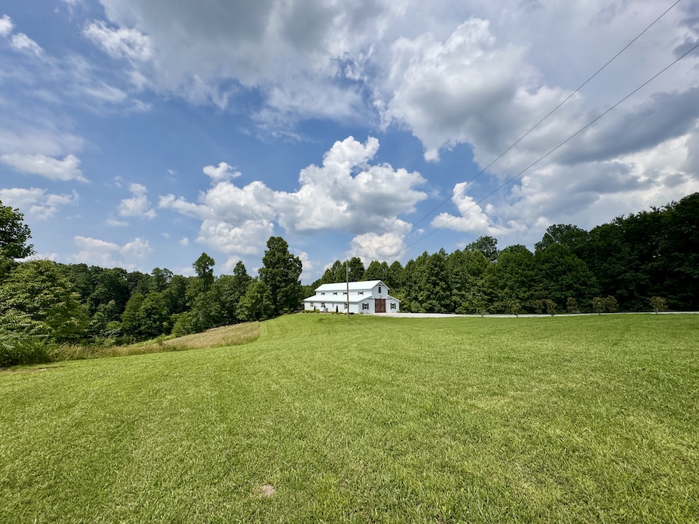 A major improvement on the property is a 40x80 pole barn constructed in 2022. The barn is fully enclosed and includes heating and air conditioning, providing year-round usability. Interior features include three bathrooms, a small commercial kitchen, and a bar area. The structure was designed with custom barn doors and premium finishes. A large rear deck extends from the barn and overlooks the surrounding acreage and pond, offering an elevated view of the property’s natural features.