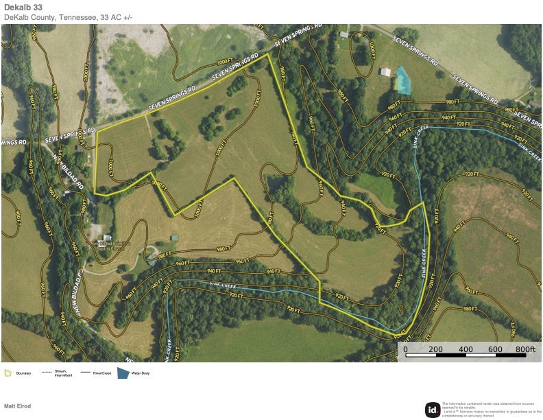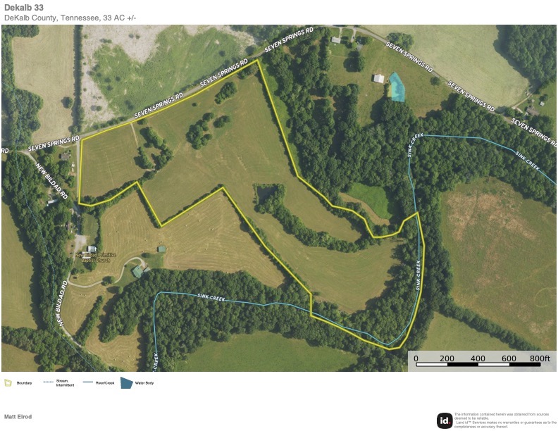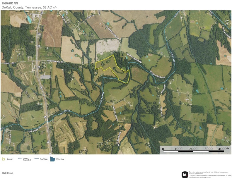 Located in Dekalb Co, TN, here is a rare opportunity to own a property with 1400 ft of beautiful Sink Creek frontage. It's conveniently located between Smithville and McMinnville and offers potential new buyers many possibilities. Multiple home sites exist overlooking the gorgeous valley below and the beautiful arrow-shaped pond. The possibility to subdivide is made easy with over 3000 ft of Seven Springs road frontage and multiple suitable building sites. Electricity and municipal water are available at the road. The topography consists of gently rolling pastureland and a wooded area along Sink Creek. Deer and turkeys are frequent visitors to the property. Whether it's building a dream home with a place for the kids to roam and play in the creek or a private weekend getaway, this property has something for everyone. Please call today to schedule a showing.