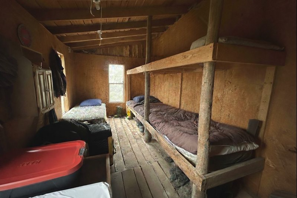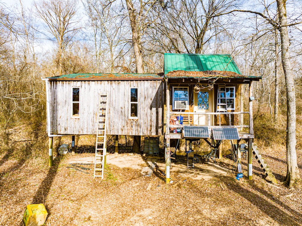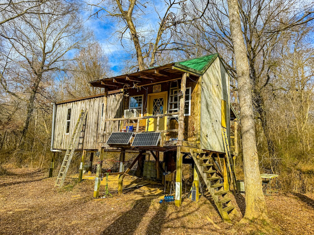 - Elevated off-grid cabin with solar power, bunk room, and kitchenette