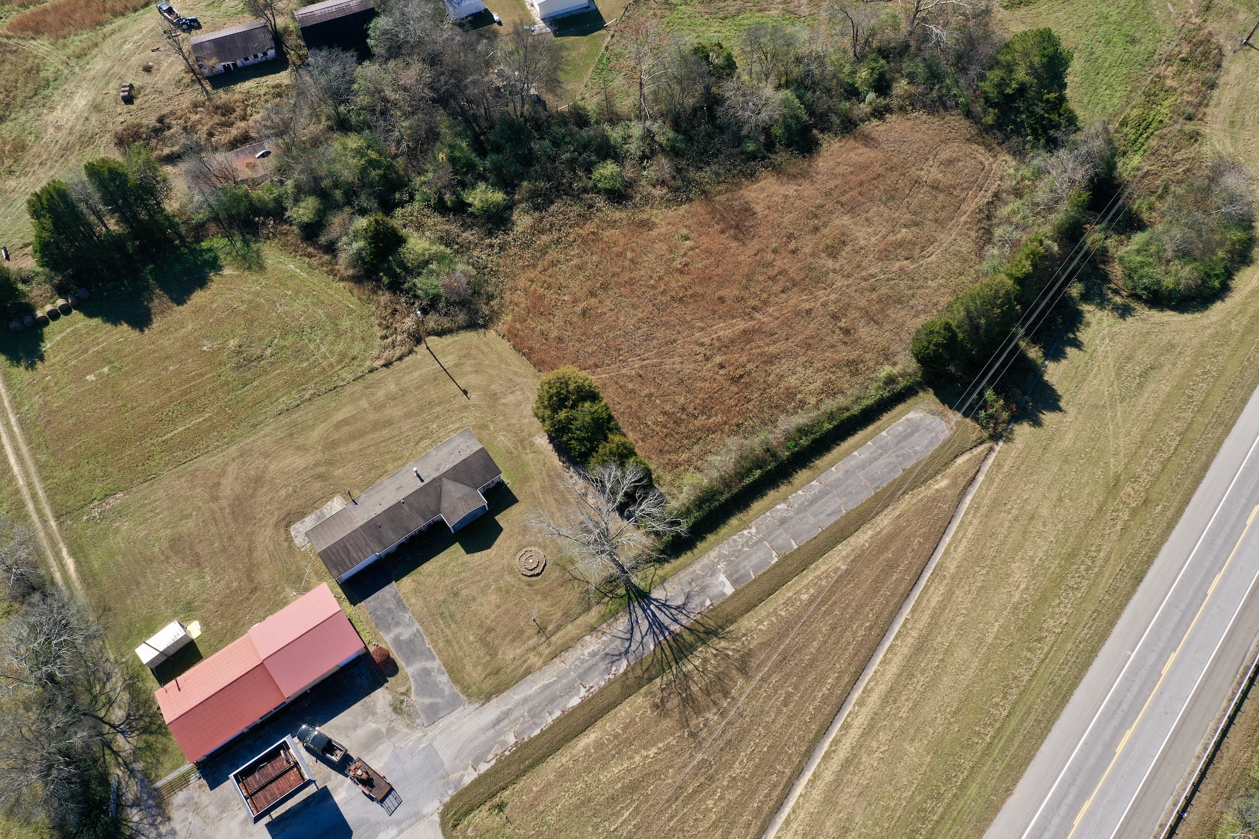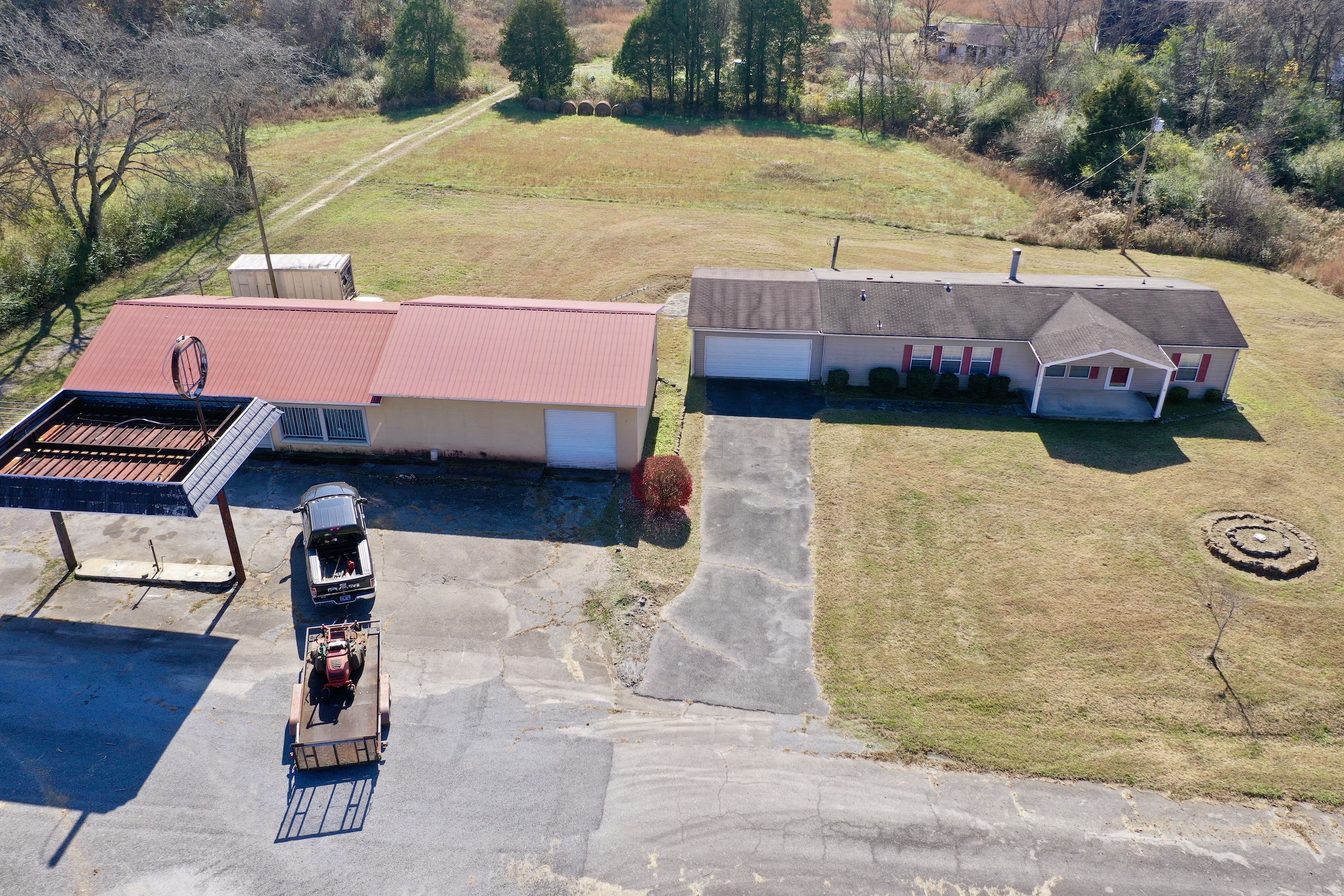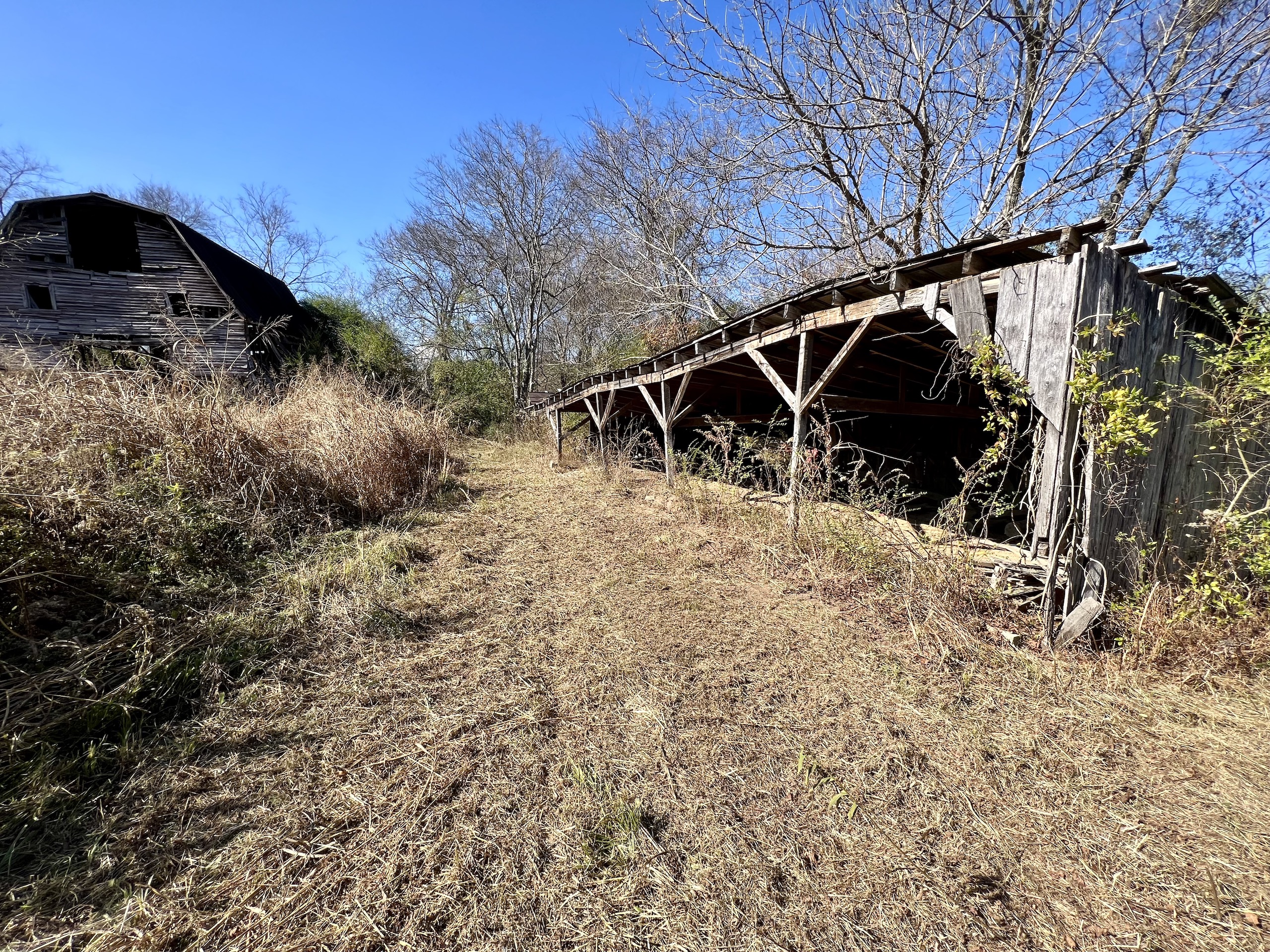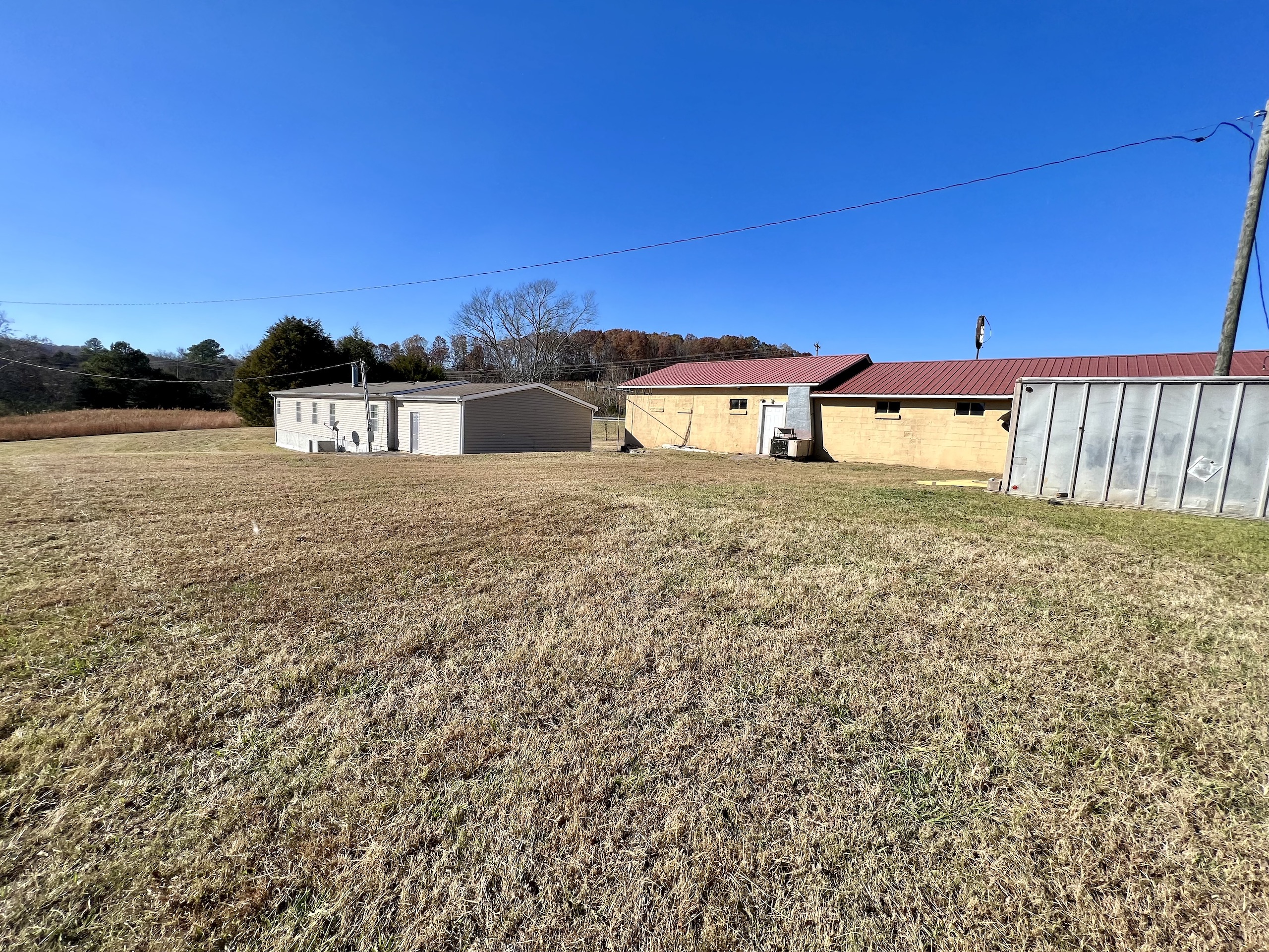- Barn, mobile home, and storage building on site
