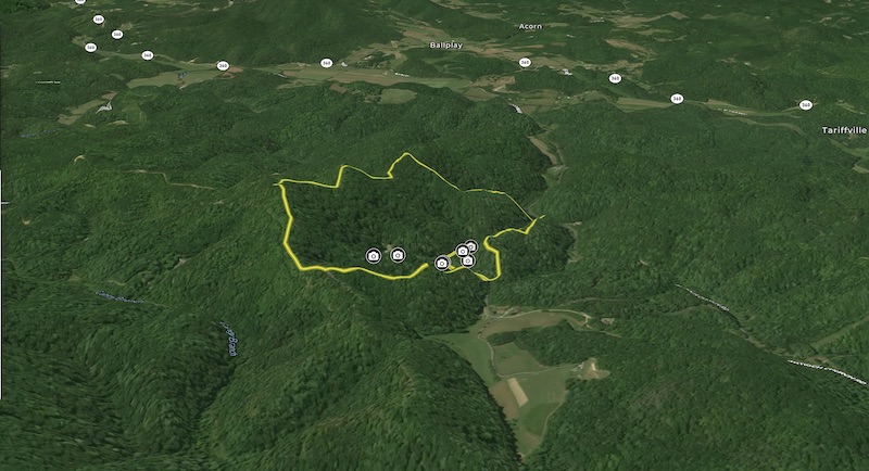 An existing driveway leads you into the property, where you’ll find a charming spring that adds to the natural allure. The land is mostly wooded, providing privacy and a lush, green landscape, with a large clearing in the middle, ideal for various uses. Additionally, an existing roadway grants easy access to the upper parts of the property, making exploration and development convenient.