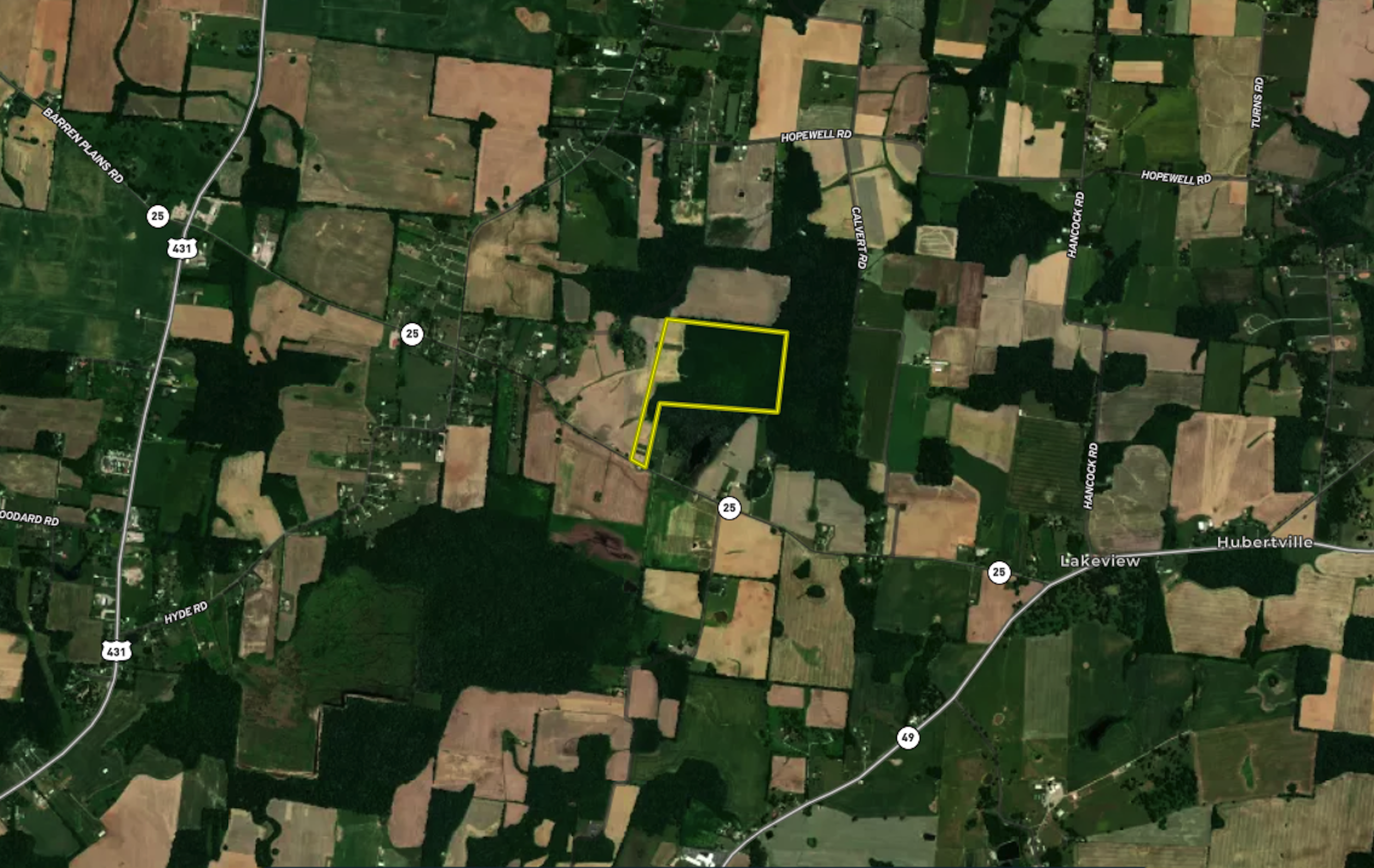 Beautiful, flat potential home site with lots of privacy with no restrictions. Great hunting, building, or farming tract. Approximately 15 acres of agriculture ground with the rest in timber/young trees with the ability to increase the tillable ground. Electricity and city water located at the road.
