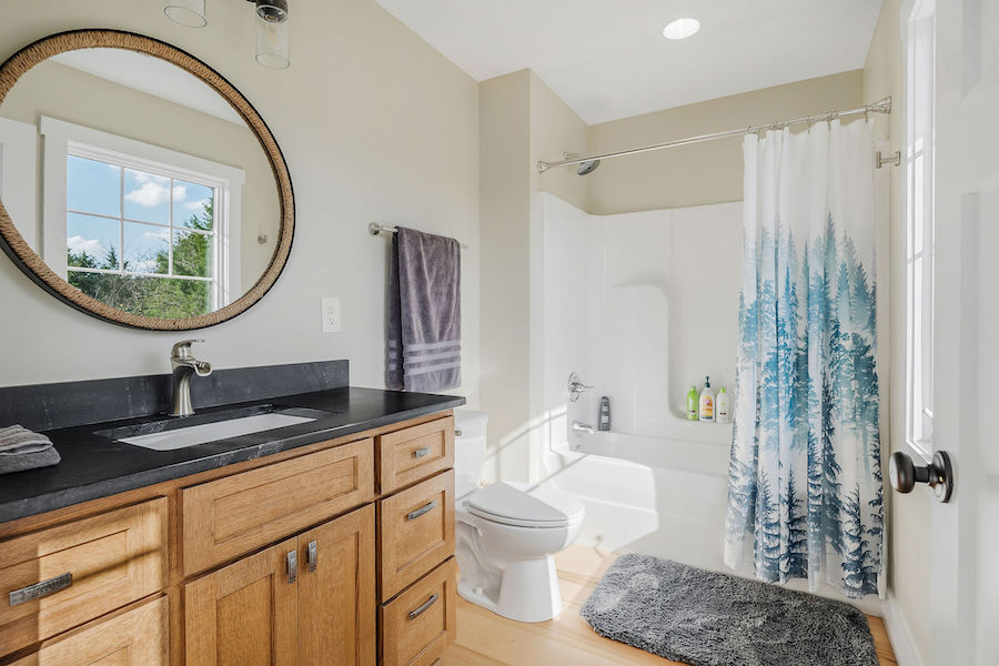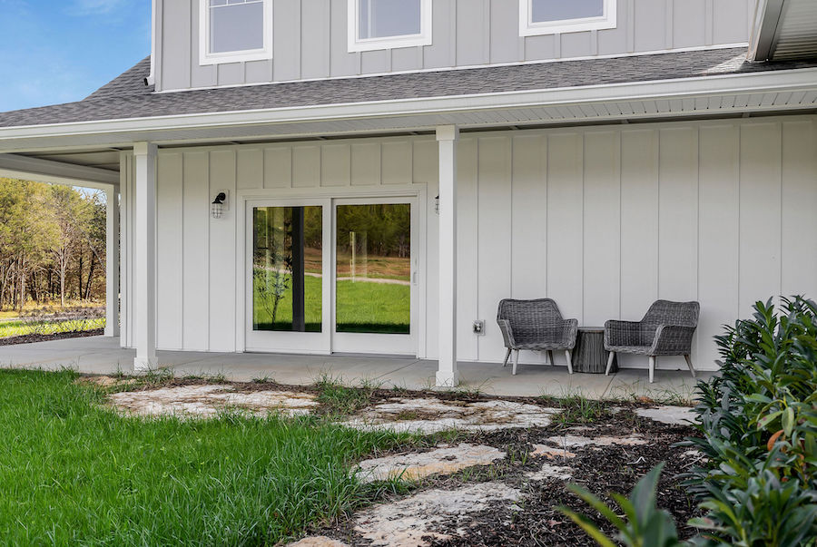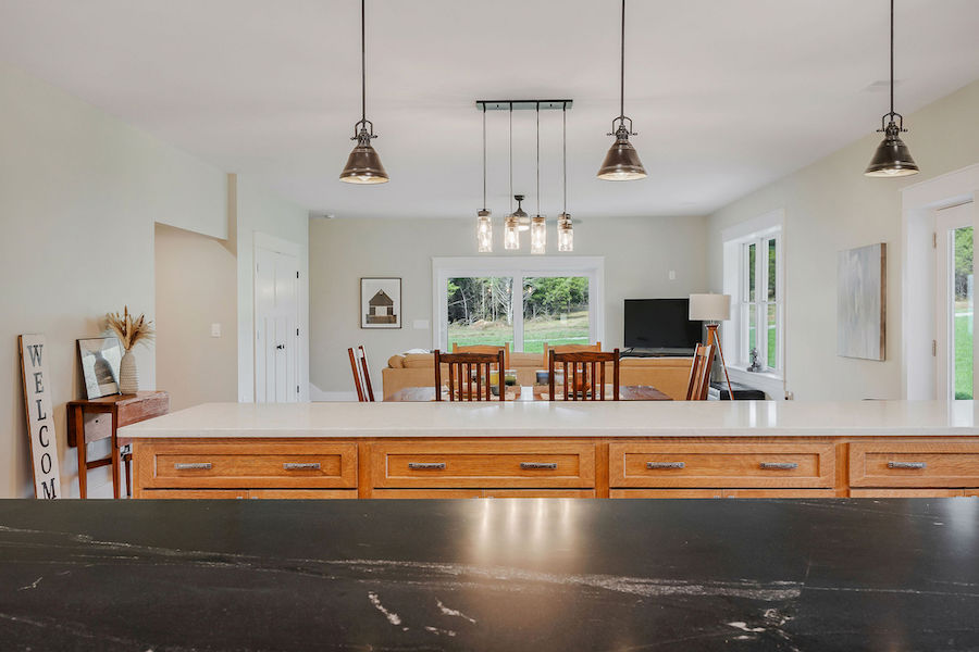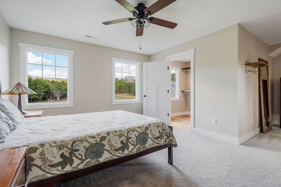 The newly constructed home spans 2,920 square feet, offering three spacious bedrooms and three full baths. Built with the highest quality materials, the house utilizes Insulated Concrete Forms (ICFs), providing energy efficiency, durability, and quiet interiors. The open floorplan connects the kitchen, dining, and living areas, creating an inviting space for both everyday living and entertaining. The chef's kitchen is a standout, with solid quarter-sawn oak cabinets and plenty of counter space for cooking and gathering. Throughout the main level, hickory flooring adds warmth and character to the space. A large wrap-around porch offers stunning views of the surrounding landscape and provides a peaceful spot to relax or entertain outdoors.