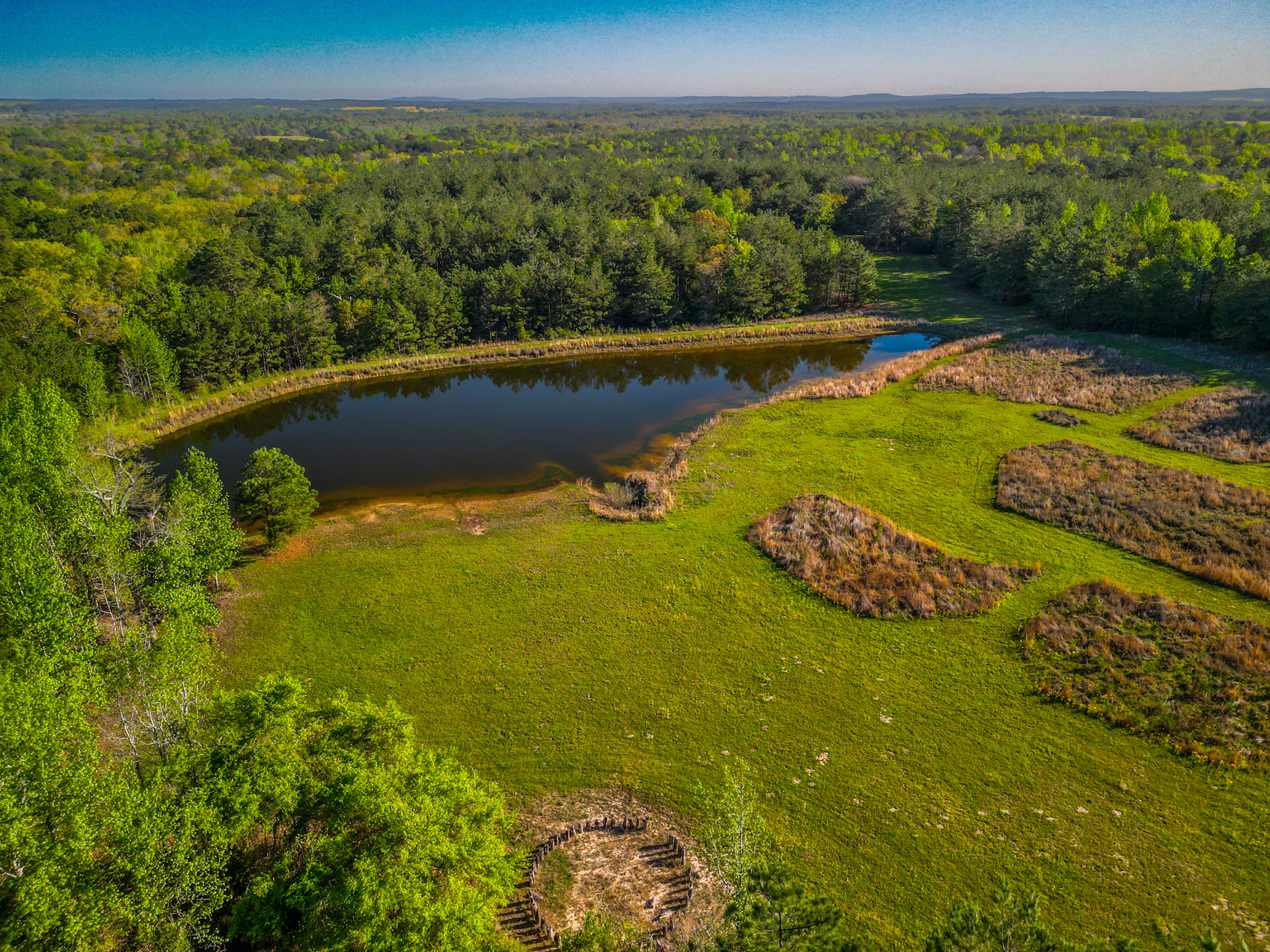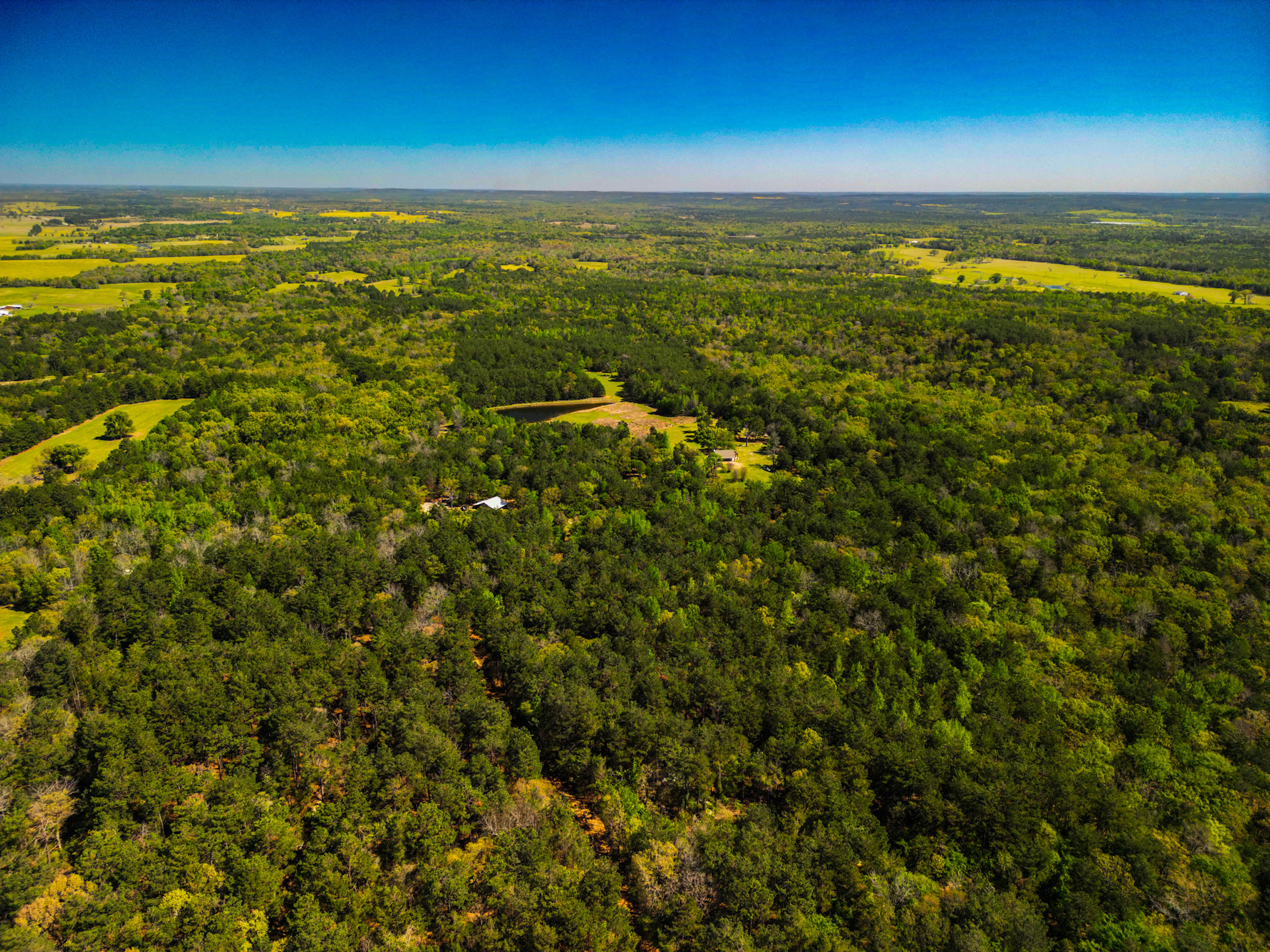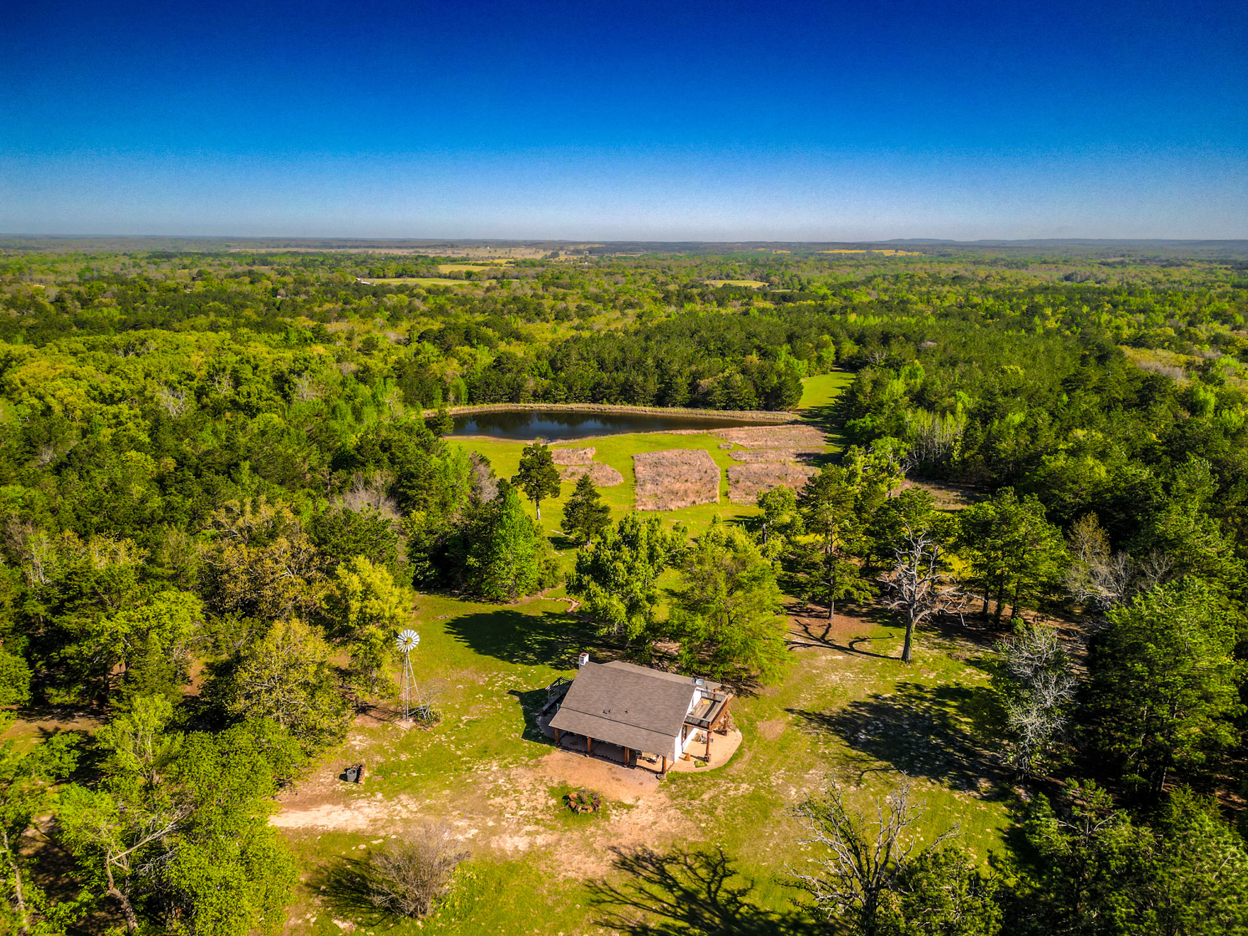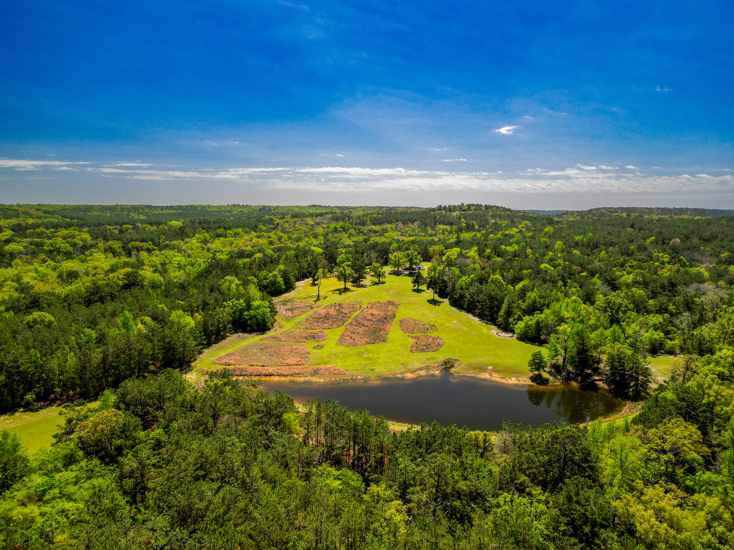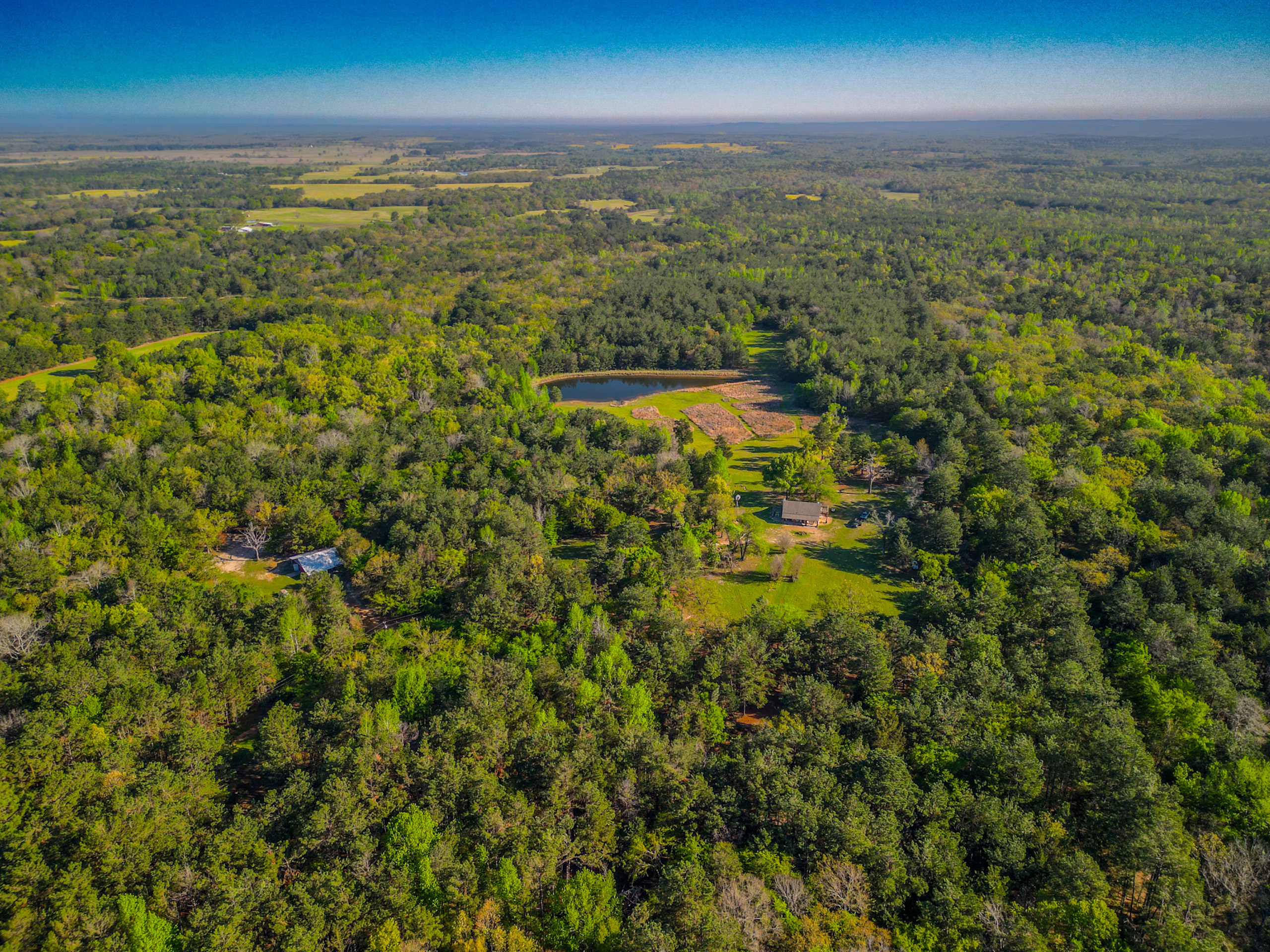 Land Characteristics: The ranch is an extraordinary property that boasts a mixture of native timber and rolling terrain with approximately 200 feet of elevation change. The property is predominantly wooded, with a variety of native east Texas trees such as various species of Oaks, a mixture of native and planted Pines and many other species, which are highlighted in the spring months by the white blossoms of the Dogwood tree. The land’s natural features include a 1.6-acre pond which is located at the bottom of a picturesque field of native grasses. The ranch’s diverse vegetation and rich wildlife, including deer, wild pigs and predators, make it a hunter’s paradise. The ranch has miles of trails, some of which have sitting areas that have been improved with rustic benches so you can sit and enjoy the serene surroundings. Whether you’re looking to enjoy nature, explore the outdoors or hunt and fish, Chimney Ridge Ranch is the perfect place to do it all.