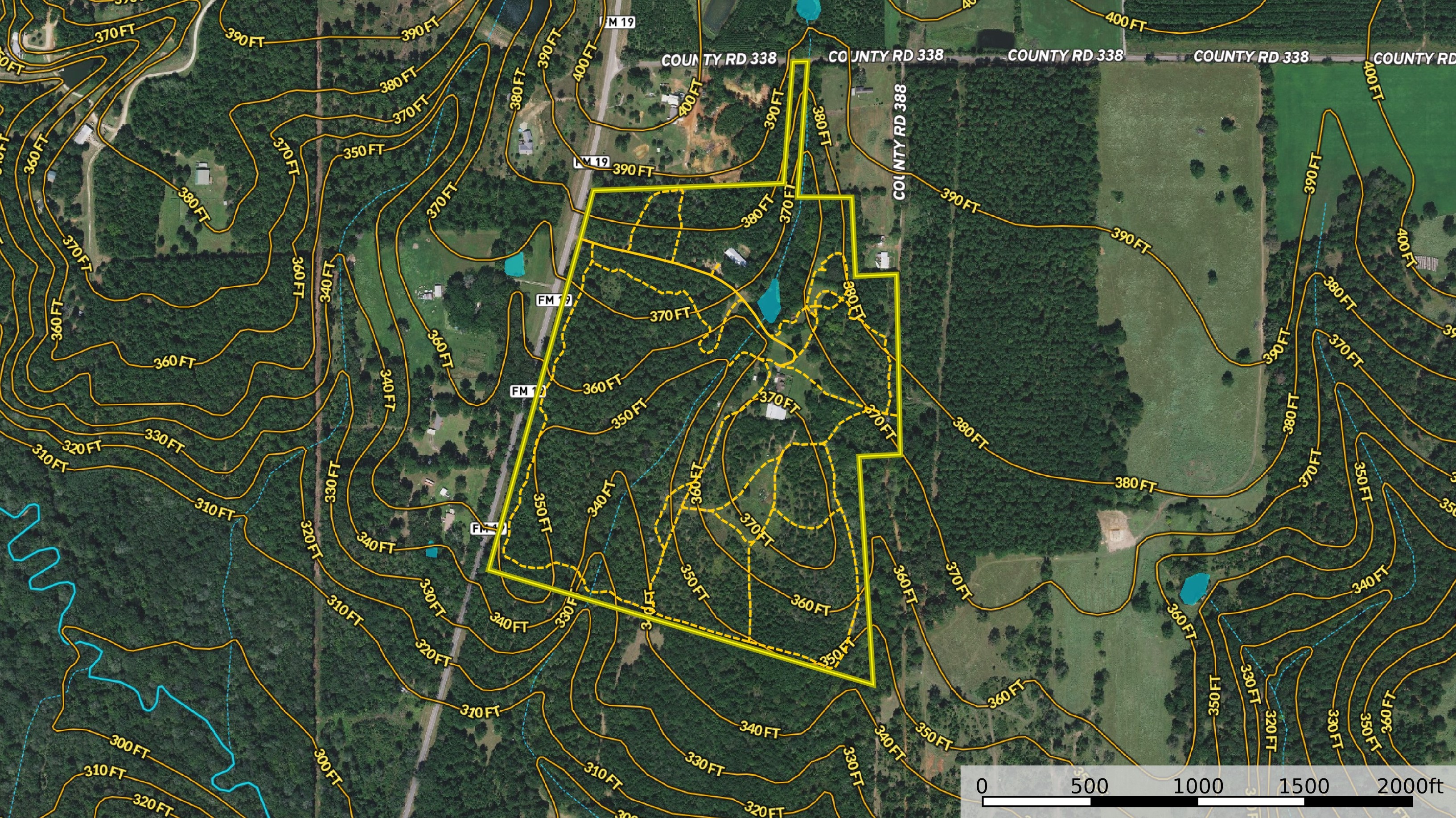 Land Characteristics: The property itself is reported by survey to be 75.318 acres with long frontage along FM 19 and additional points of frontage along ACR 338 and ACR 3383. The tract has rolling terrain with elevation ranging from an approximate low of 330’ ASL to an approximate high of 380’ ASL. The bulk of the property is mixed mature timber with small open areas interspersed that could be developed as food plots or simply utilized to sit and enjoy nature. Massive mature hardwood and Pine timber is a primary focal point of the western portion of the property and miles of trails offer ease of access to these areas to bring you closer to nature. Water features on the property include a small pond which is estimated to be approximately half an acre in size as well as a spring which is noted on the topo map that appears to come to the surface in a few areas. One such area has been improved with a hand dug culvert well that allows the owner some control over the release of water from what they call an artesian well. The creek bottom that runs the length of the property as well as other drainages that converge into this main drainage showcases some of the largest timber that the property has to offer including towering White Oaks that are a favorite of the Whitetail deer and native game that call the property home.