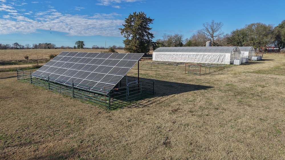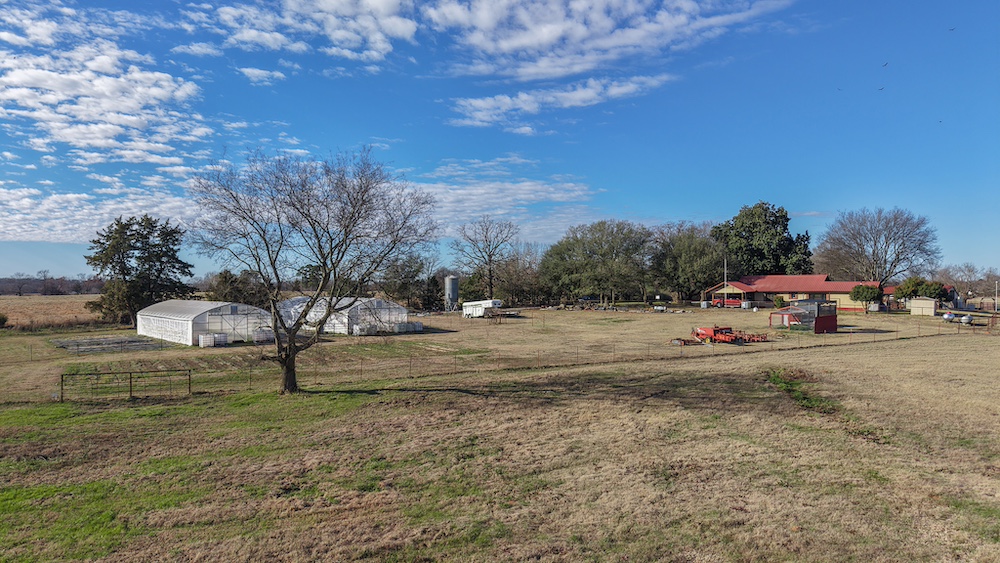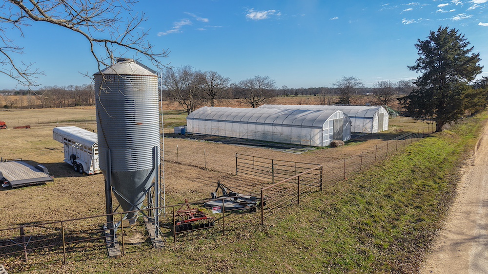 The land is cross-fenced into two pastures (approximately 30 acres and 50 acres) with a connecting gate, making rotational grazing simple and efficient across the full 80 acres. Improvements include a 24x40 pole barn with electric, a 25x32 barn with climate-controlled space on the south side, Zimmerman hi-tunnels, RV cover with 30-amp and 50-amp hookups, separate septic for RV use, outdoor shower and restroom facilities, and additional utility infrastructure that supports a working operation.