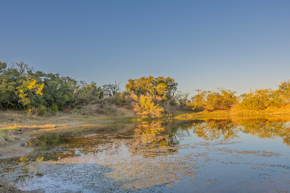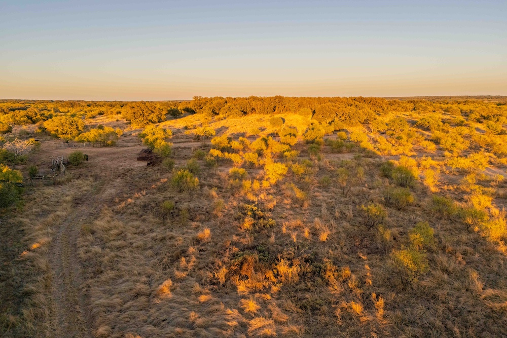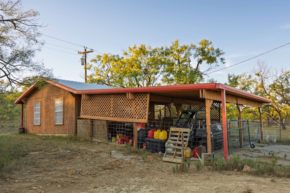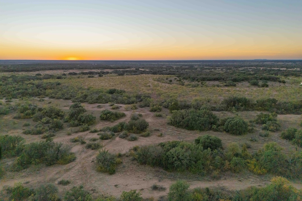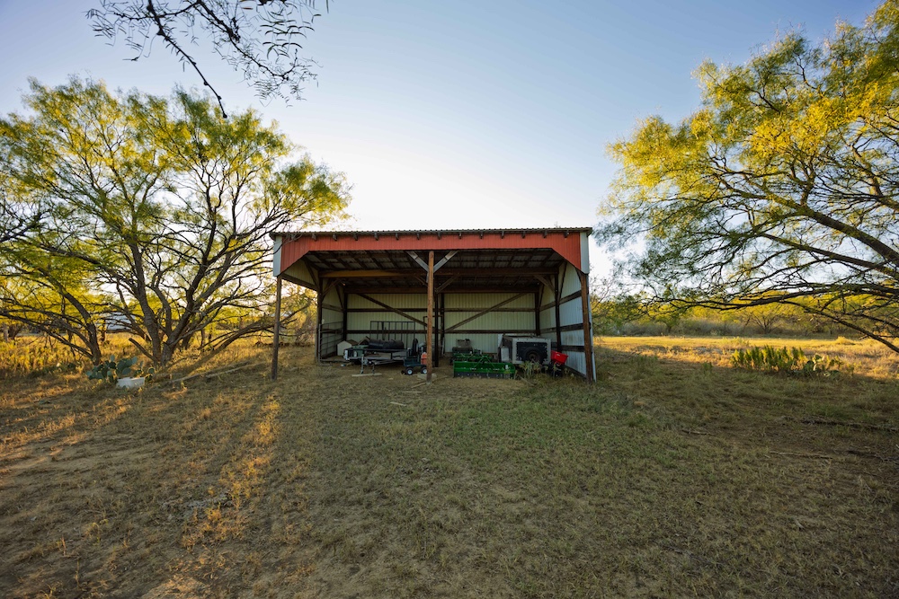 Entering from the County Road gate, the landscape transitions from mesquite and large live oaks along a wet-weather draw to open native grass areas. A gravel drive gradually rises to the first bench, where the hunting cabin is located. This area includes established utilities with water, electricity, and an on-site septic system, along with several functional improvements that enhance usability and storage.