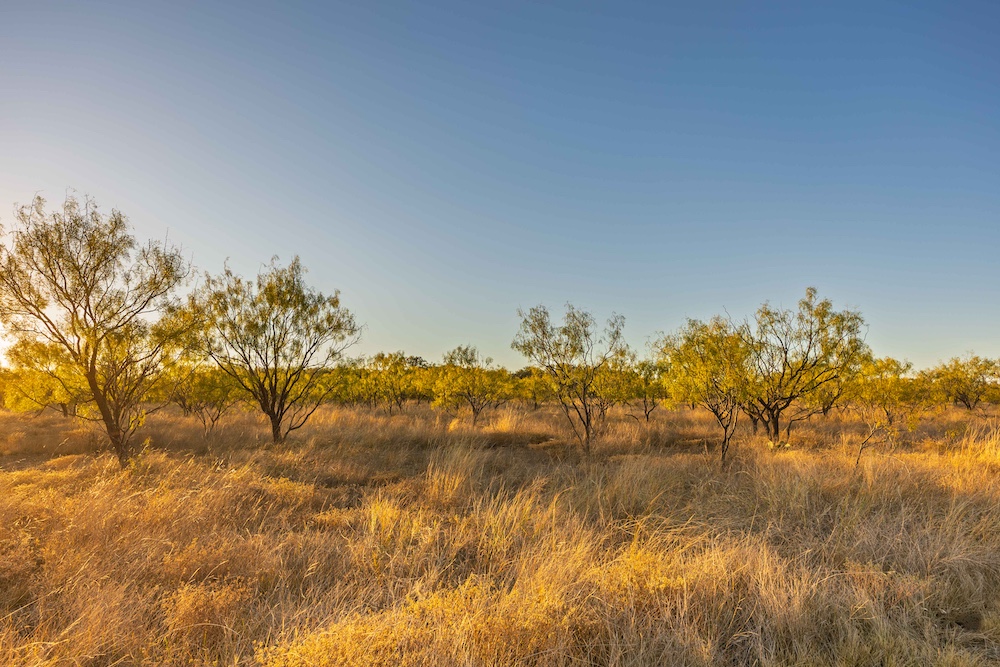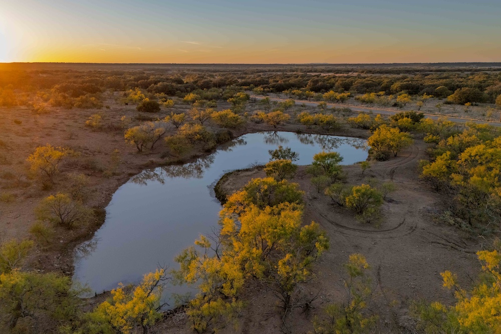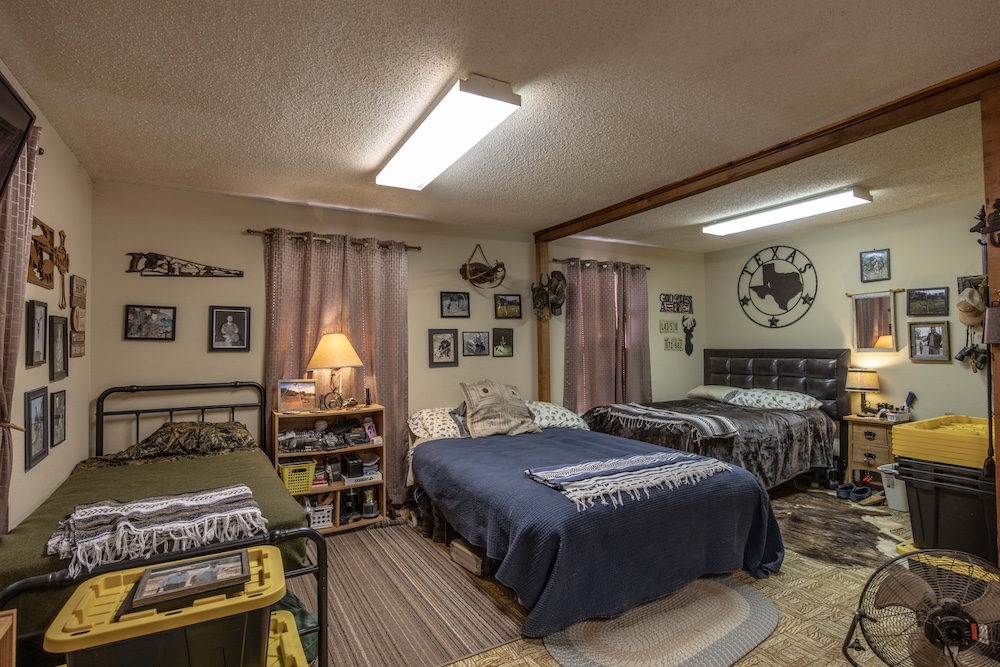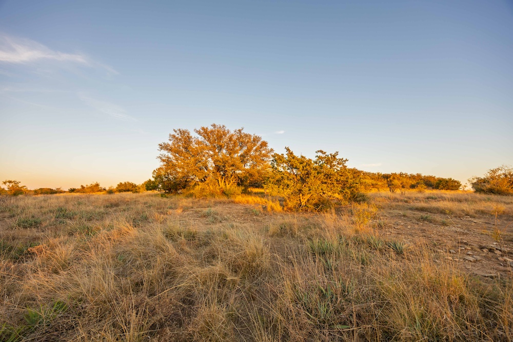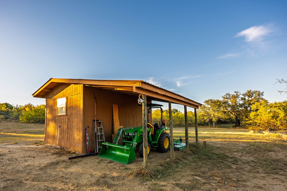 Entering from the County Road gate, the landscape transitions from mesquite and large live oaks along a wet-weather draw to open native grass areas. A gravel drive gradually rises to the first bench, where the hunting cabin is located. This area includes established utilities with water, electricity, and an on-site septic system, along with several functional improvements that enhance usability and storage.
