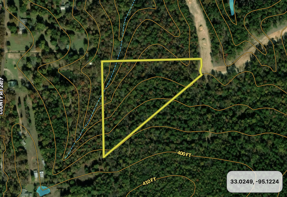 Although the property is not waterfront, portions of the tract provide views toward Lake Bob Sandlin. The surrounding timber and natural terrain provide a quiet environment that may allow flexibility in choosing a homesite location depending on a buyer's building plans.