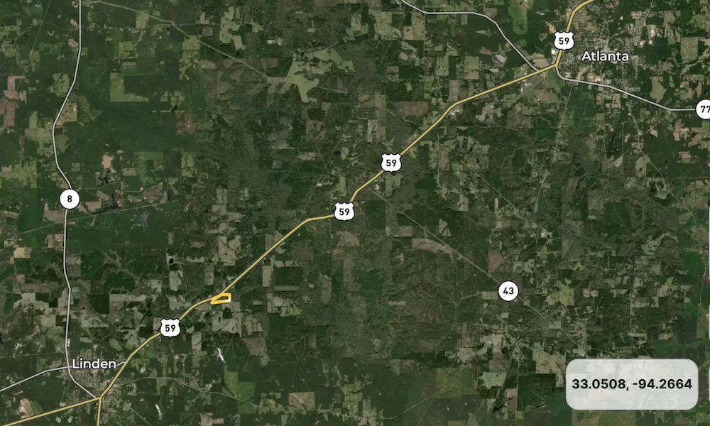The property is located approximately 14 miles from Atlanta, about 39 miles from Texarkana, and roughly 157 miles from Dallas, allowing access to shopping, services, and employment centers while maintaining a rural setting.