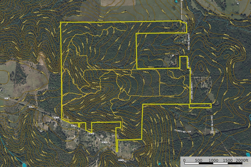Internal drainage appears to move toward nearby Gum Creek, and the property generally exhibits good drainage characteristics. Two locations are indicated on topographic mapping as having spring activity, and several wet weather creeks traverse the land. While there are currently no constructed ponds, the terrain suggests potential locations for future surface water improvements, subject to buyer verification and permitting considerations.