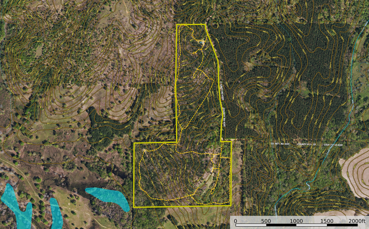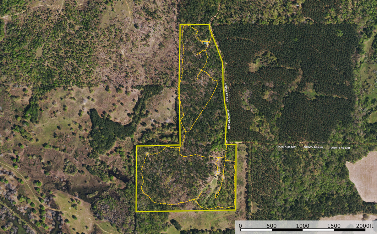 Location: Situated approximately 11 miles from downtown Jacksonville and just over two miles south of the US Highway 79 corridor, this property enjoys a convenient yet private location. The western boundary runs along CR 4301, offering two separate entrances for easy access. Coordinates to the main gate are: 31.9532; -95.1277. This prime location not only provides the tranquility of rural living but also the convenience of nearby urban amenities. The surrounding area is rich in natural beauty, with Mud Creek and Coon Creek converging nearby, adding to the scenic appeal and enhancing the property's allure.