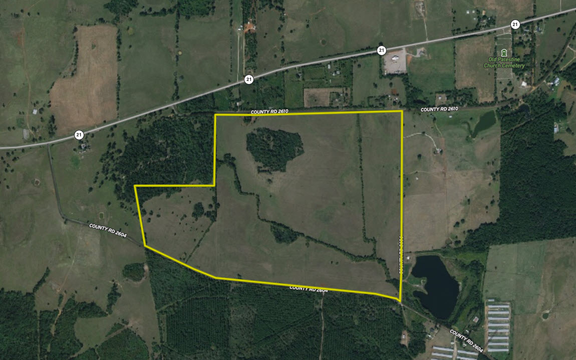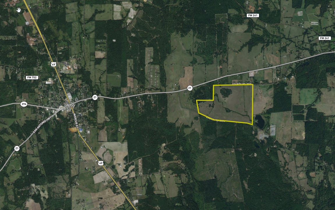 Located just east of the City of Alto and just south of SH 21, this tract offers an excellent agricultural potential with abundant road frontage. It has long frontage along the south side of CR 2610, the west side of CR 2606 and the north side of CR 2604. The property is mostly open with the exception of stretches of mixed timber along drainage creeks and a wooded hill which is located on the north side of the property. Elevation on the property ranges from an approximate low of 340’ ASL to an approximate high of 430’ ASL. The tract is all upland area with no flood zone noted and would make a great cattle operation or take advantage of the road frontage and split into smaller parcels.