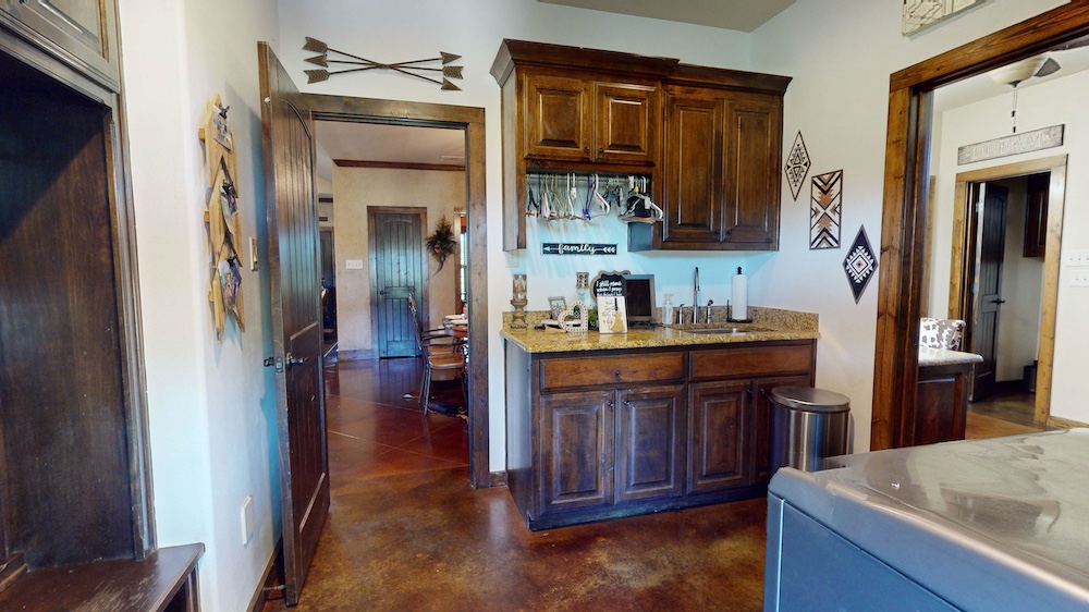Improvements: Nestled amidst the sprawling beauty of the ranch is a charming 2,275 square foot custom home, meticulously constructed in 2014. The home harmoniously blends rustic and refined elements, featuring brick and stone veneer with Cedar beam patio and carport accents. Inside, stained concrete floors exude a rustic charm, complemented by custom stained Alder cabinetry, solid wood doors, and upgraded appliances. The kitchen, living, and dining areas flow seamlessly, creating an inviting space for gatherings and relaxation. With three bedrooms, two baths, and an office, this home offers ample space for comfortable living. Step outside onto the expansive rear patio with an attached carport, offering unparalleled outdoor living space and breathtaking views of the surrounding landscape. The property is fenced with well-maintained perimeter and cross fencing, facilitating rotational-based grazing practices with ease. Behind the home, three paddocks equipped with loafing sheds provide comfortable accommodations for livestock. Additionally, an alleyway leads to a lighted roping area, cattle pens, and a barn, ensuring efficient handling of livestock and recreational benefits. The home is connected to community water but the barn has a 220 foot water well for livestock and irrigation purposes.