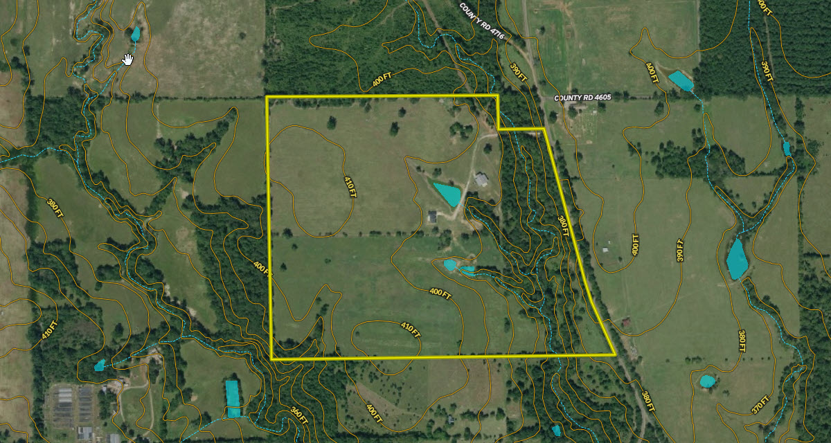 LAND: The property is reported to be 100.616acres which is mostly rectangular in shape and has a long frontage along FM 856. The unique aspect of this property is that the entire frontage along the FM road is basically a wooded drainage with good elevation changes and mature mixed timber that offers a very private feel for the improvements. There is approximately 17 – 18 acres of mixed timber and the remainder is gently rolling pasture with scattered hardwood trees and multiple ponds. It appears that the topography in certain areas might allow for enlarging ponds or construction of a larger water feature. This property is all upland with no flood zone noted. Elevation ranges from an approximate low of 360’ ASL to an approximate high of 410’ ASL. The tract has two small ponds, one in each pasture that appear to offer adequate water for most livestock and wildlife purposes.