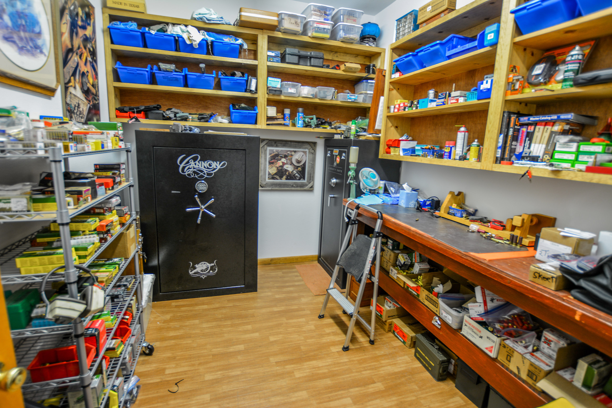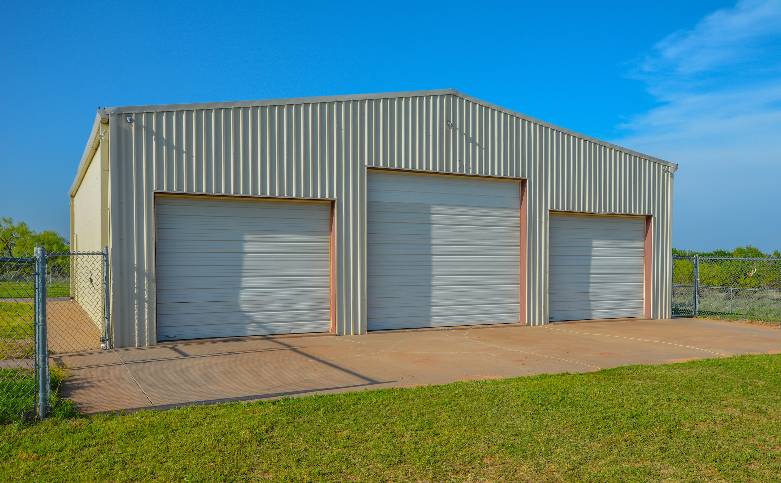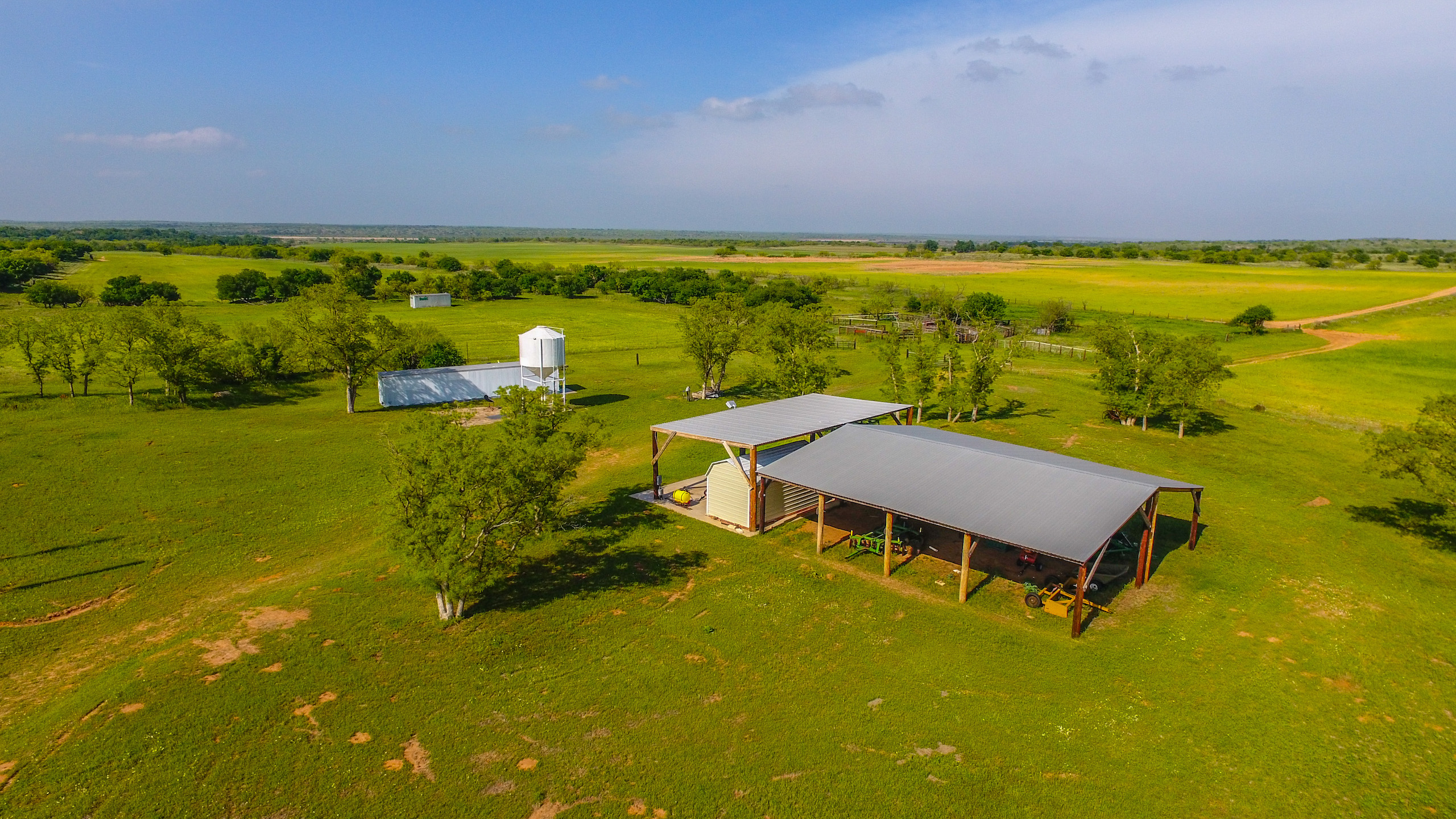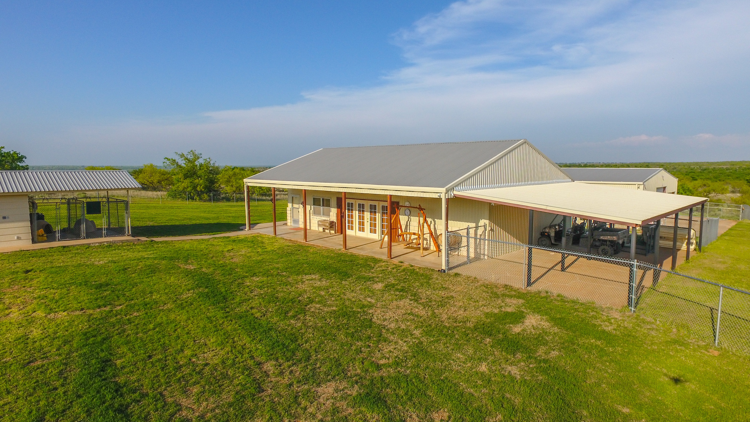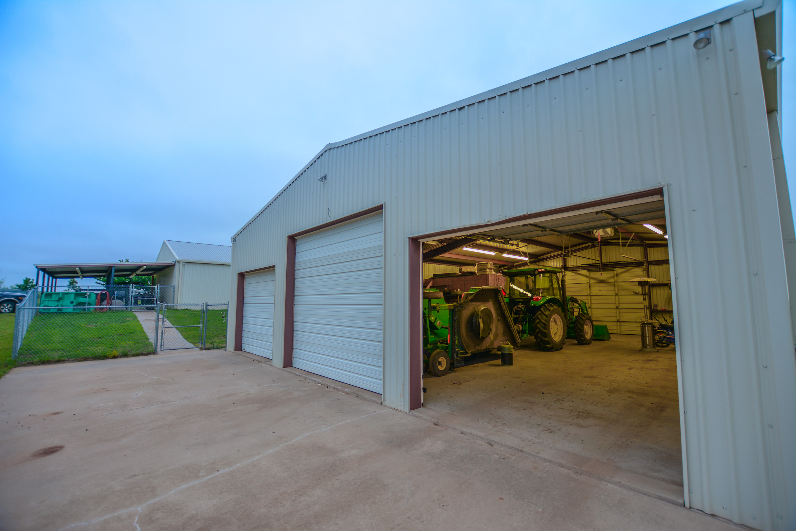 The 50x40 equipment barn on a concrete slab is big enough for your UTV, ranch truck, and tractor with three roll-up bay doors. There is also an enclosed area inside the barn for all your parts, equipment, etc. On the porch of the equipment barn is a commercial walk-in cooler for storing all the harvested game and there is a stainless-steel sink set up adjacent to the cooler for cleaning game.