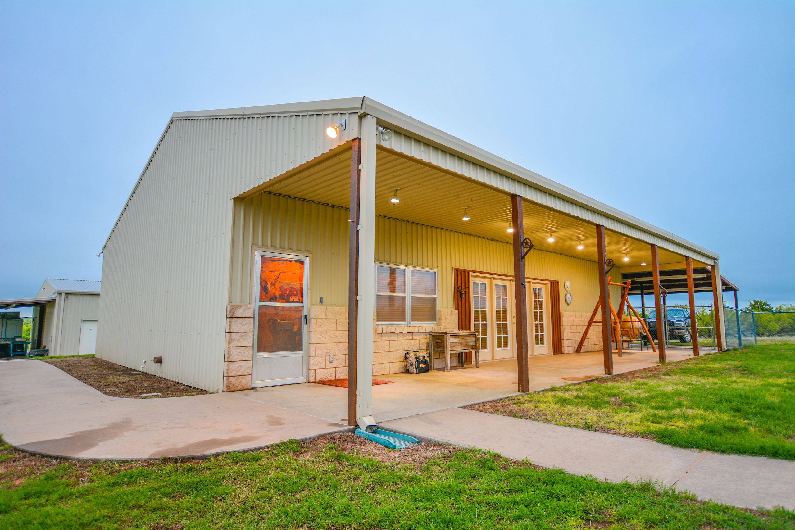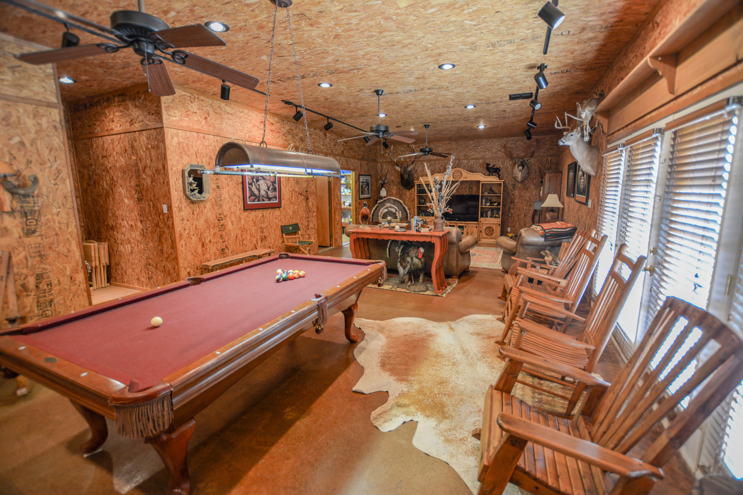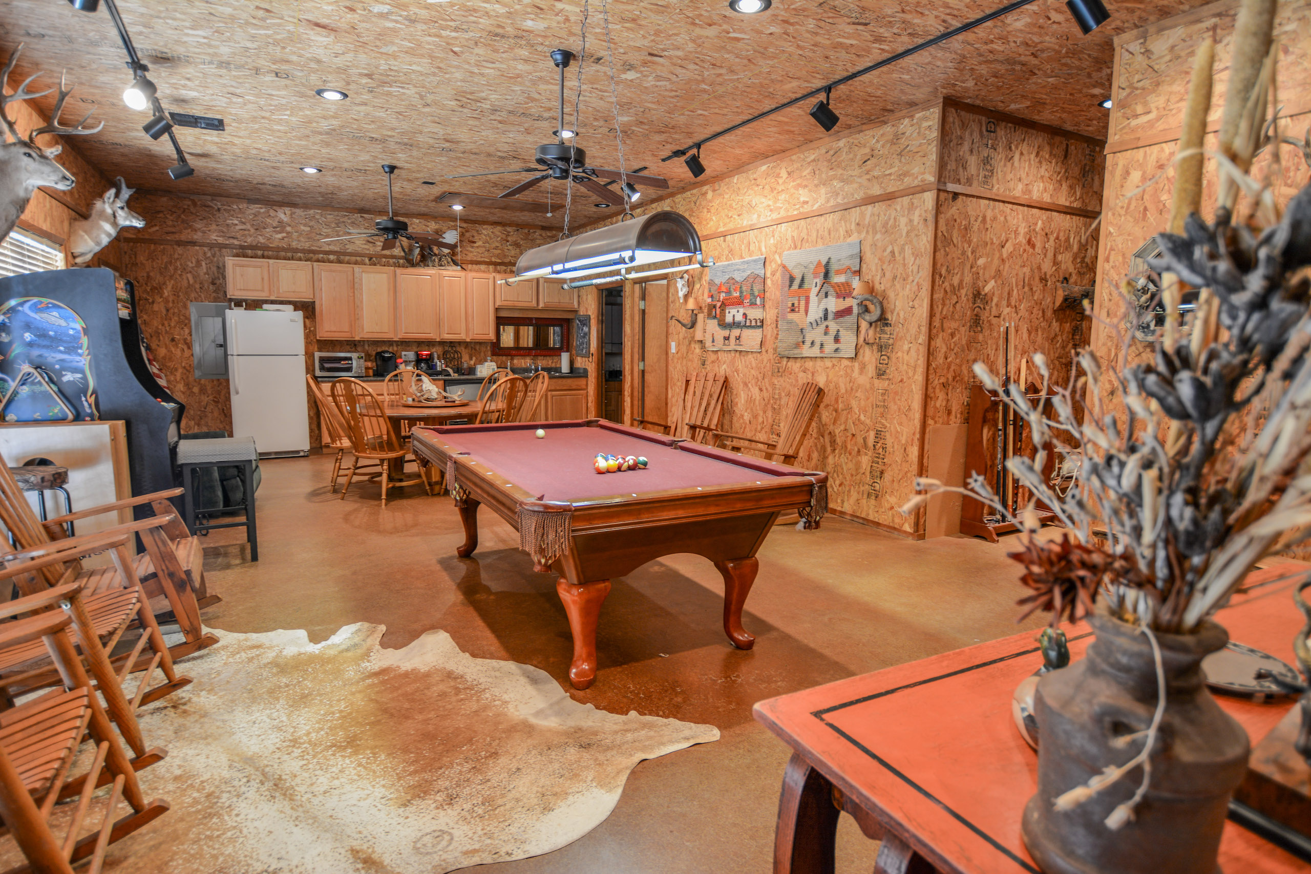 The guest lodge is perfect for entertaining hunting guests and extended family featuring approx. 1,500ft of living space with two bunk rooms, one full bath, and a large game room with couches/TV viewing for the big game, a pool table, a gun safe room, and a small kitchen. The lodge has approx 500 sqft of a covered concrete porch on the west side with a swinging bench to toast the evening sunsets.