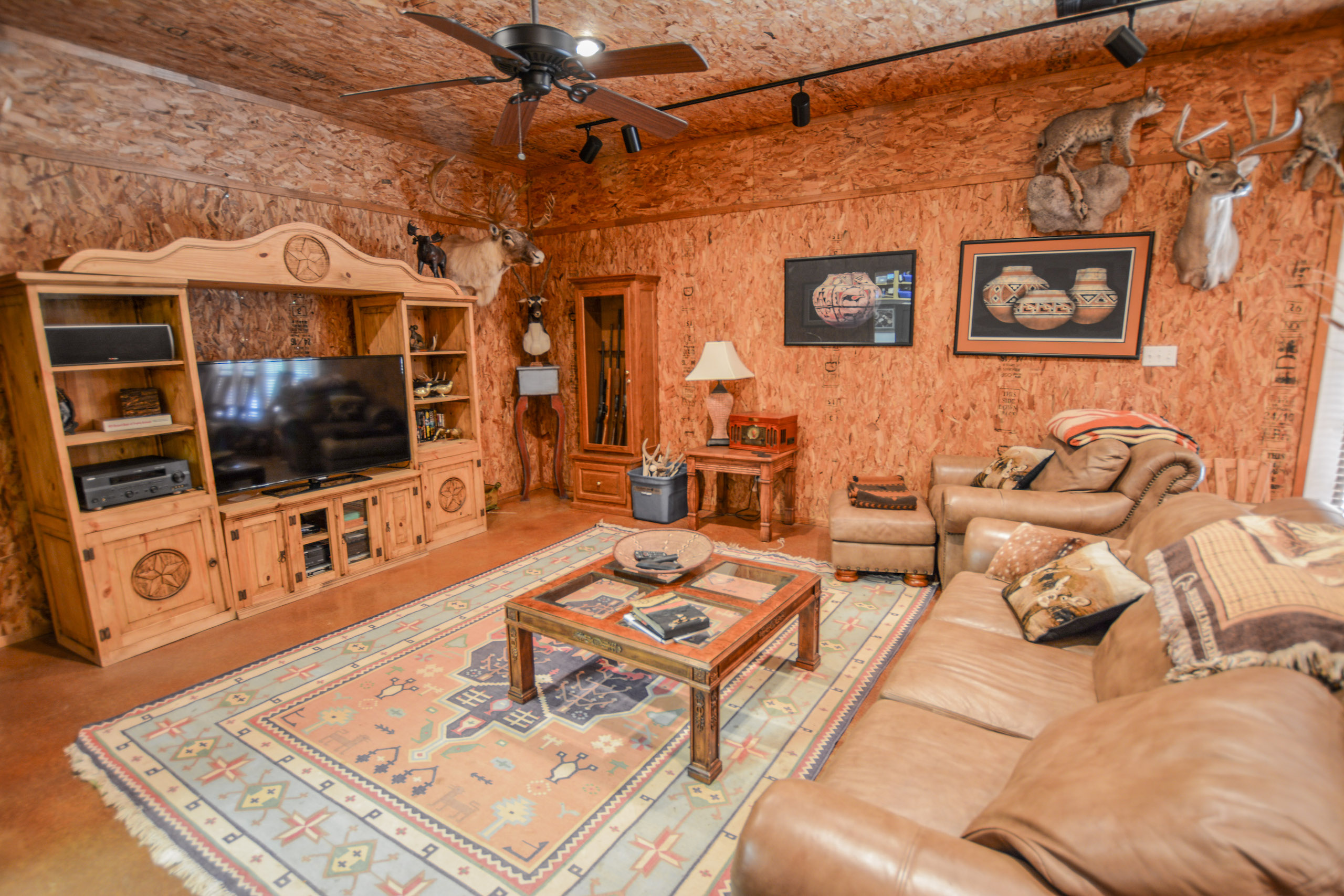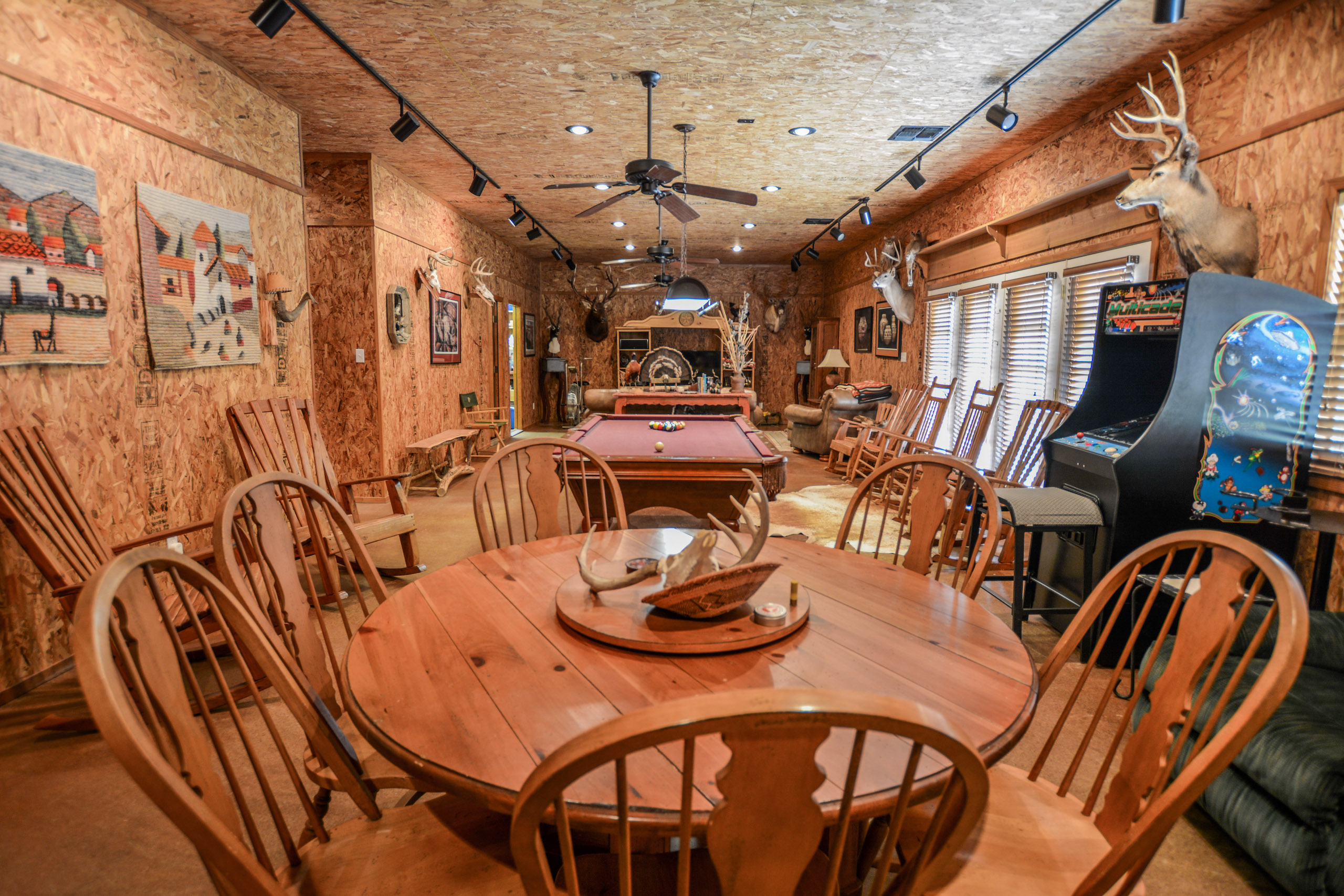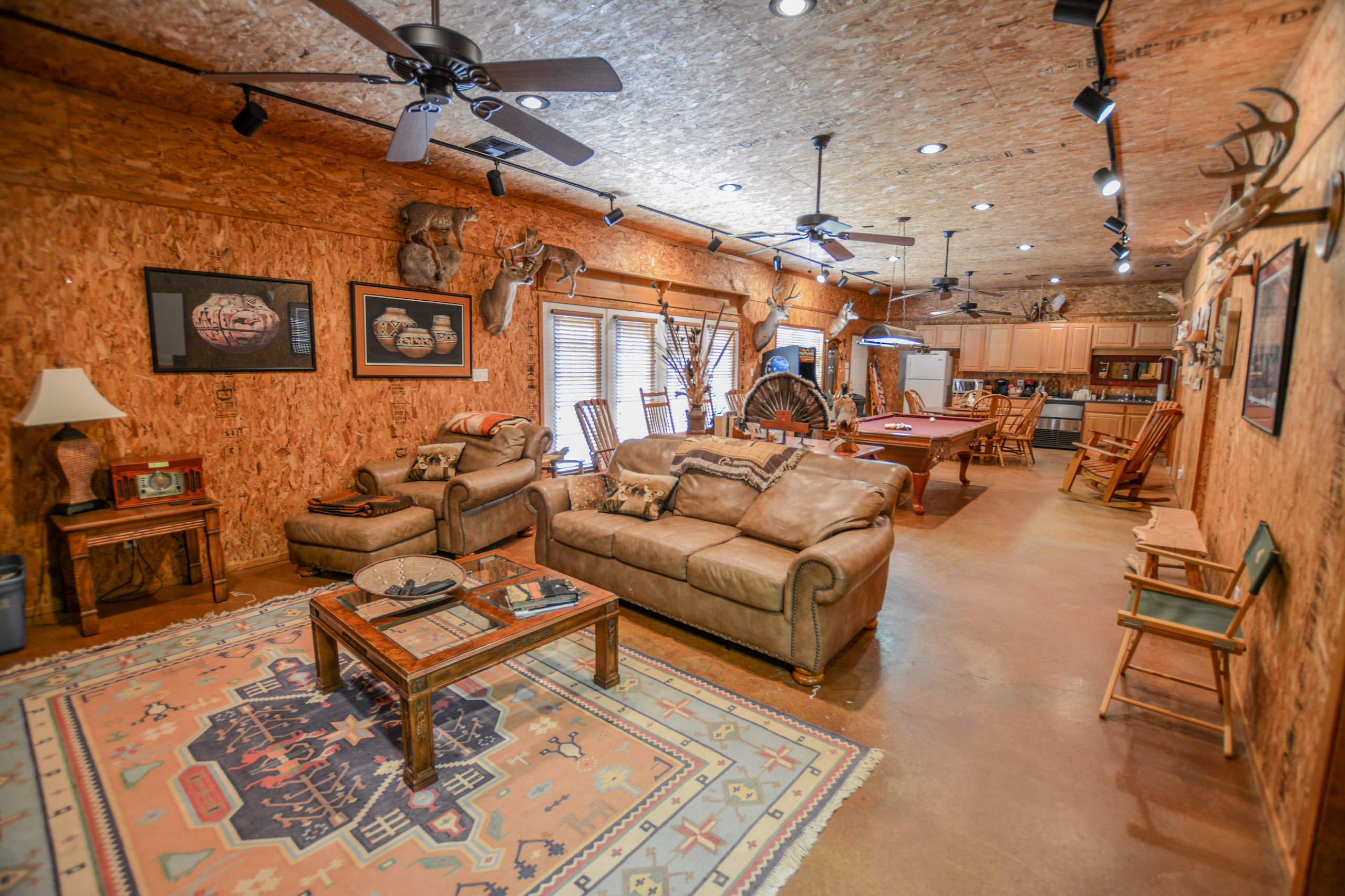 The guest lodge is perfect for entertaining hunting guests and extended family featuring approx. 1,500ft of living space with two bunk rooms, one full bath, and a large game room with couches/TV viewing for the big game, a pool table, a gun safe room, and a small kitchen. The lodge has approx 500 sqft of a covered concrete porch on the west side with a swinging bench to toast the evening sunsets.