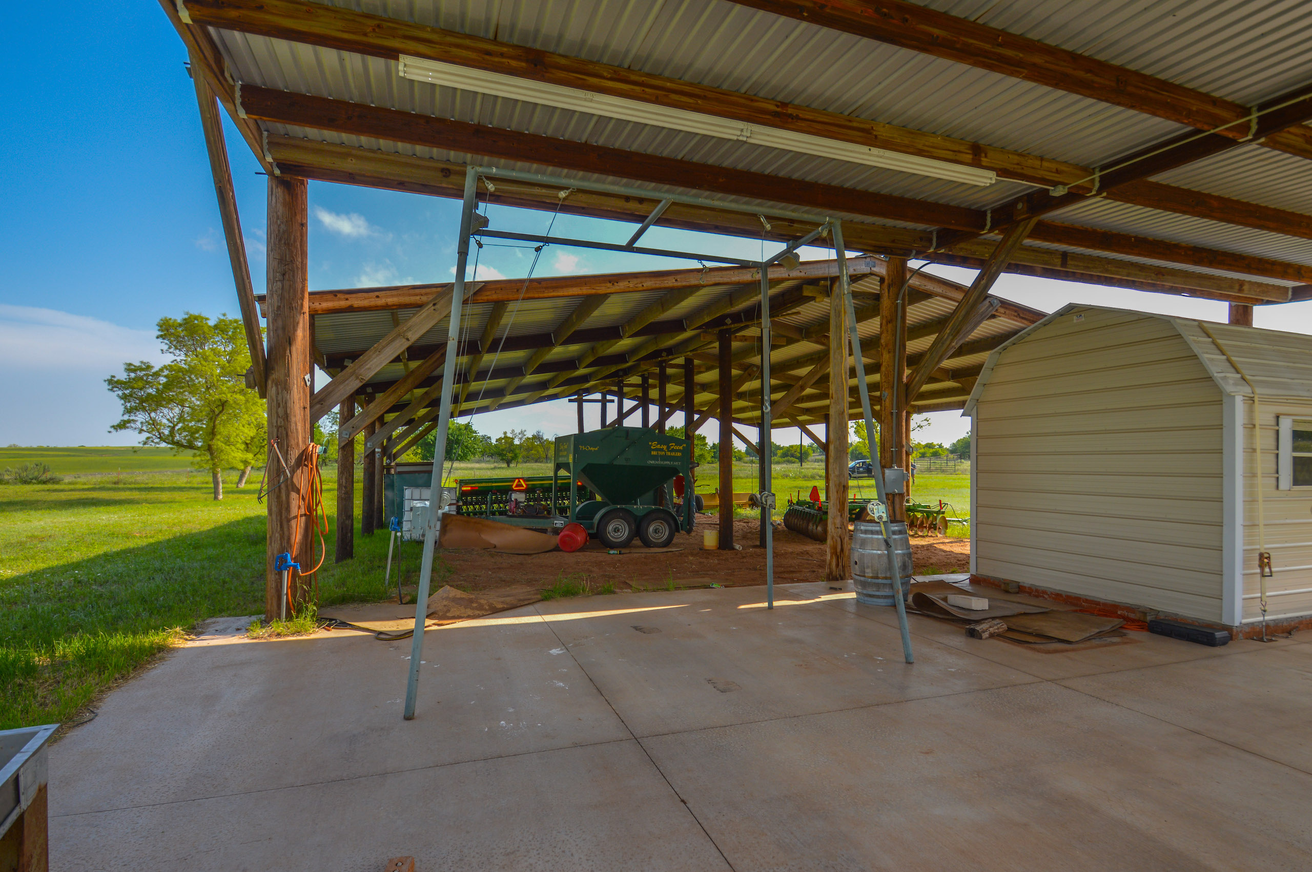 -Other features/structures on the property is a very large covered area for tractors, implements and various other equipment. This area has water and electricity and also serves as the main game cleaning station (skinning racks, etc). A railroad container is located in this area and is insulated and sealed for storing protein, corn, etc.