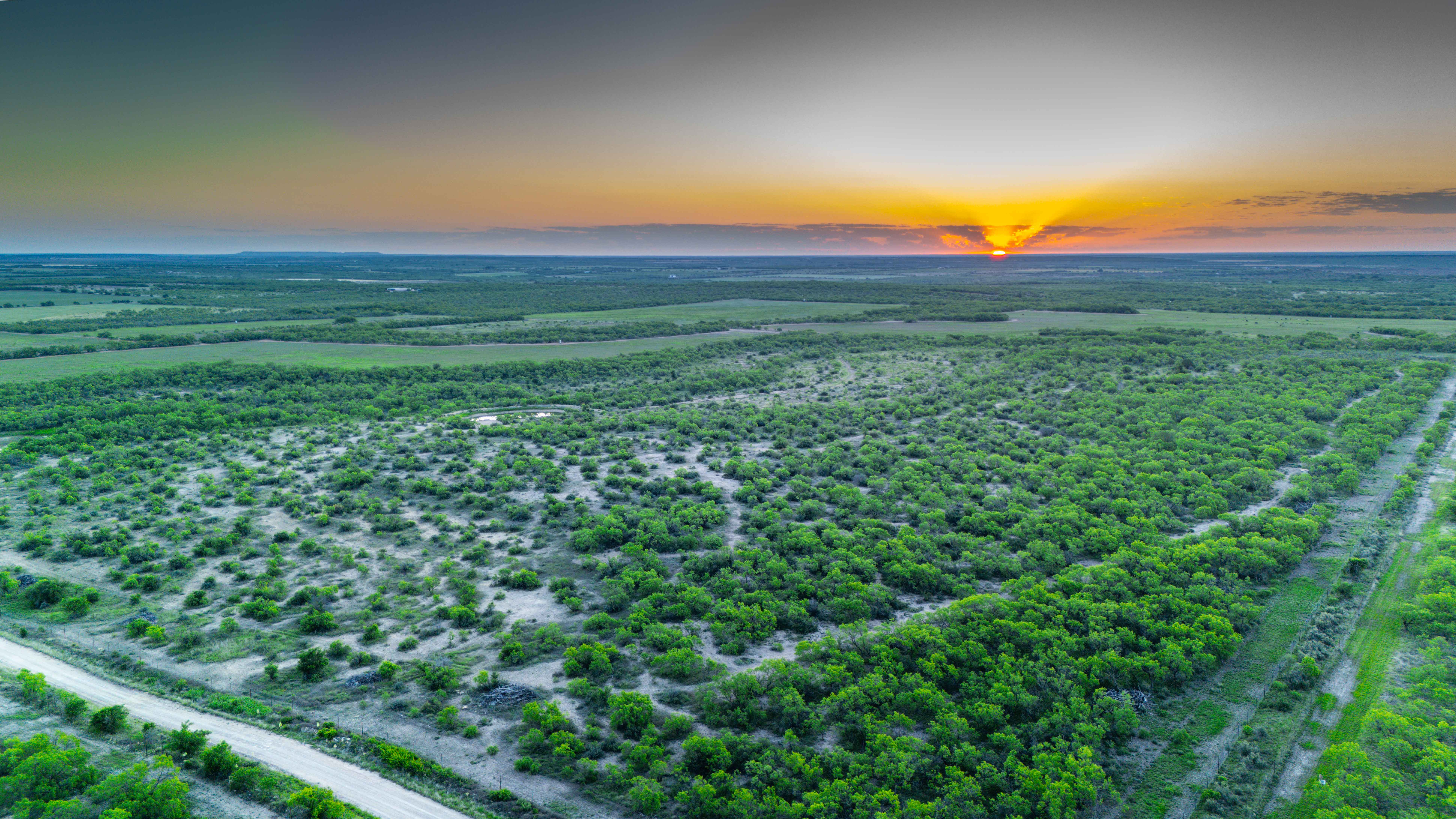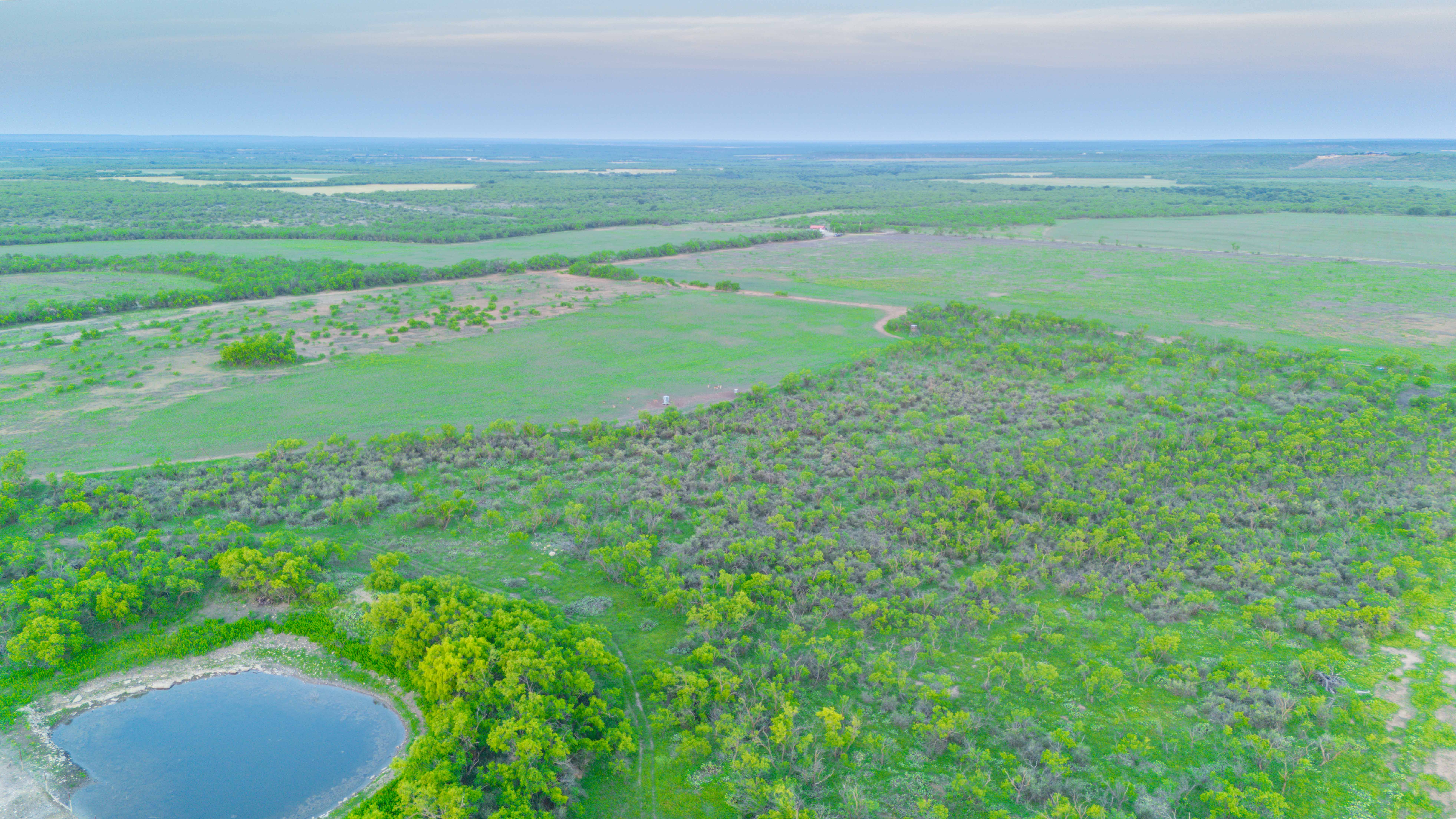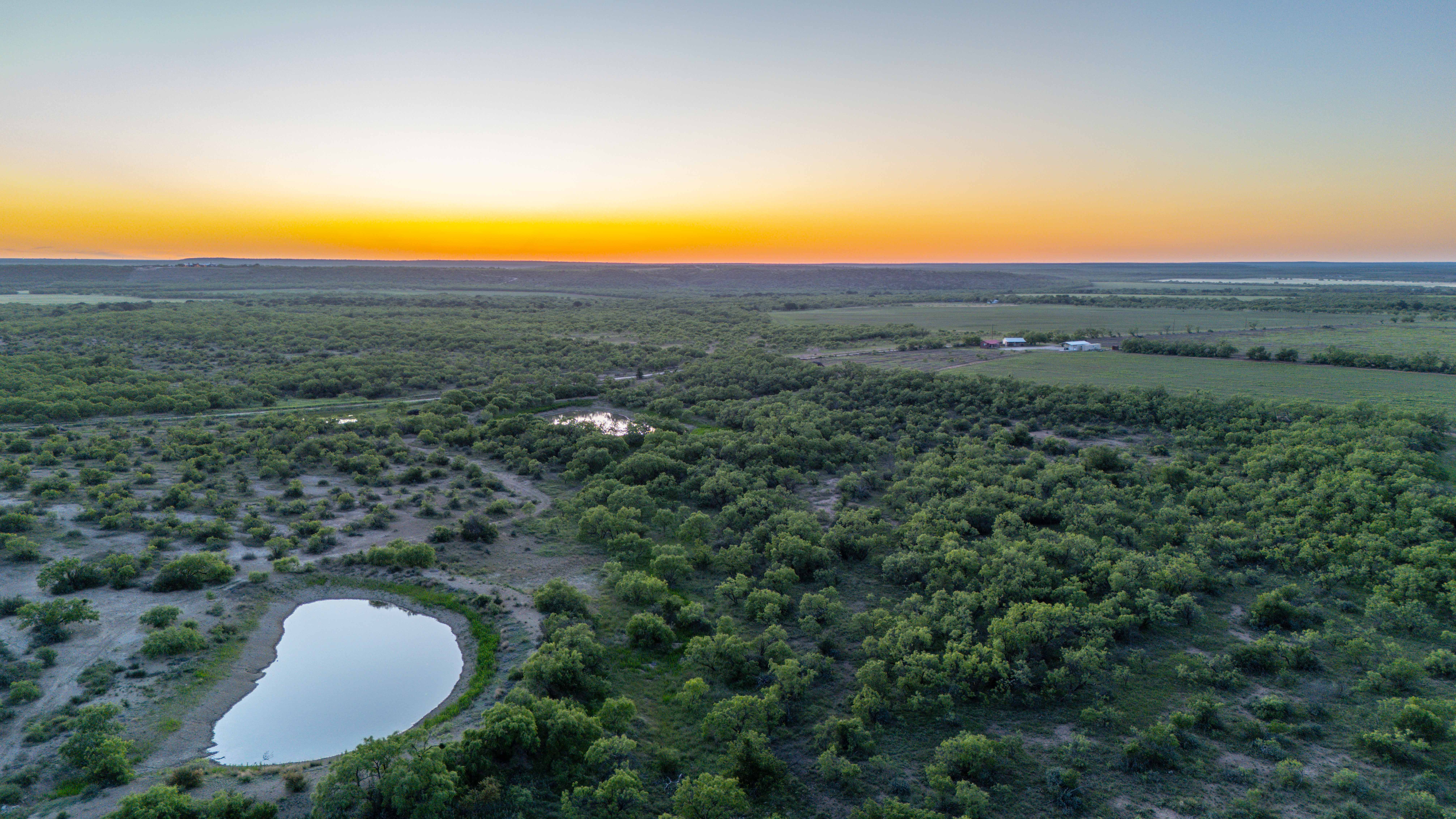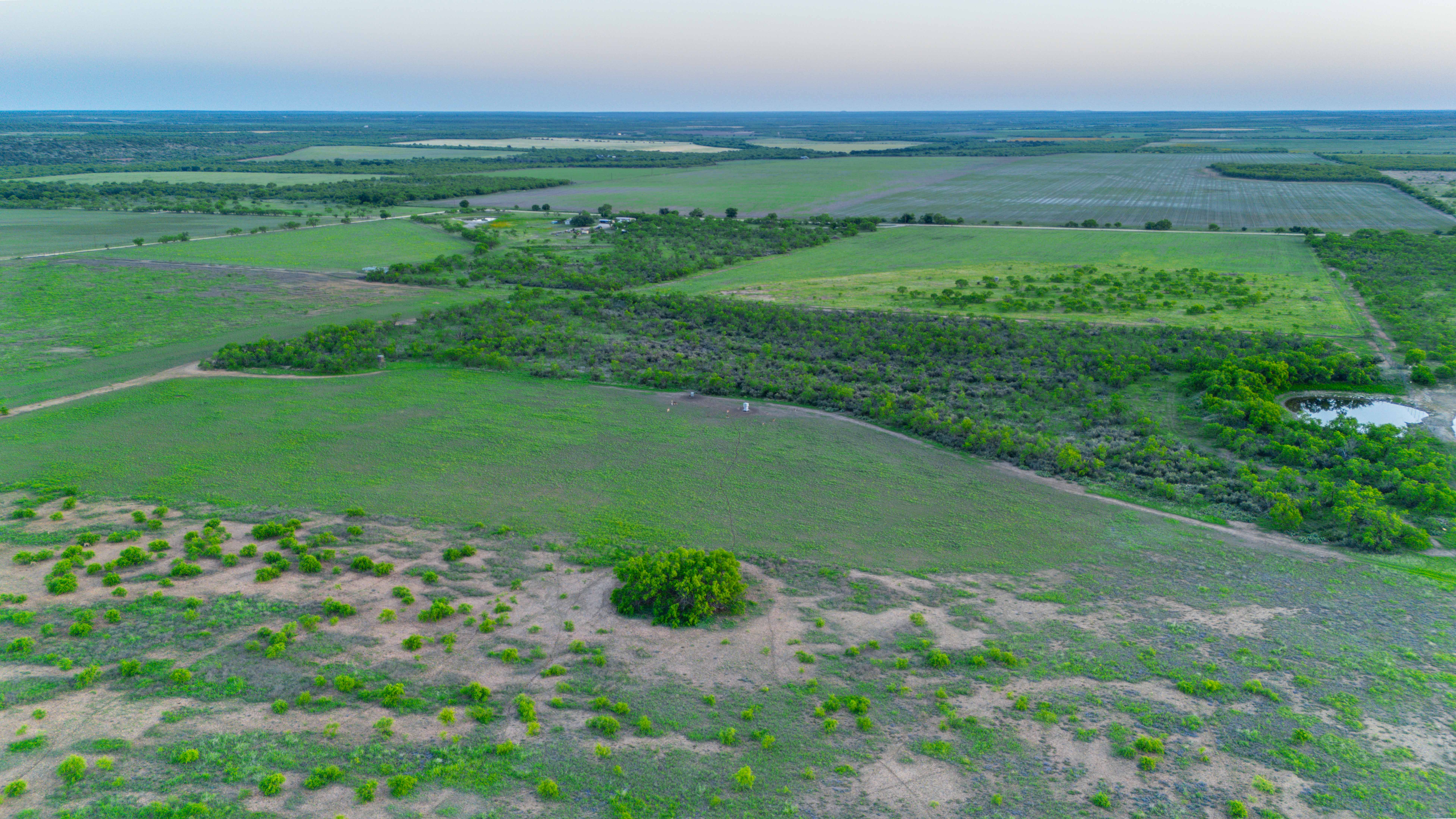 The land features a mixture of native grassland, brush, and cleared areas that have been carefully managed for soil health and wildlife productivity. The elevation ranges from approximately 1,510 to 1,540 feet above sea level, creating mild topography and visual appeal throughout the property. Three earthen ponds are located across the ranch, with the largest on the western side stocked with catfish and perch. A wet-weather drainage flows westward across the tract, feeding two of the ponds and enhancing the overall surface water system. The average annual rainfall in this part of Coleman County is about 20 inches.