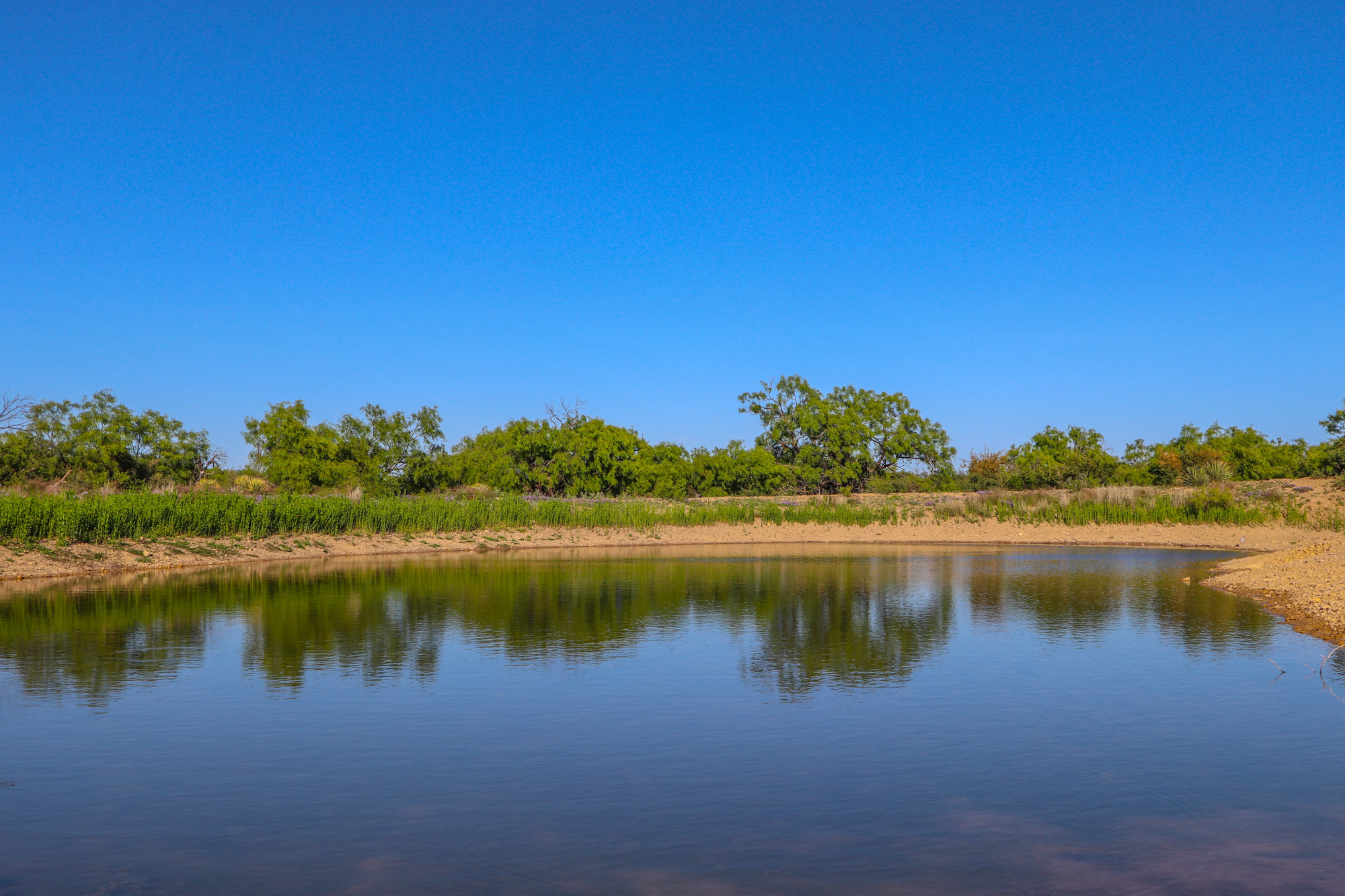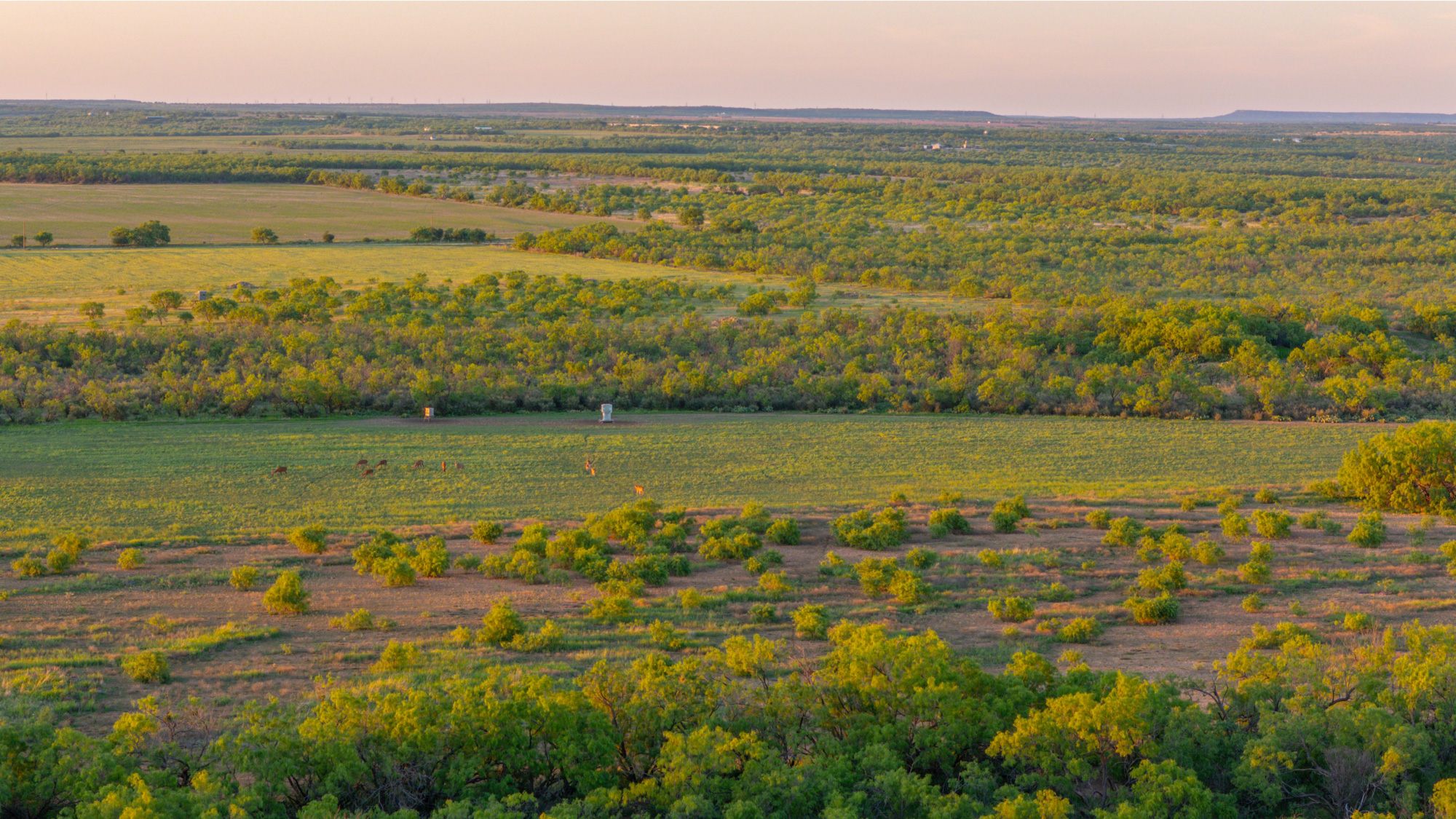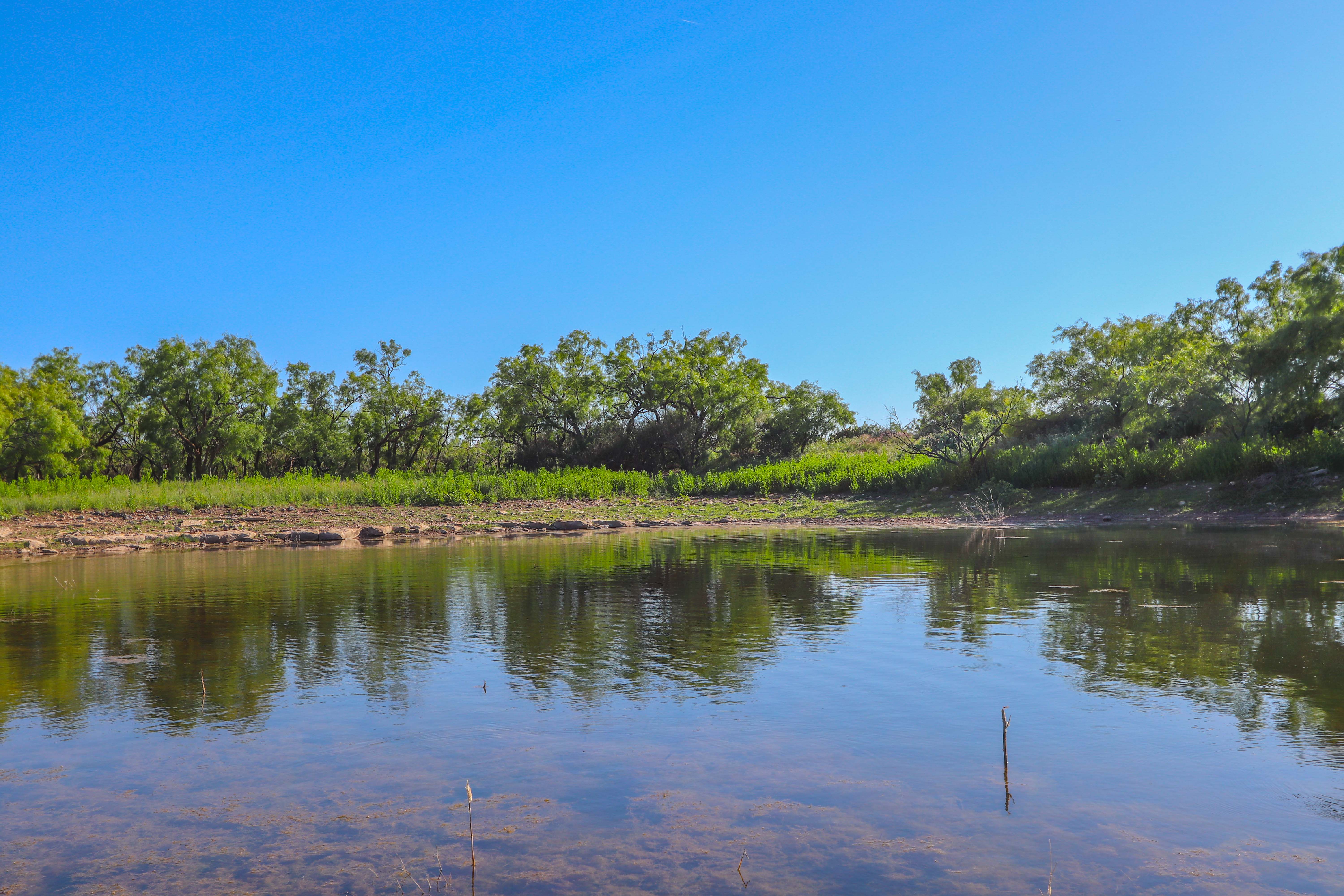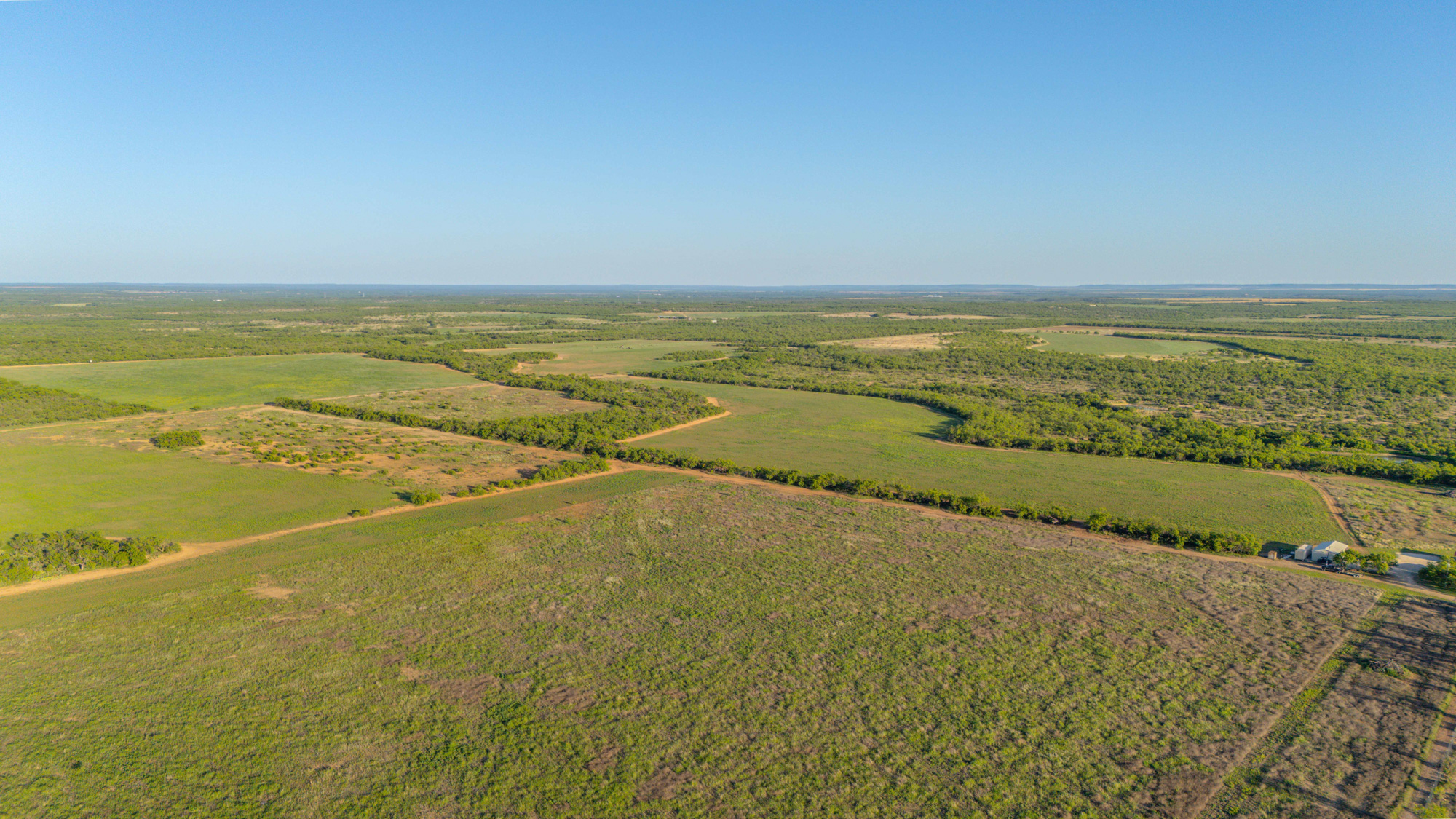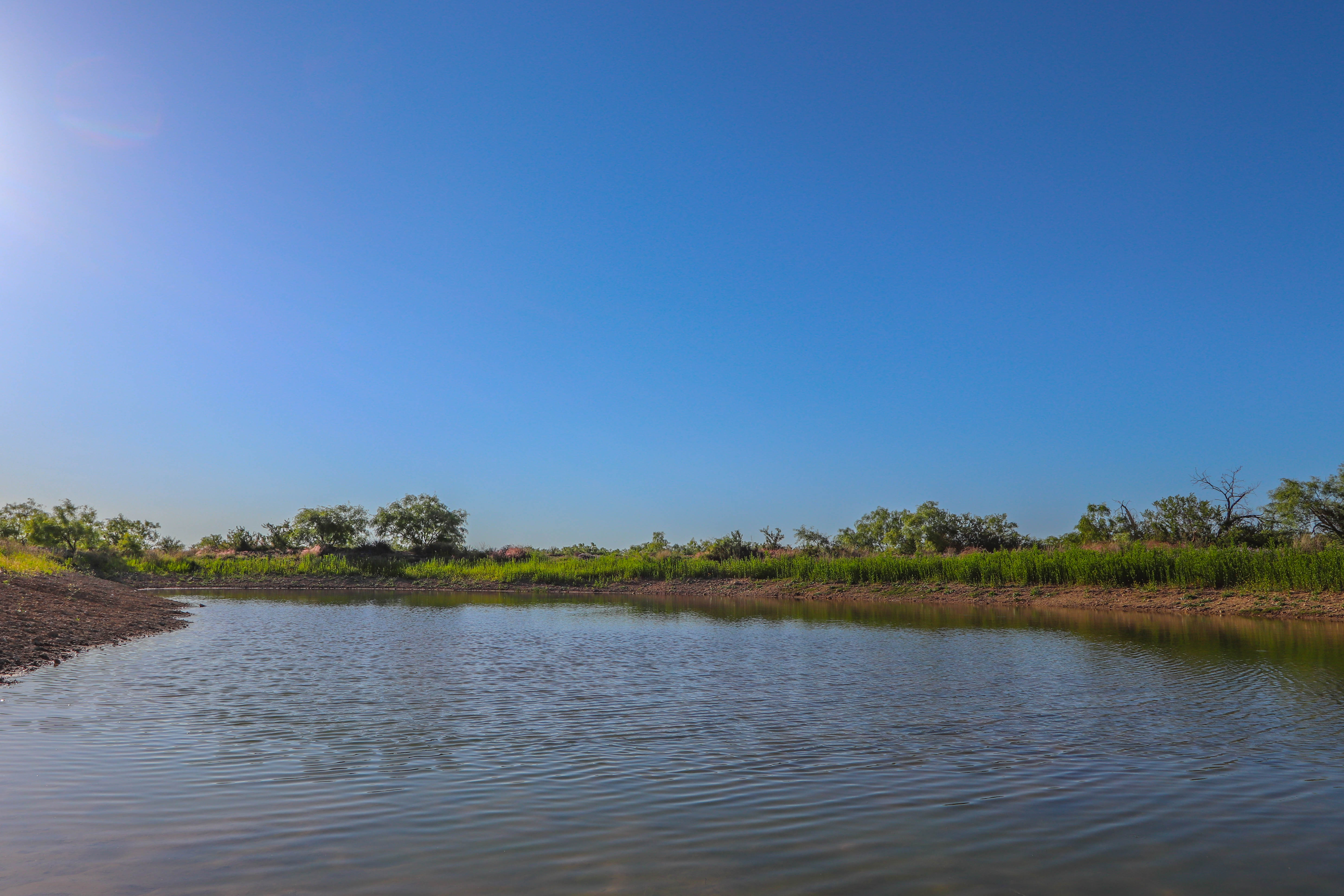 The land features a mixture of native grassland, brush, and cleared areas that have been carefully managed for soil health and wildlife productivity. The elevation ranges from approximately 1,510 to 1,540 feet above sea level, creating mild topography and visual appeal throughout the property. Three earthen ponds are located across the ranch, with the largest on the western side stocked with catfish and perch. A wet-weather drainage flows westward across the tract, feeding two of the ponds and enhancing the overall surface water system. The average annual rainfall in this part of Coleman County is about 20 inches.