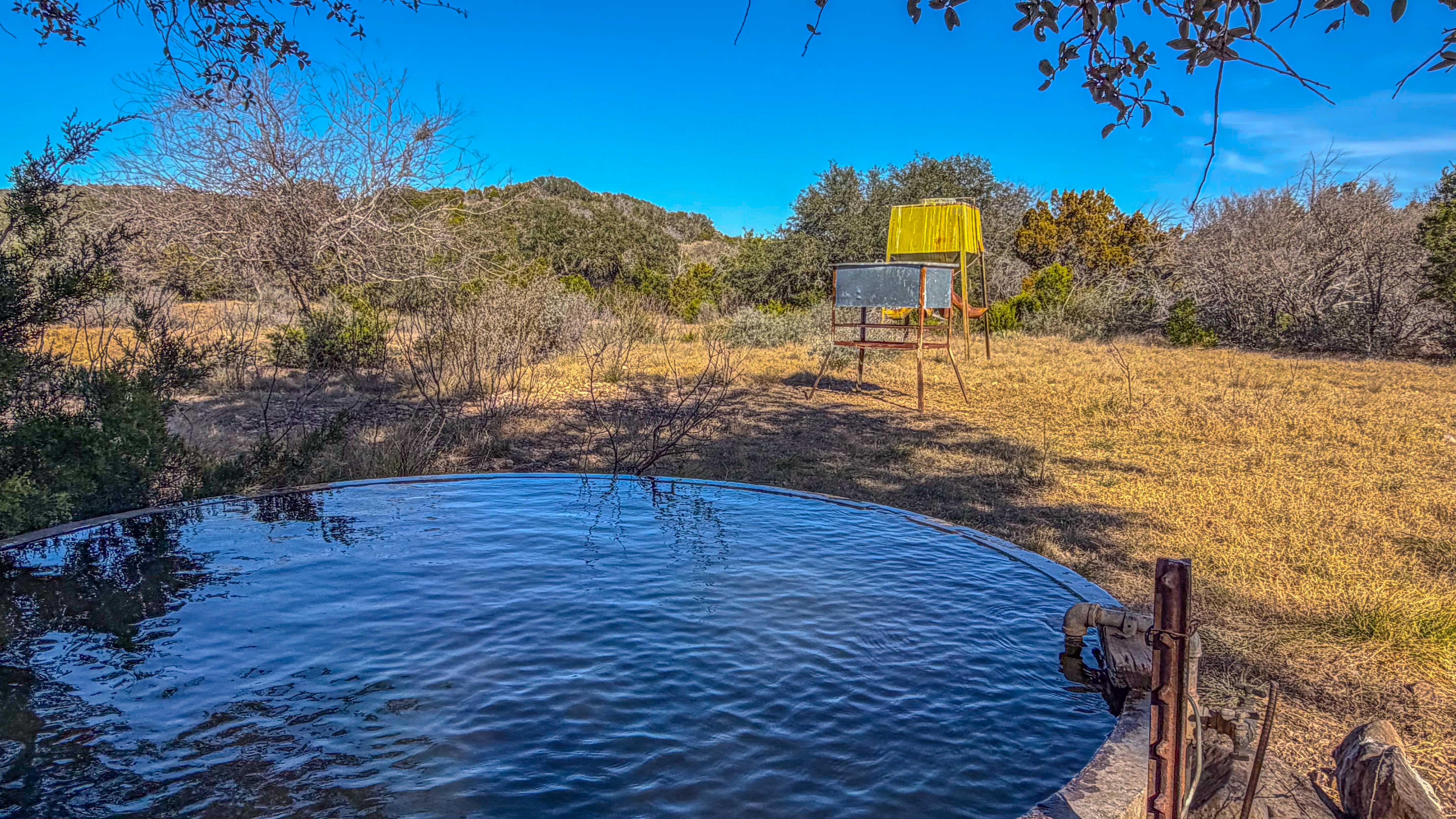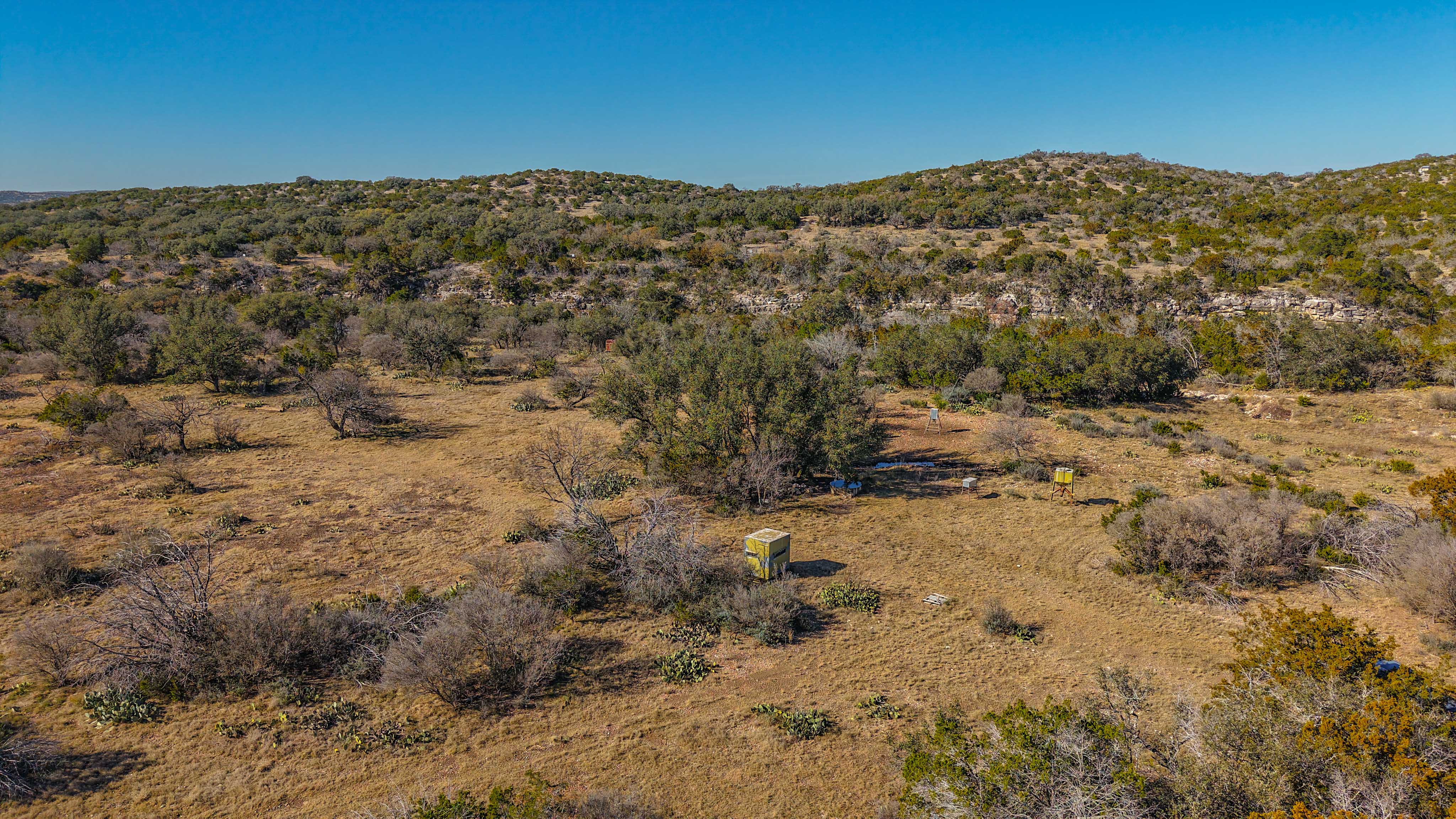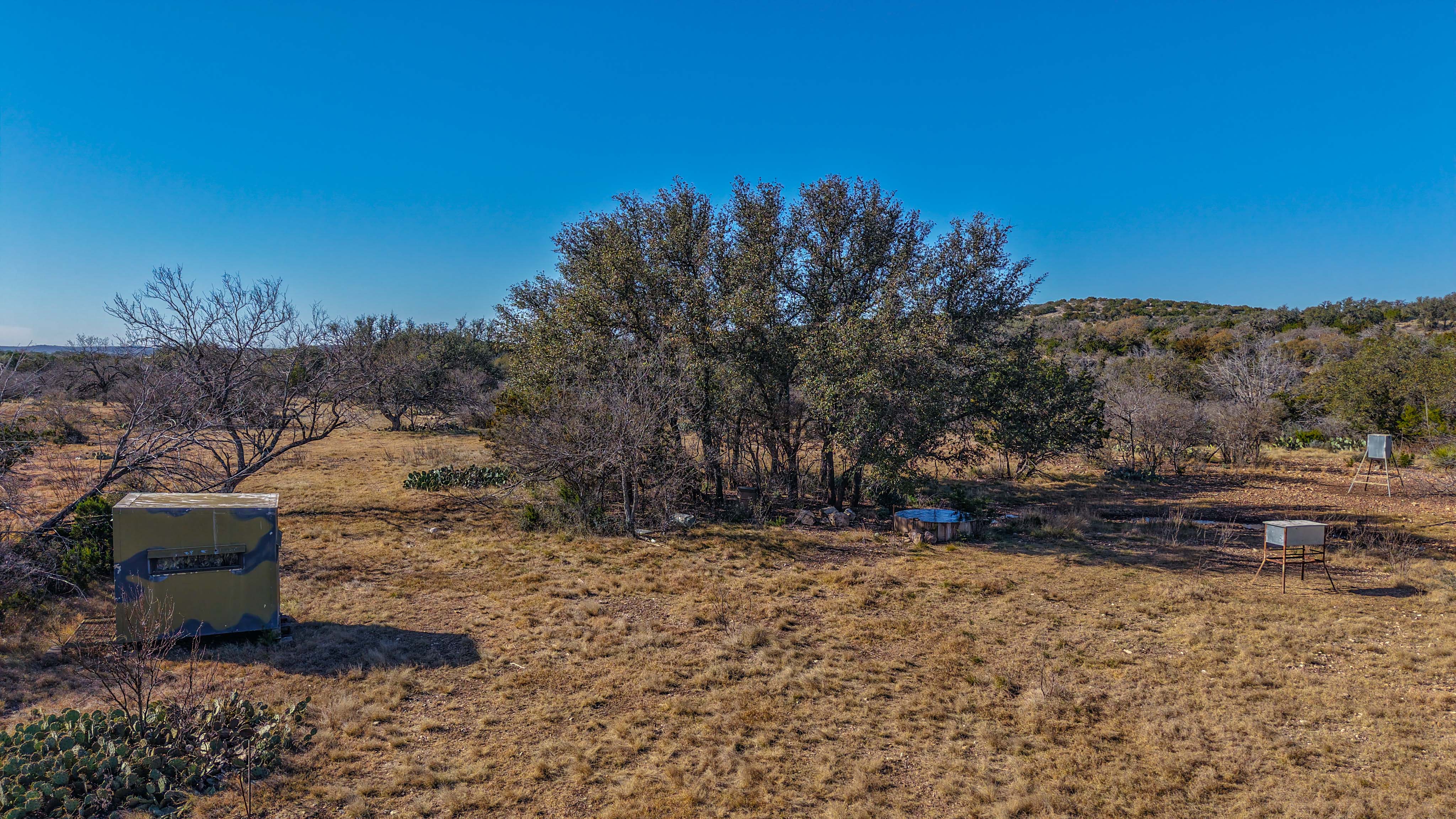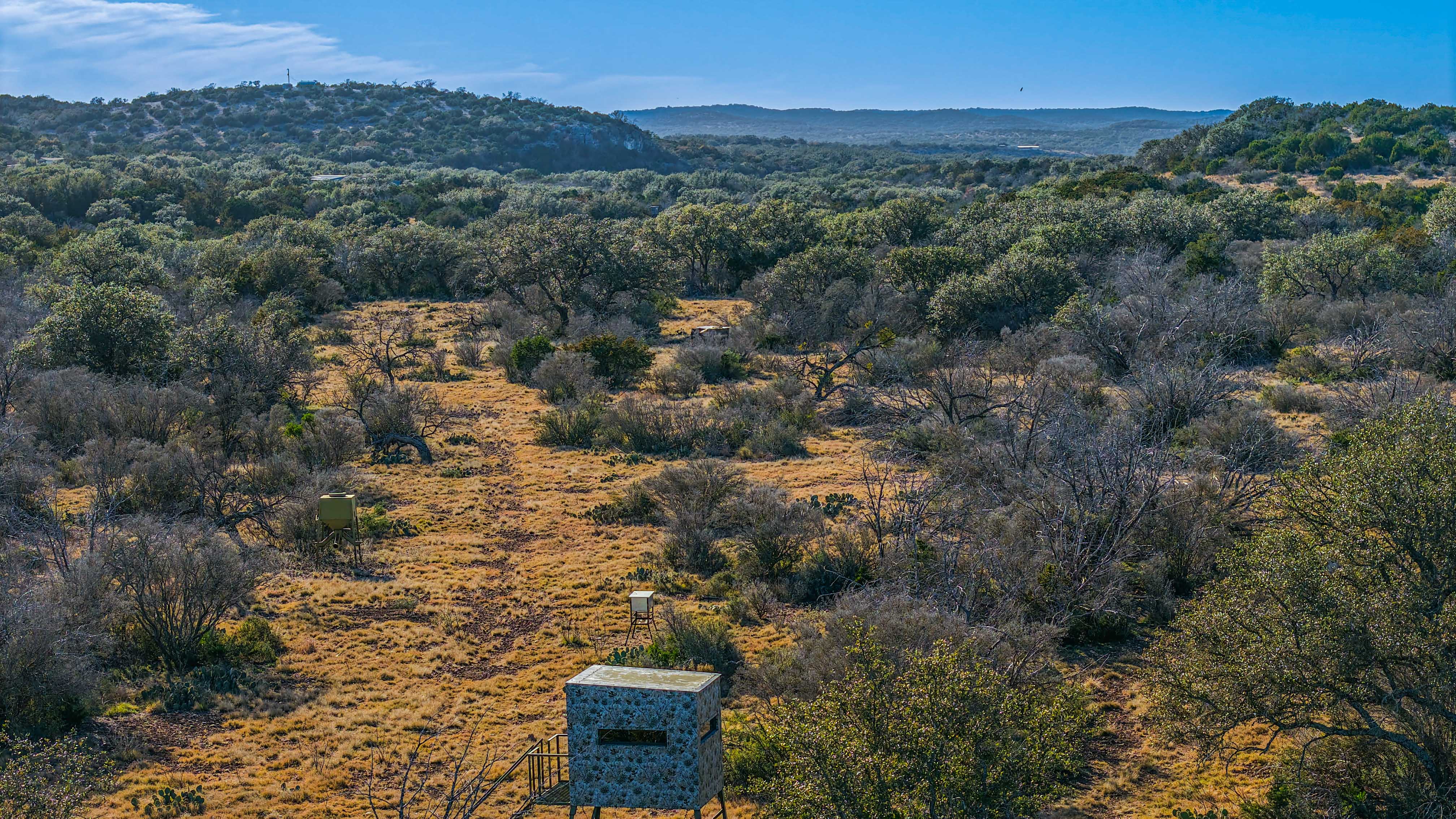 Thick native brush and varied elevation changes provide ideal habitat for whitetail deer, hogs, and axis, all of which are well established on the ranch. Feeders and blinds are already in place, along with two wildlife water troughs, making this a turnkey hunting setup. The property is mostly high-fenced, helping maintain healthy game populations.