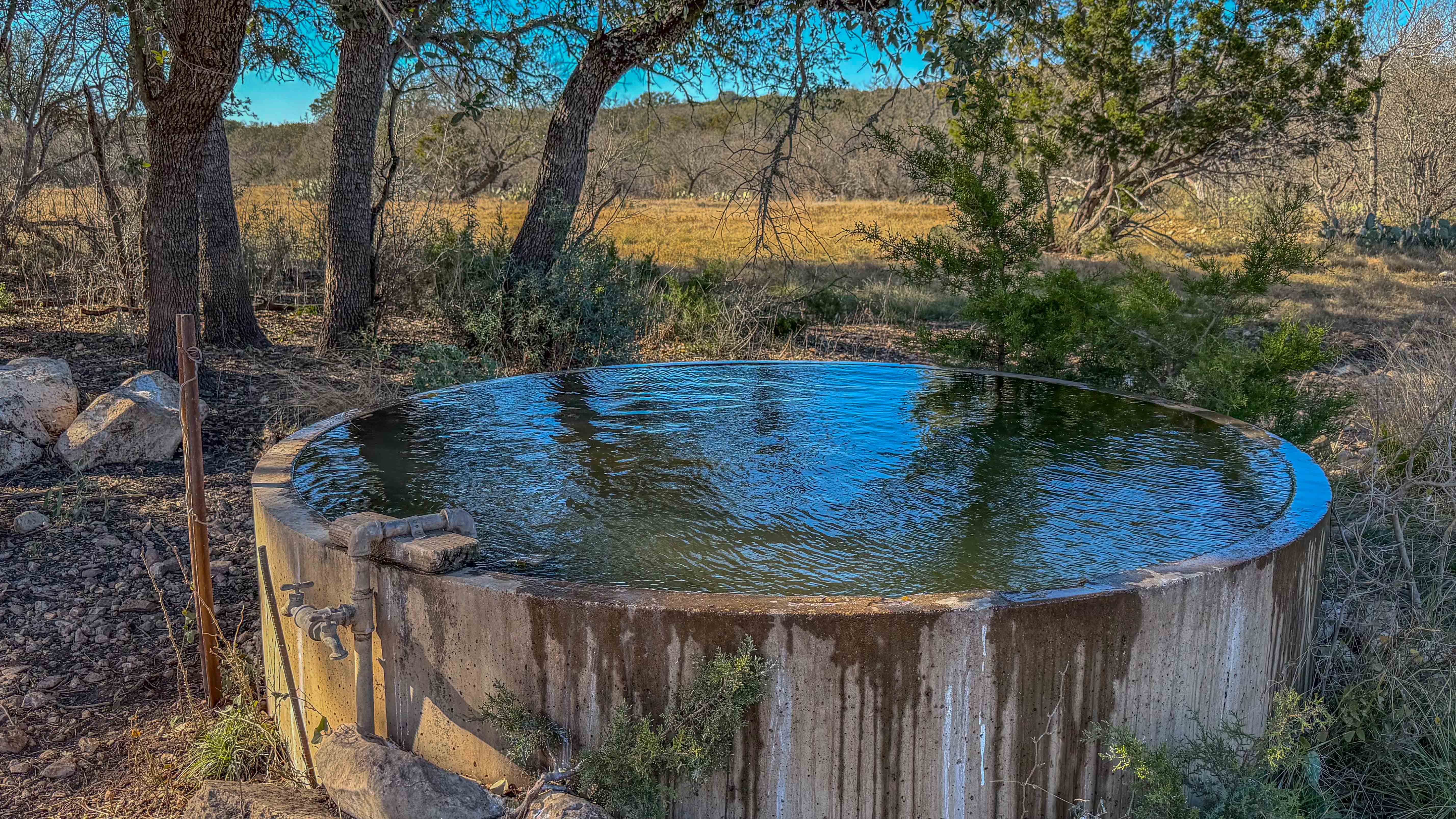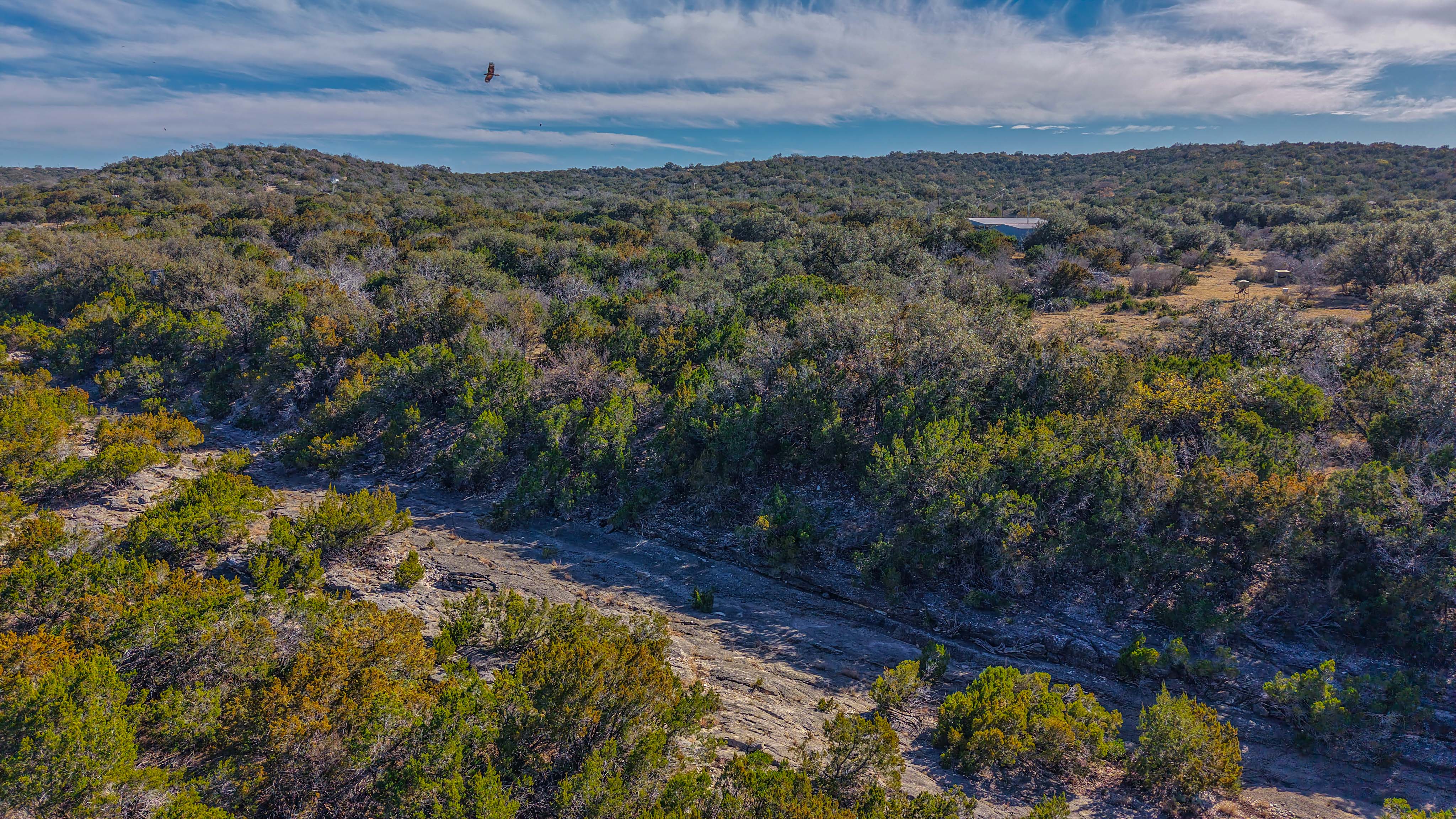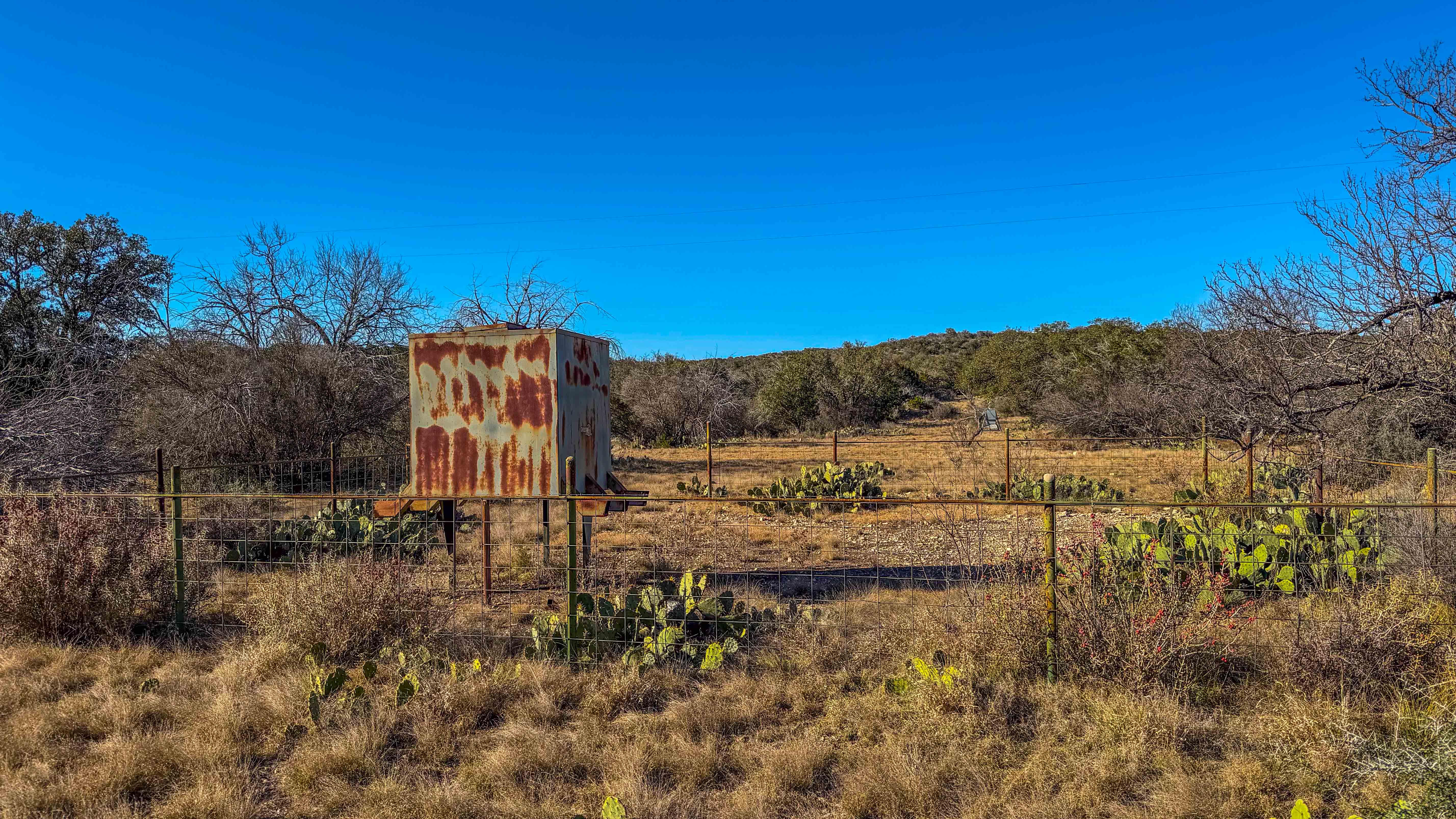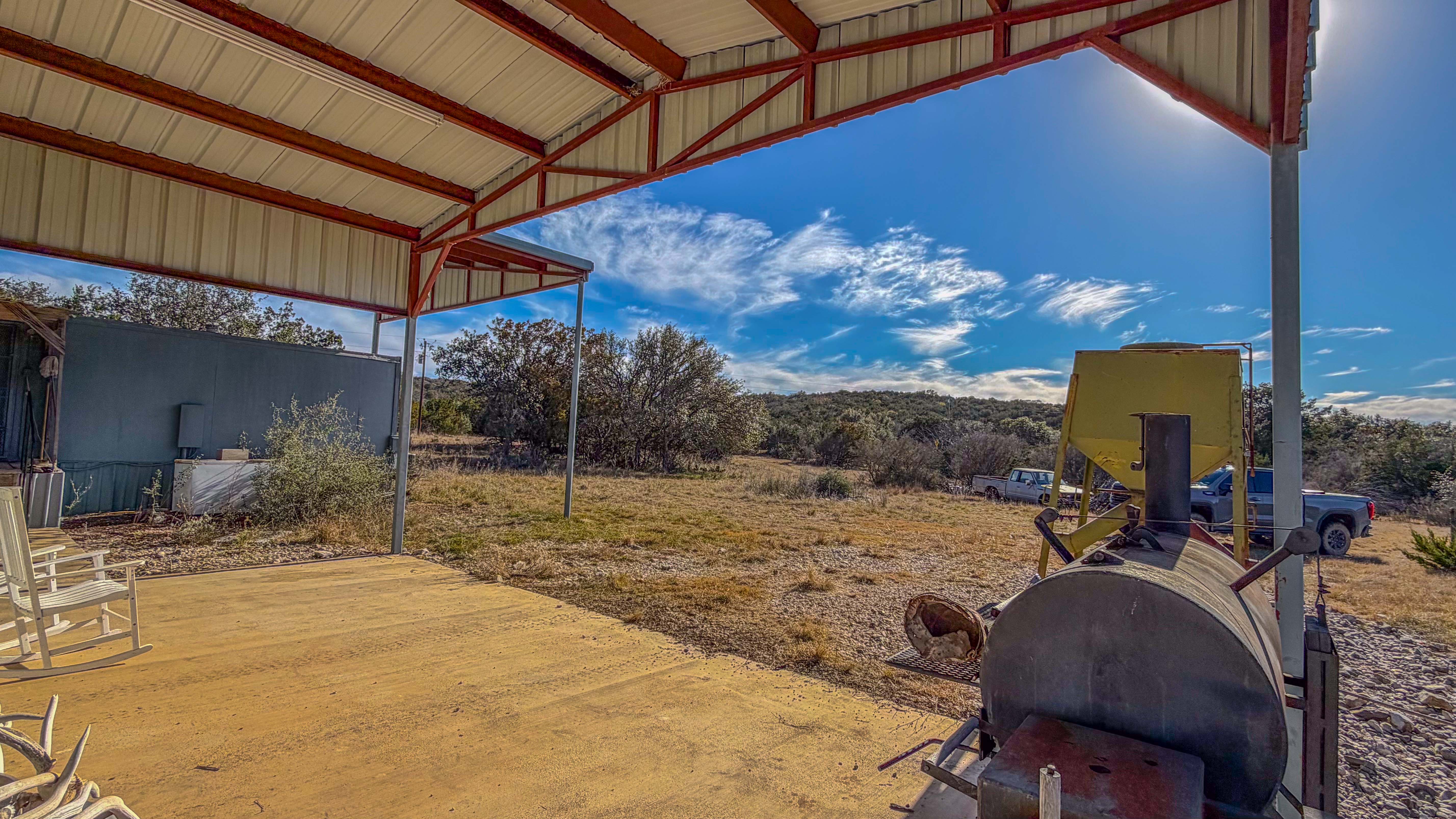 Thick native brush and varied elevation changes provide ideal habitat for whitetail deer, hogs, and axis, all of which are well established on the ranch. Feeders and blinds are already in place, along with two wildlife water troughs, making this a turnkey hunting setup. The property is mostly high-fenced, helping maintain healthy game populations.