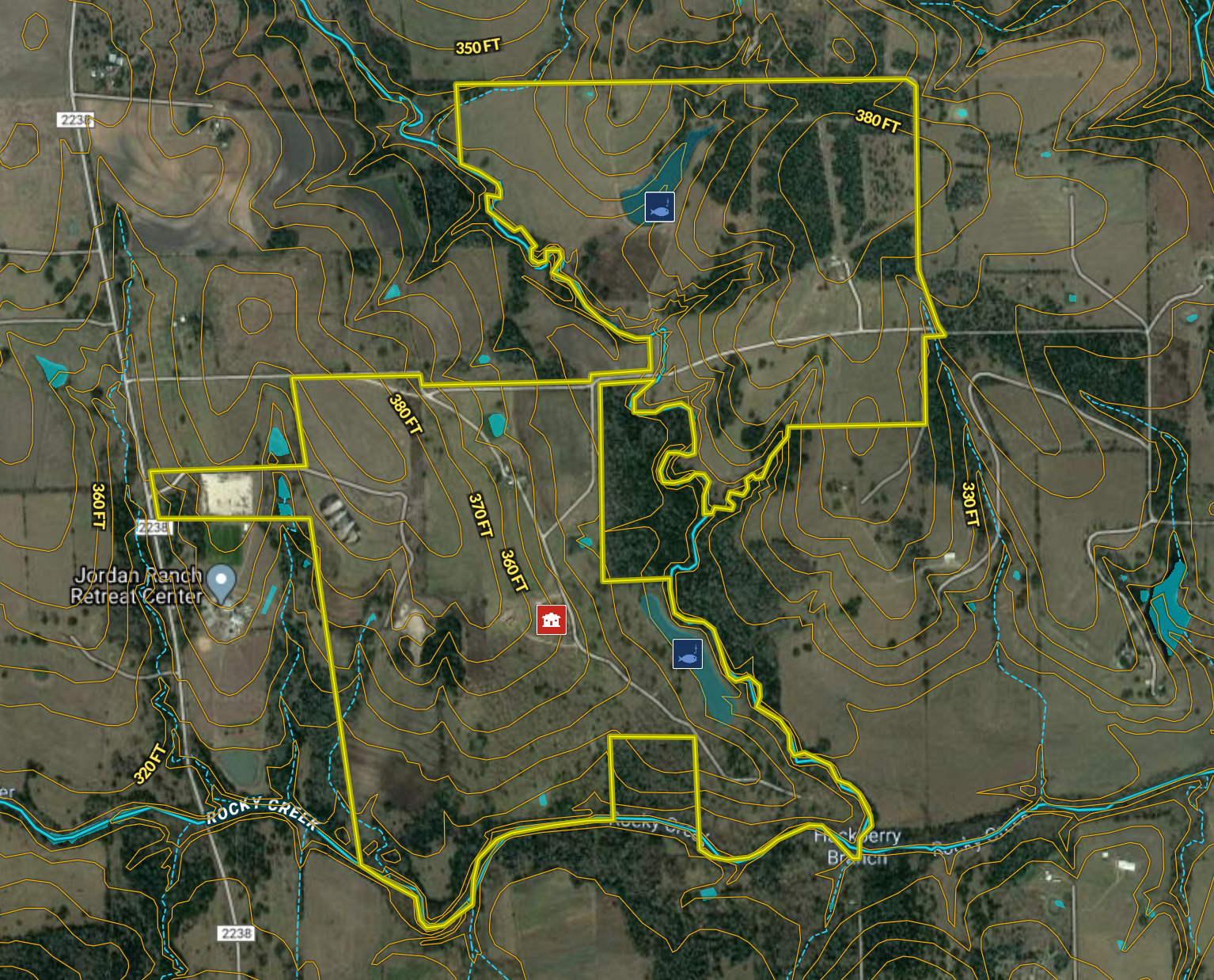 Surface water is abundant on the ranch. There are multiple ponds and lakes, highlighted by two main fishing lakes, each approximately 5-6 acres in size. Both lakes have been stocked with bass and feature large fishing piers with railings for any age to enjoy safely, as well as automatic fish food feeders to attract the fun. A smaller lake is a great catfish pond. Multiple water wells exist on the ranch, providing water to the various lodging facilities, in addition to supplemental wells that keep the lakes full and feed the concrete cattle troughs. Rocky Creek runs along the southern boundary of The Scissortail and Hackberry Branch runs through the middle of the ranch for excellent recreational and scenic creek footage.