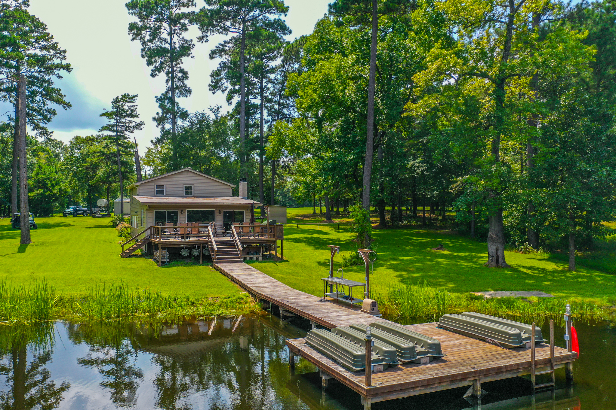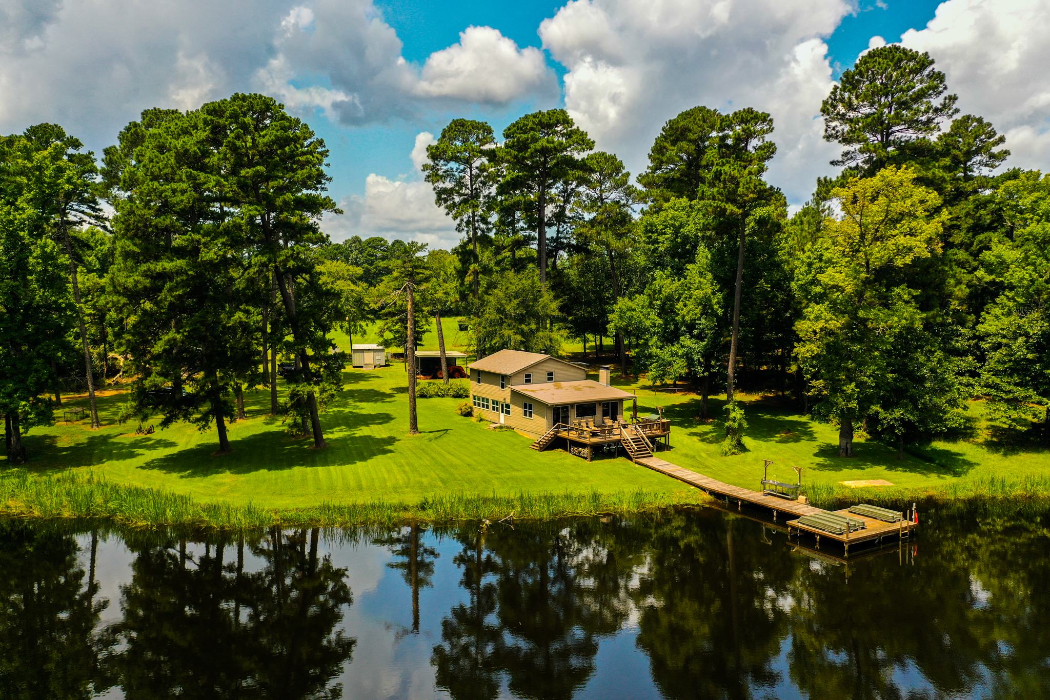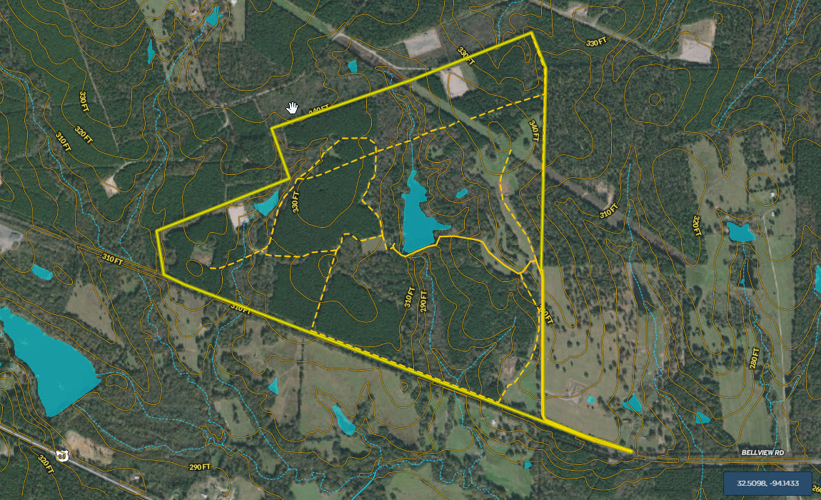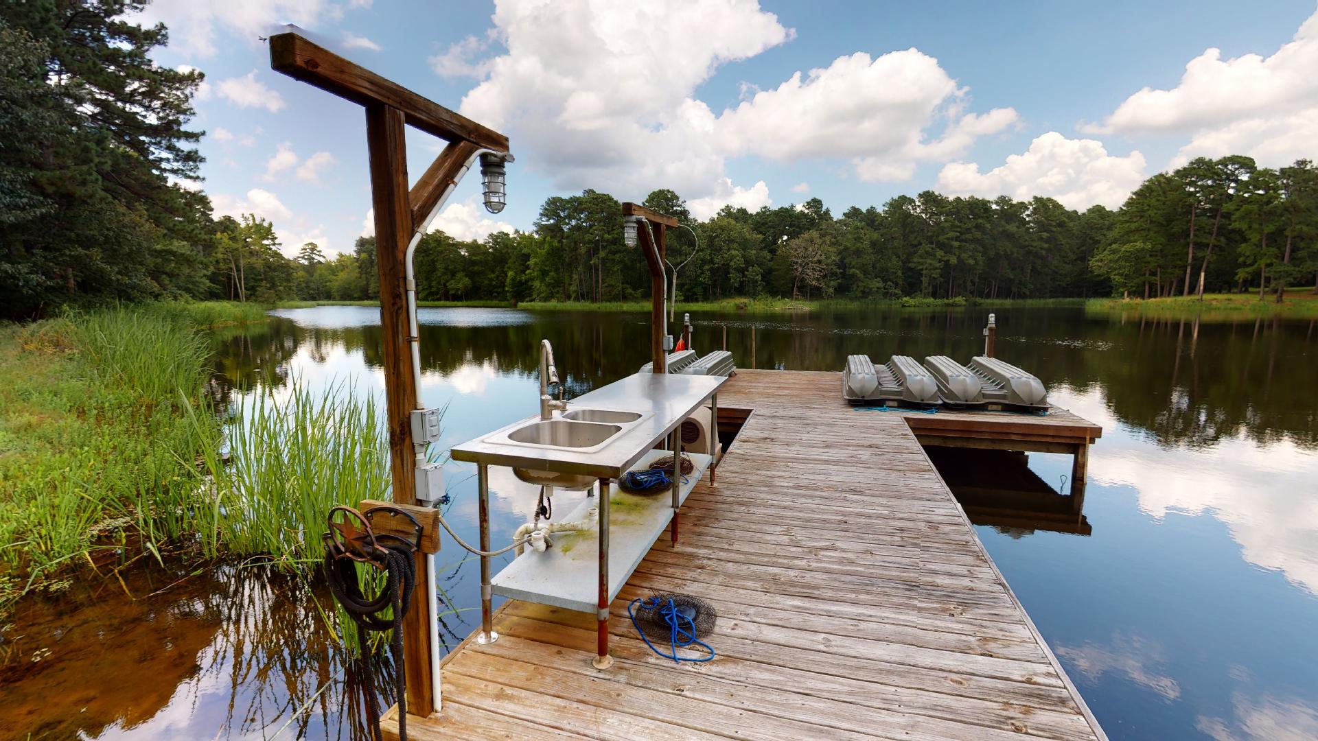 Escape the city to this gorgeous, peaceful country retreat. Very secluded yet only three minutes off of I20 between Marshall and Shreveport in NE Texas! Only 30 minutes to the riverfront portion of Shreveport and all that it offers - this property offers the peace and quiet of the woods and access to goods, services and entertainment. Enjoy wildflowers in the springtime, colorful leaves in the fall and a wide variety of songbirds and whitetail deer year-round from the wood deck overlooking a picturesque, stocked pond. ATV or walking trails cleared throughout the property. This turnkey property is move-in ready with all furnishings available. Spend a night and you’ll never want to leave! The land itself is mostly wooded with a variety of mature, mixed hardwoods, planted pine timber, rolling pastures and a very nice, centrally located 8.5-acre lake. Elevation on the property ranges from an approximate low of 280’ ASL to an approximate high of 350’ ASL. The planted pine timber is estimated to be approximately 12 years old is estimated to cover approximately 160 acres of the property. The lake is a reservoir-style lake with an earthen dam, pipe drain and earthen spillway. It is situated in the central portion of the property with tree-lined shores and apparent good depth and water quality. The owners report good historic fishing with some limited waterfowl opportunities. The combination of the dense timber, creeks and even a second small pond results in great wildlife potential. The property basically has dead-end type access so privacy is at a premium here. Improvements consist of a 3 / 2 frame cabin situated on the western shore of the lake. This well-appointed structure features a large open concept kitchen/living room/dining area as well as a second recreational room/den and three bedrooms upstairs. The structure opens onto a wood deck overlooking the lake with a wood deck walkway connecting the pier. The pier has a fish cleaning station and plenty of deck space to fish and enjoy the view. The area surrounding the cabin is also improved with a two-car carport, a storage building and a water well. LOCATION: The property is located off of Birdwell Lane just north of I20. Take exit 628 from DFW and go north of Birdwell Lane, cross railroad tracts to the entrance of the property. GPS Coordinates are as follows: 32.501955, -94.501955