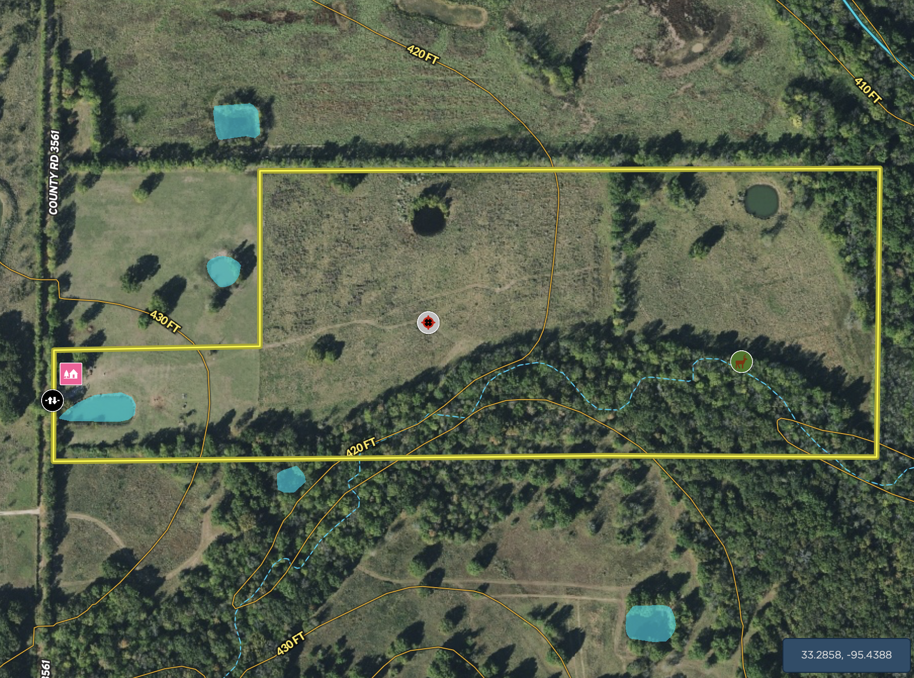 Driving through the gated entry, you will find the hunting place you’ve been waiting for. There is a quaint one-bedroom cabin, complete with a bathroom, kitchen, a large front porch and a wood-burning fireplace. From the front porch of the cabin, you can overlook the sprawling acreage and beautiful hay meadow. There is a stocked pond next to the driveway, contoured by a wooden fence. Part of the property is enrolled in the Wetlands Reserve Program (WRP) and has had duck impoundments installed and multiple species of oak trees planted. This program does a good job at what it is designed to do and that’s to improve habitat. A large creek and several ponds provide water for the wildlife while the diverse landscape of pastures, thickets and forests provide the cover and food. There are multiple hunting spots on the property complete with top-quality deer blinds, feeders and food plots. Located only 1.5 hours from DFW metro, this place is one you should not pass up. Call today to see it for yourself.