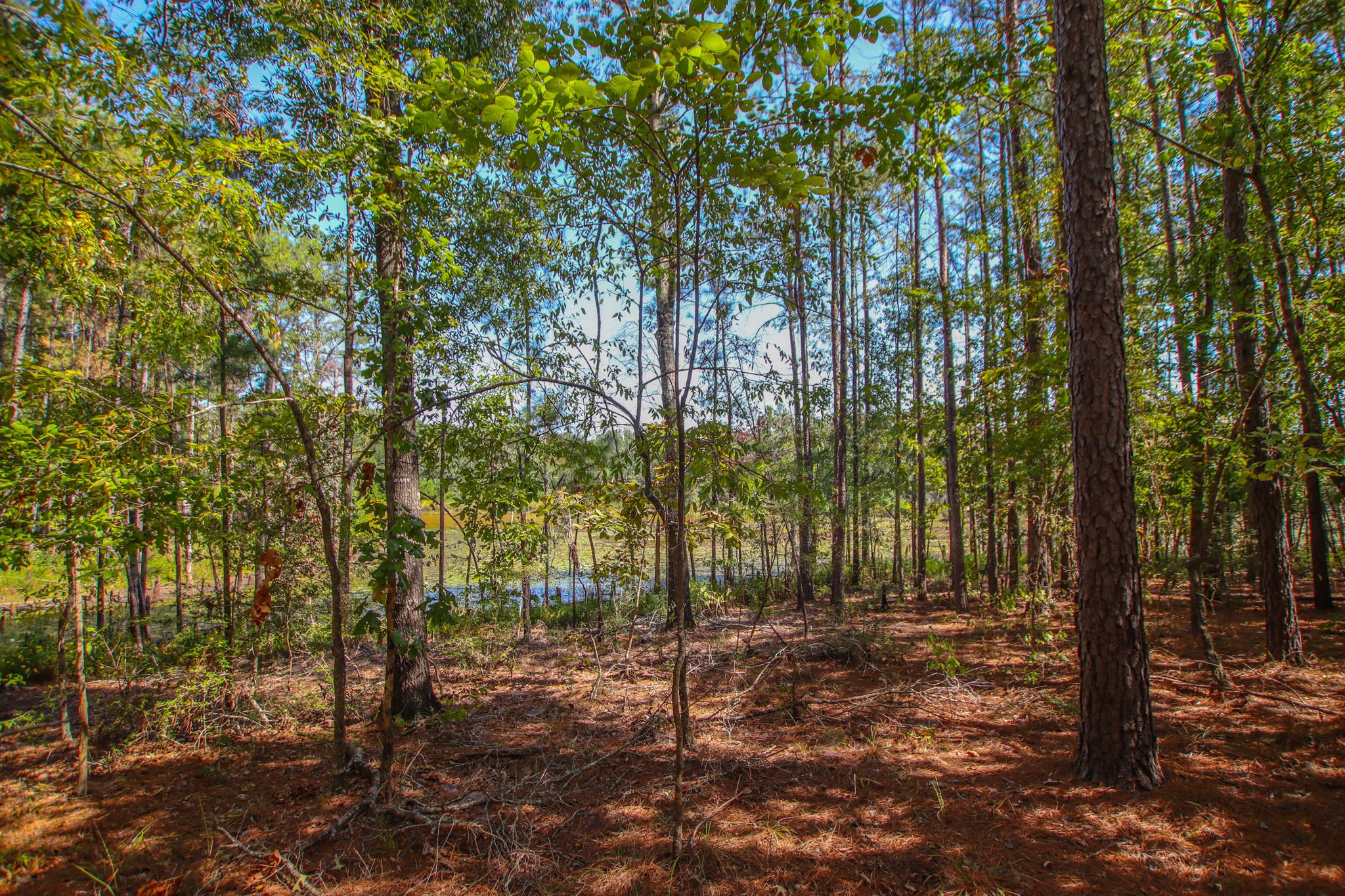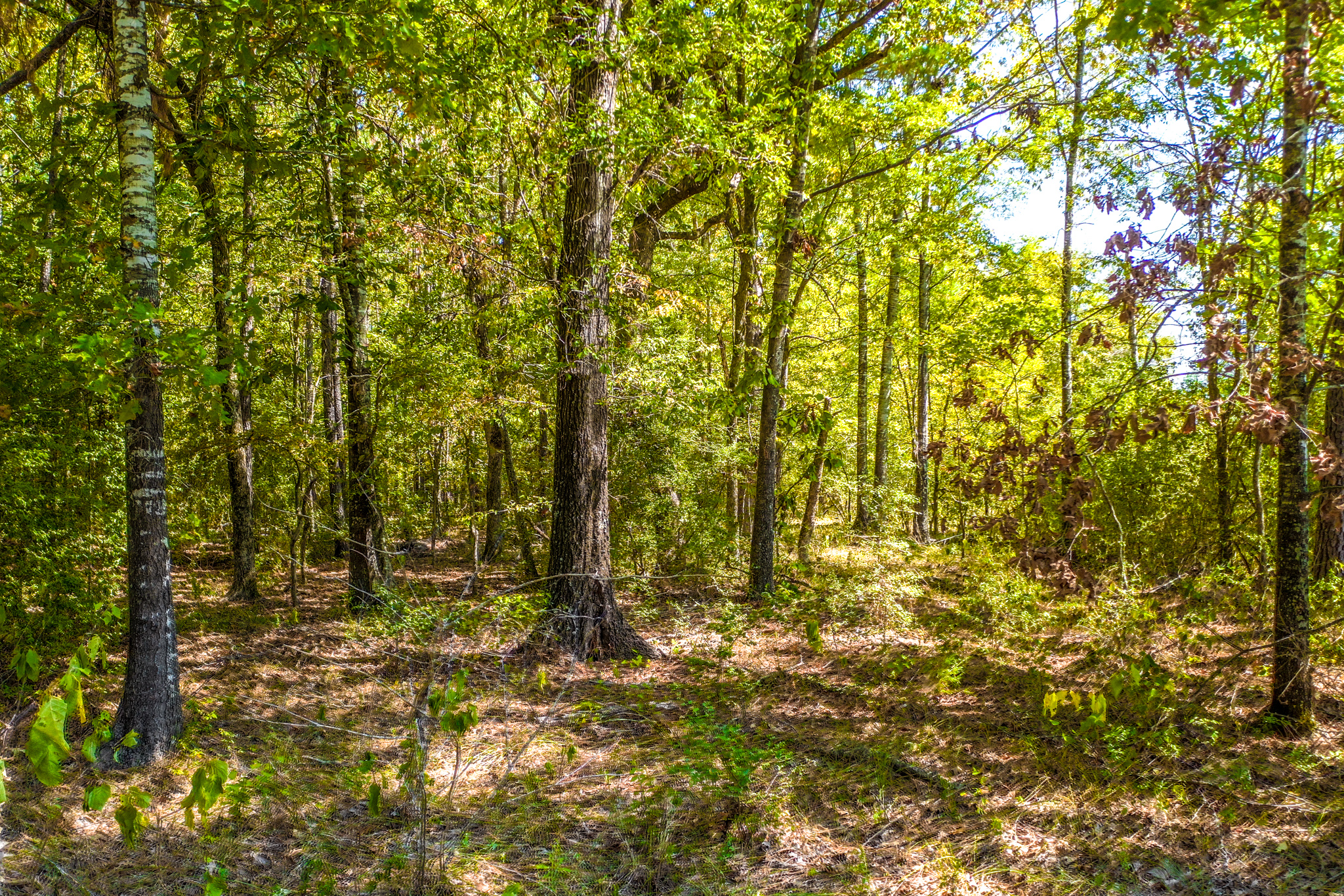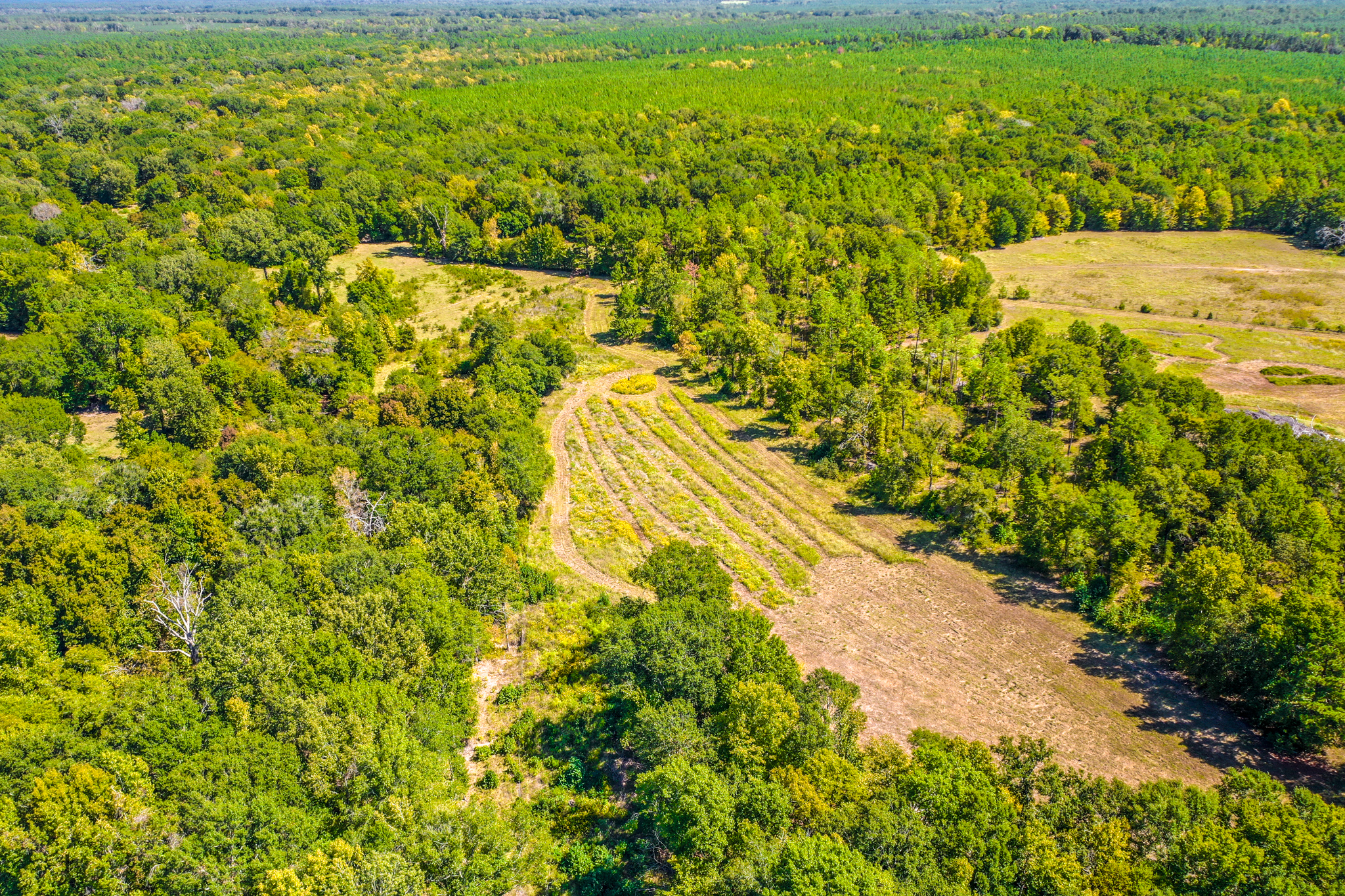 The property is a mixture of native hardwoods and Pine timber with many areas of clean, open understory that offers glimpses of the rolling topography. Elevation on the tract ranges from an approximate low of 330' ASL to an approximate high of 360' ASL, with the property generally sloping downward from the south (along the road frontage) to the north. The NW portion of the property is located within the 100 flood zone. Two creek beds (primarily wet weather creeks) traverse the property, with both draining to Hickory Creek to the north of the tract.
