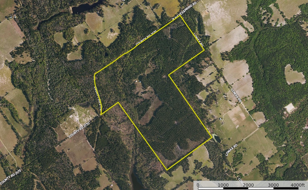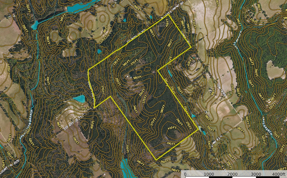 Land Characteristics: The property showcases a dramatic elevation change from about 310 feet to 420 feet above sea level, which adds to its scenic variety and potential for building ponds or water features, using the natural creeks and drainage areas found throughout. Most of the land is covered with 25 to 30-year-old plantation pine trees that have been selectively thinned to promote healthy growth and maintain the natural beauty. The areas near the creeks are filled with a mix of mature hardwood trees, providing rich color and diverse habitats for wildlife.