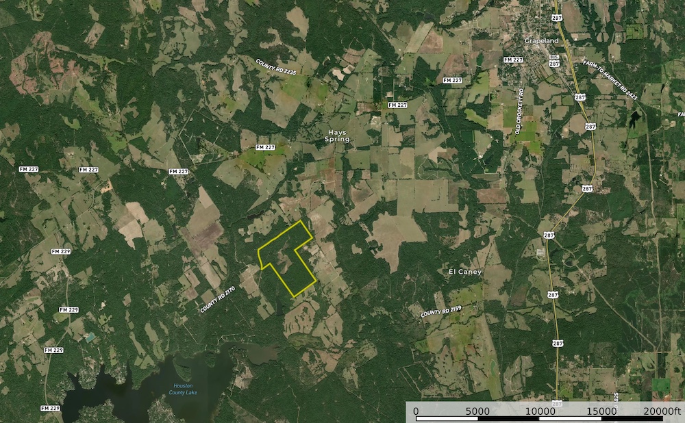 Location: Kreager Ranch is located roughly 4.6 miles west-southwest of Grapeland, along the south side of County Road 2170. Its close proximity to Houston County Lake makes it a great spot for fishing and boating enthusiasts. Despite its remote and private setting, the ranch remains within easy driving distance to local shops, restaurants, and community events, ensuring that essentials and social activities are never too far away.
