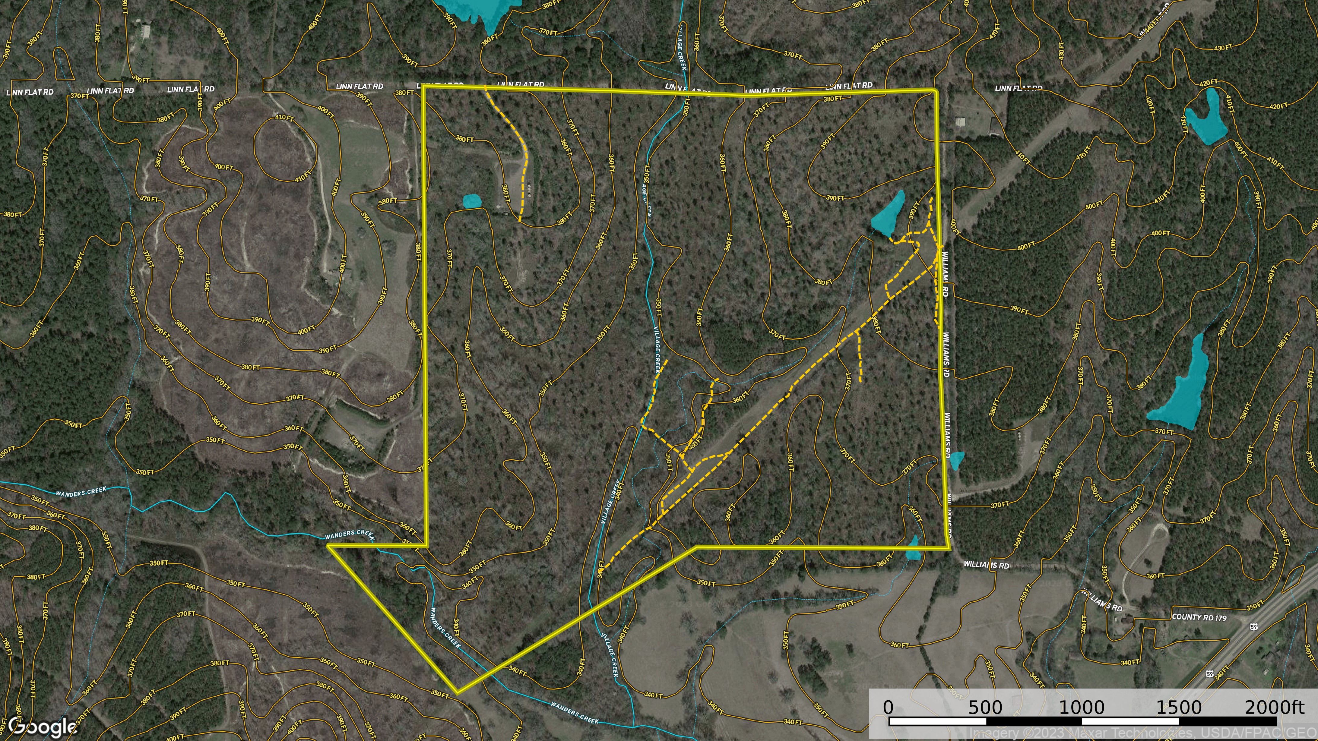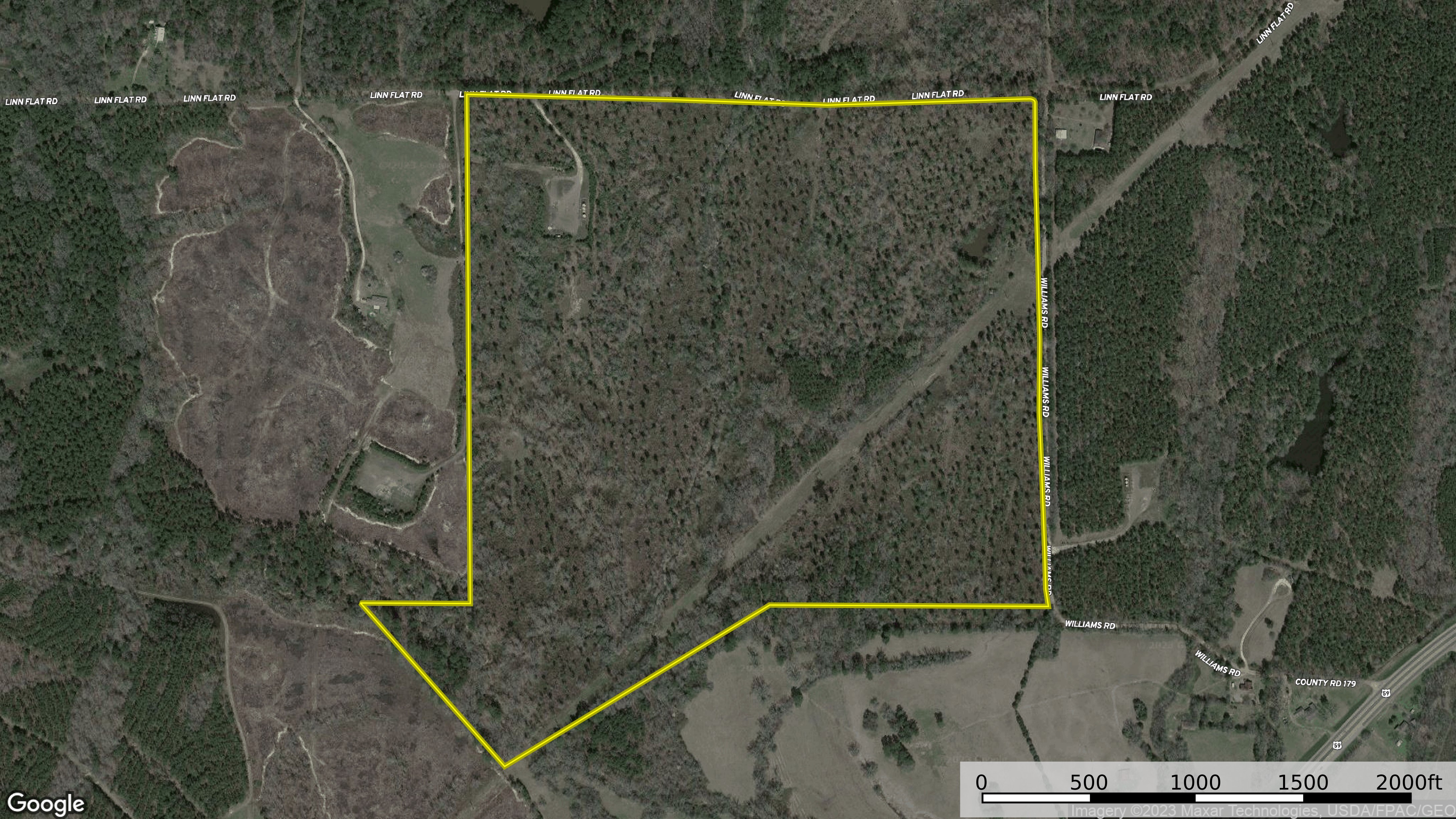 Land Characteristics: The property is slightly irregular in shape with frontage along it’s eastern (Williams Rd) and northern (Linn Flat Rd) boundaries. These are gravel county roads that are a very short distance to US Hwy 59. The tract has rolling terrain with topography that ranges from an approximate low of 340’ ASL to an approximate high of 390’ ASL. Two large creeks traverse the property offering year-round water features and abundant water for the native wildlife. Village Creek runs through the central portion of the property from north to south. Wanders Creek runs through the western extreme of the property and ties into Village Creek south of this property. A small pond is located in the northeastern portion of the property that offers many possibilities. Timber on the property has been thinned multiple times over the years. The result is basically seed tree cutting with an adequate number of mature pine trees remaining that has allowed the tract to naturally regenerate. That process is well underway with a dense stand of young pine, hardwood and other native tree species. The property is currently in a state where it will hold a high number of deer as it has outstanding browse capabilities. An opportunity exists to create a system of trails and small food plots to supplement the native browse which would transform this property into an excellent hunting tract. There is a stand of very good hardwood in the central portion of the property that is basically on the high banks above Village Creek. This stand of mature mixed timber offers clean, open understory with good views of the rolling topography. Other pockets of mature timber are found in the southern and southwestern portion of the property.